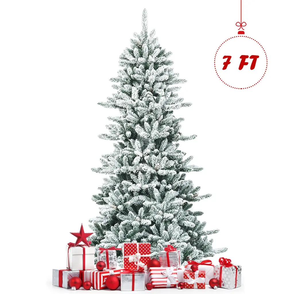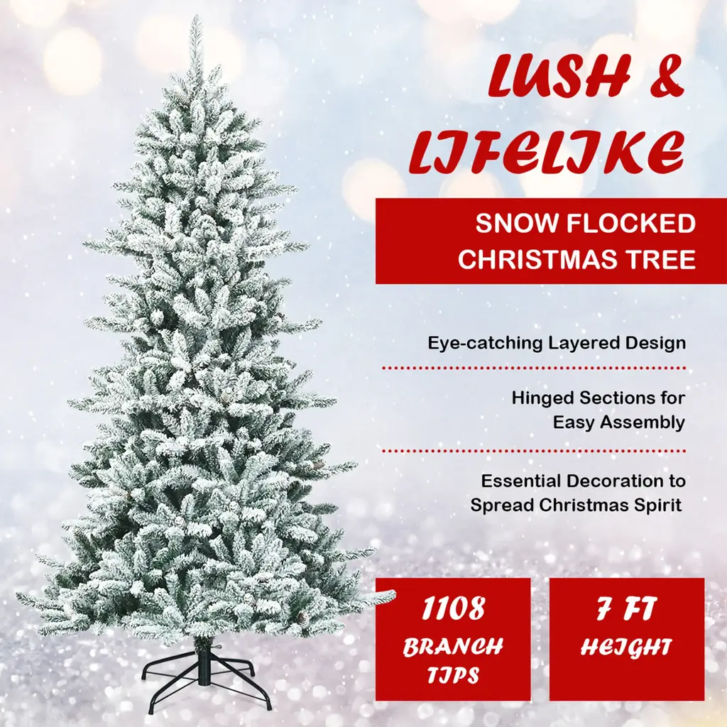 Gymax 7Ft Snow Flocked Christmas Tree Hinged Fir Tree W/ Pine Cones - See Details - Green - 7 Foot