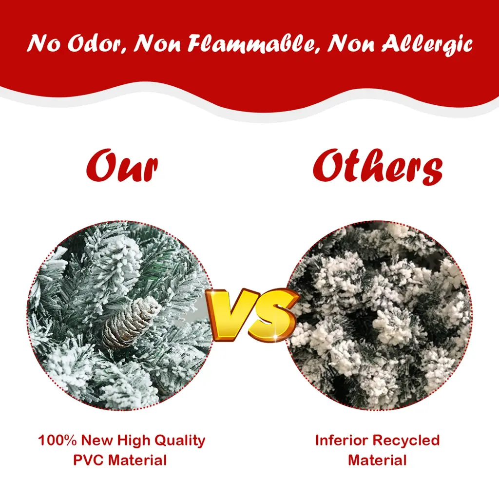 Decorate your home with our snow flocked Christmas tree to enjoy unique winter wonderland and embrace the warm festival feeling! This 7 ft artificial tree is designed with hinged structure to make the assemble easy. You can feel the coming of the festival quickly. Made of odorless PVC material, the tree is environmental and non-flammable for a long lifespan. Sturdy metal stand will offer good support to keep the tree upright. Moreover, with 1108 branch tips, it give you a full and realistic look. The snow flocked appearance makes it an eye-catching addition anywhere.Features:Sturdy and foldable metal stand to ensure strong support for the tree Environmental-friendly PVC material, fire-resistant and non-allergenic 3 tree trunks with hinged branches for quick assembly and easy storageColor: Green Material: PVC, Iron Height: 7 ft Base Width: 3.9 ft Net Weight: 20.5 lbs Number of tips:1108 tips Package Includes: 1 X Snow Flocked Christmas Tree 1 X Metal Stand 1 X Instruction