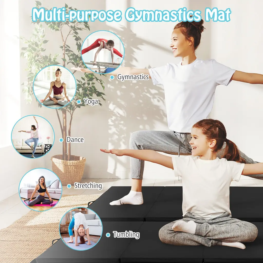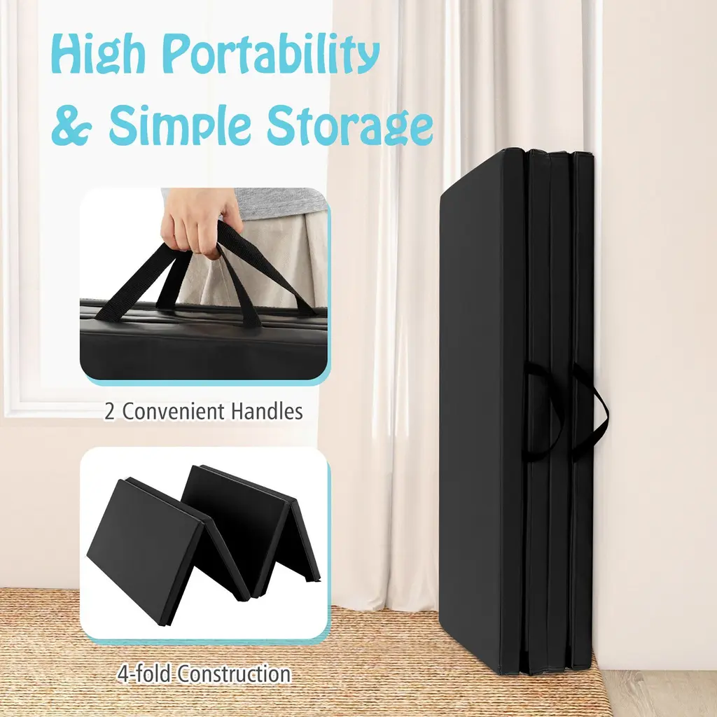 This gymnastics mat will be a great partner for various exercises! The high density and thickened EPE foam padding effectively reduces impact on joint and protects users from injuries during exercise. The PU leather cover is smooth and tear resistant. And its waterproof surface is effortless to clean after using. The while exercise mat can be folded in 4 for convenient storage and carry. Besides, users can connect multiple mats together by the hook and loop fasteners.Features:Convenient to store with 4-fold construction Effortless to carry around with handles Filled with thick and high density EPE foam Covered with smooth and Sturdy PU leather cover Easy to clean with a waterproof surface Allows you to attach more mats together with hoop and loop fastener Suitable for many sports, such as yoga, stretching, martial arts and moreColor: Black Material: PU, EPE Foam Product Dimensions: 8' x 4' x 2'' (L x W x H) Folded Dimensions: 4' x 2' x 8'' (L x W x H) Weight Capacity: 200 lbs Net Weight: 12 lbs Package Includes: 1 x Folding Gymnastics Mat