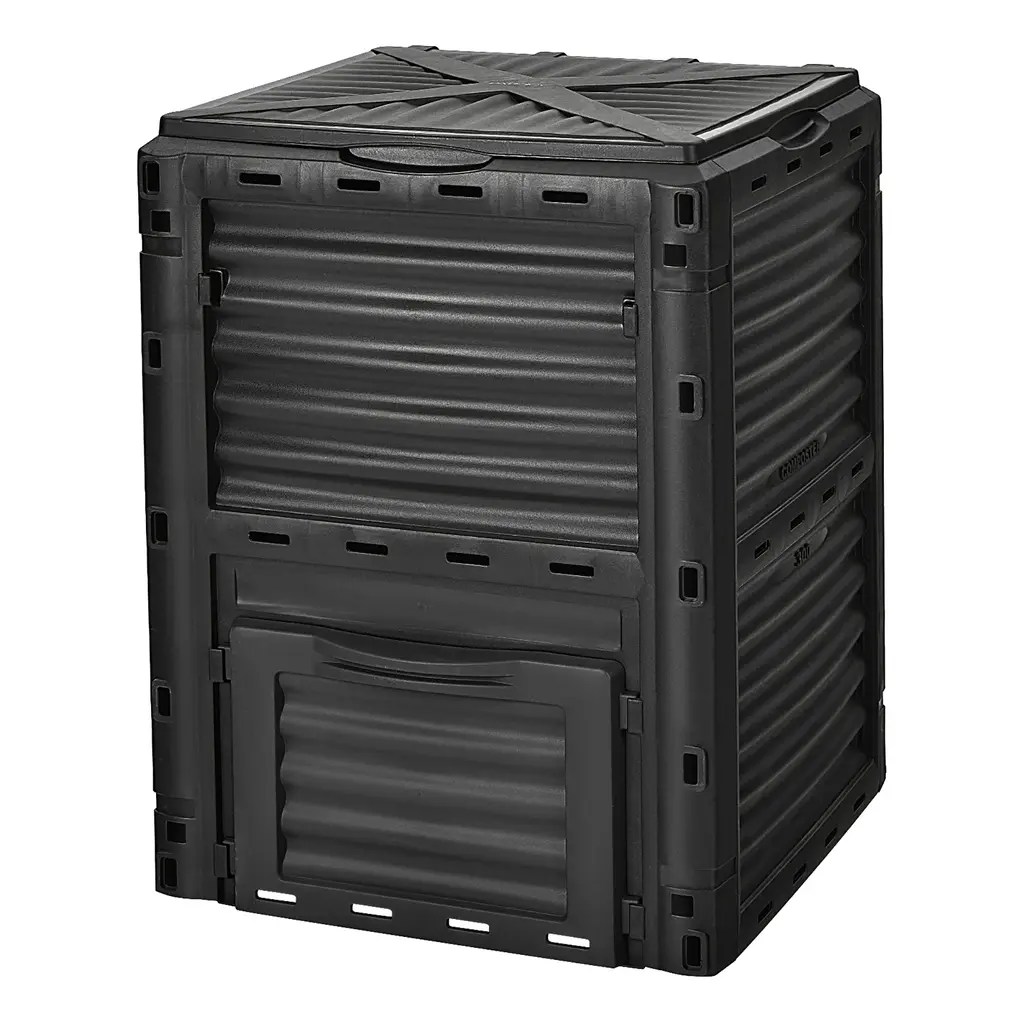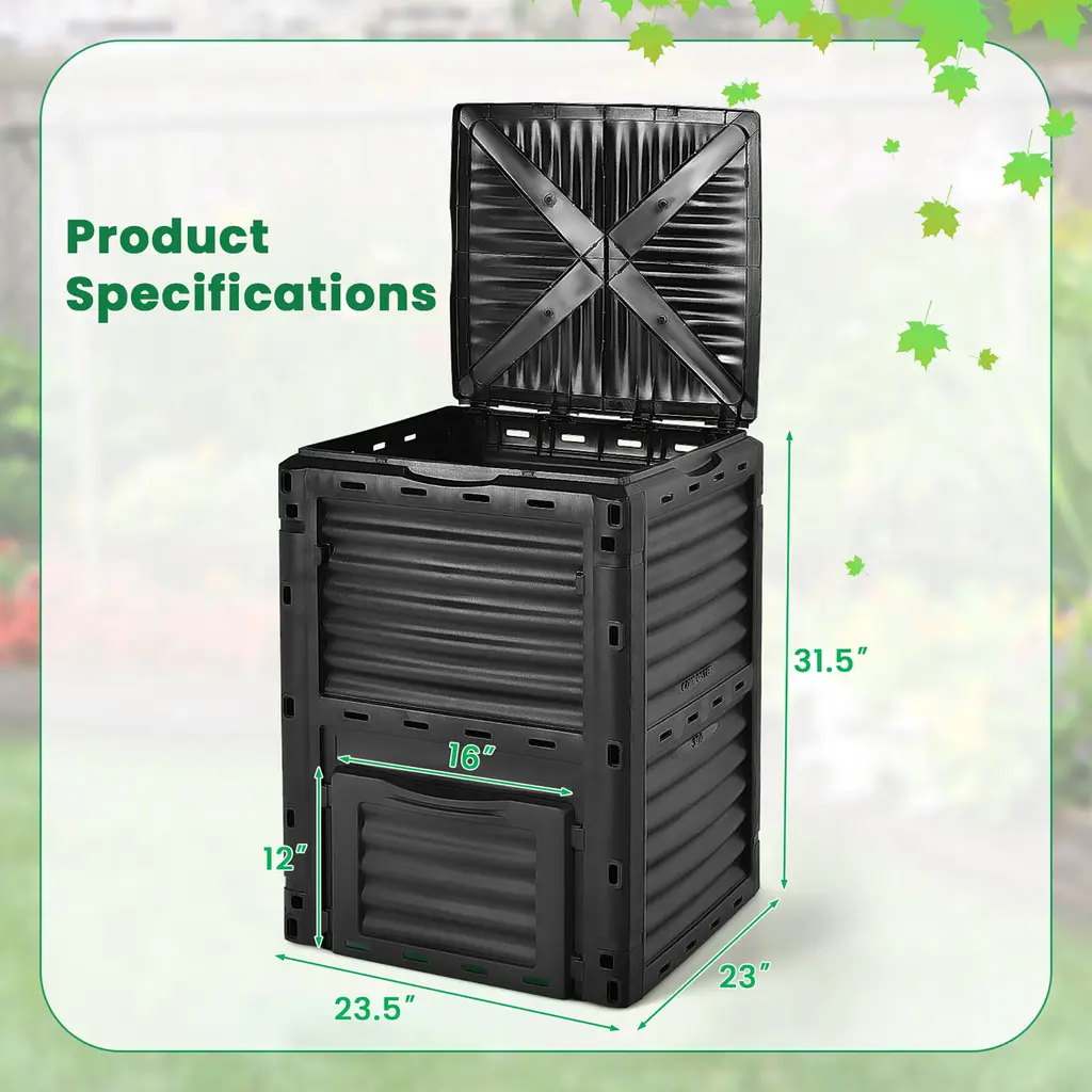Composting at home is a great way to produce rich soil fertilizers, and our compost bin will help you grow a beautiful garden. With 80-gallon inner capacity, this composter is an effective way to create soil nutrition. All-round air vents enhance aerobic fermentation, promoting the wasting scrap transformation. And sturdy PP frame makes it weather resistant and Sturdy for outdoor use. Besides, the humanized design allows you to open the large lid and dump clippings effectively. The bottom sliding door makes you to take out the fertilizer easily. A complete composting process will be finished in 6-8 weeks under warm temperature, which will be shorter in hot weather.Features:80-gallon capacity provides ample composting space Large open lid for effortless garden clipping dumping Bottom exit door for convenient fertilizers taking out All-round air vents promote aerobic fermentation BPA-free PP ensures long time outdoor useColor: Black Material: PP Product Dimension: 23.5'' x 23'' x 32'' (LxWxH) Inner Capacity: 80 Gallons Net Weight: 11 lbs Package includes: 1 x Compost Bin 1 x User's Instruction