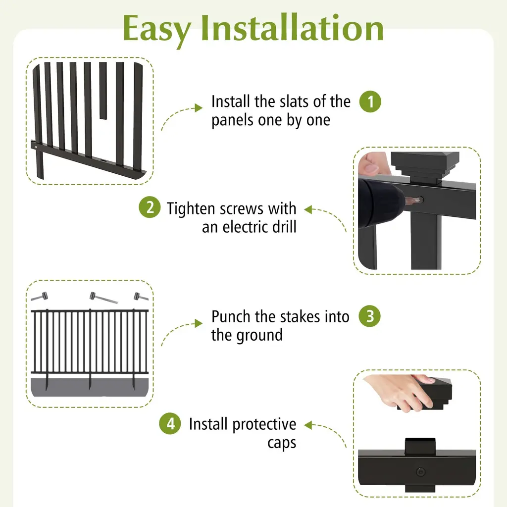 Perfect for outdoor use, the decorative fence's flexible joint system permits both horizontal and vertical configurations. Made of premium PVC, the 80''L x 39''H slatted protective panels promise durability and easy maintenance. Experience hassle-free installation with our no-dig method, ideal for soft soils, with ground stakes easily positioned at a 12'' depth. It also ensures excellent stability on different surfaces. The vinyl picket fence's elegant, slatted design and refined caps add a touch of sophistication to any outdoor space, doubling as a secure haven for children and pets in gardens, poolsides, and porches.Features:Selected PVC is all-weather, sun-proof, and waterproof Supported by firm ground stakes for optimal stability Flexible joints allow for horizontal splicing and vertical splicingColor: Black Material: PVC Overall Height: 51'' Dimensions of Each Panel: 80'' x 39'' (L x H) Inserting Depth: 12'' Spacing Between Adjacent Stakes: 36.5'' Net Weight: 24.5 lbs Package Includes: 2 x Fence Panels 1 x User Guide