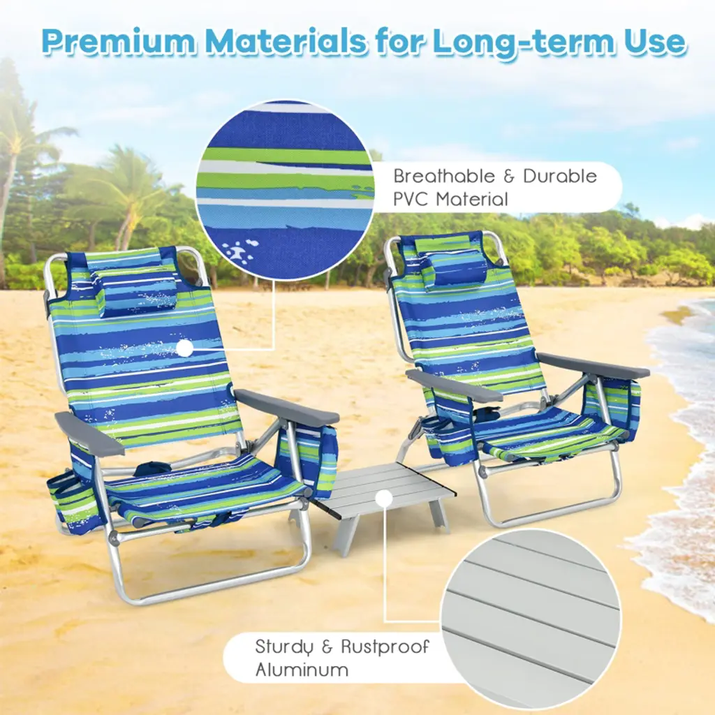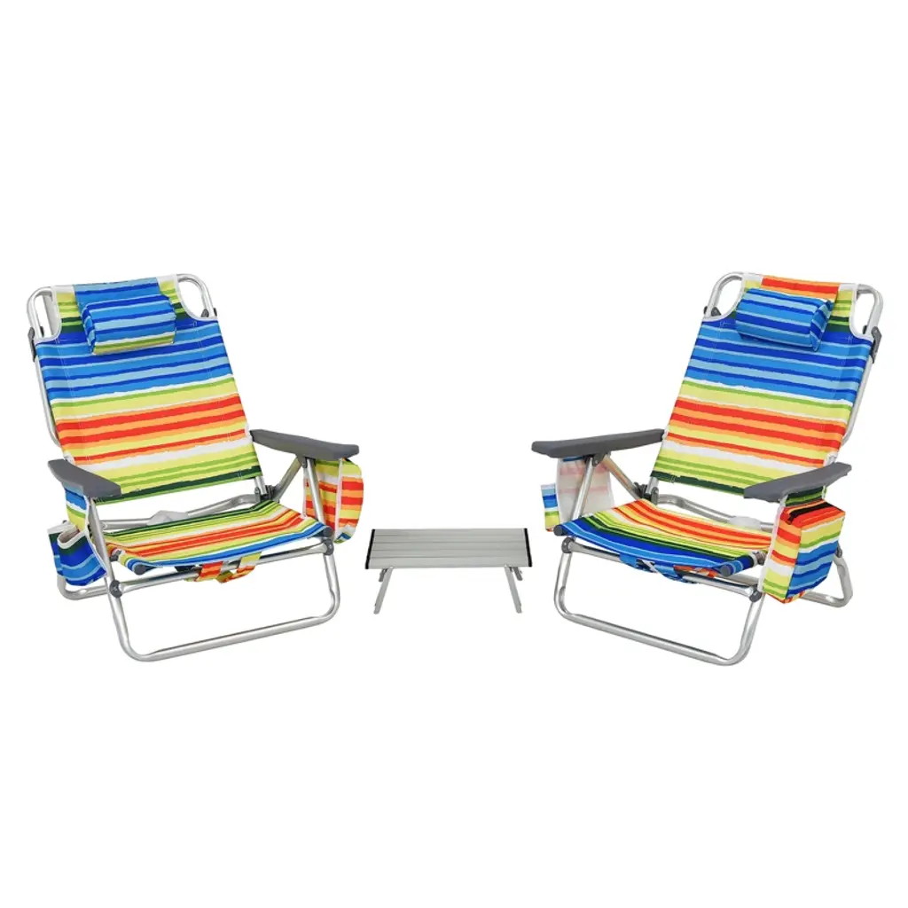 This practical chair set is the ideal companion for your outdoor adventures! Including 2 beach chairs and a side table, it creates a cozy spot for relaxing outdoors- perfect for camping, fishing, or family gatherings. Built with a strong steel frame, it offers lasting stability, while 5 recline settings cater to various comfort preferences. The plush headrest and wide armrests provide extra support and relaxation. Lightweight and foldable, the set is easy to carry and store when not in use. Added conveniences include cup holders, an ice pack, a storage bag, and a towel rack. The compact folding table offers additional space for snacks and drinks, making this 3-piece set perfect for enjoying seaside views and cherished moments with friends and family.FeaturesFolding side table offers ample space for drinks, snacks, and other items Robust aluminum construction paired with tough PVC guarantees lasting performance Cushioned headrest and broad armrests improve overall comfort while seated 5-position recline adapts to various relaxing or activity needs Collapsible form enables compact storage and effortless transport Equipped with drink holders, a detachable ice pack, storage pouch, and towel bar Padded shoulder straps ensure easy and comfortable carrying Great for outdoor and leisure uses such as camping, fishing, or beach lounging Easy-clean smooth surface resists stains and requires minimal upkeep No installation required for time-savingColor: Blue, Multi-Colour, Yellow Material: Aluminum, PP, PVC, Sponge Overall Dimension of Each Chair: 23.5"-40" x 27" x 11"-33"(L x W x H) Folding Size of Each Chair: 26" x 4.5" x 29.5" (L x W x H) Overall Dimension of Table: 16" x 11.5" x 5"(L x W x H) Folding Size of Table: 16" x 2.5" x 2.5"(L x W x H) Net Weight: 17.5lbs Weight Capacity of Table: 11lbs Weight Capacity of Each Chair: 300lbs Package includes: 2 x Beach Chair 1 x Side Table 1 x User Guide