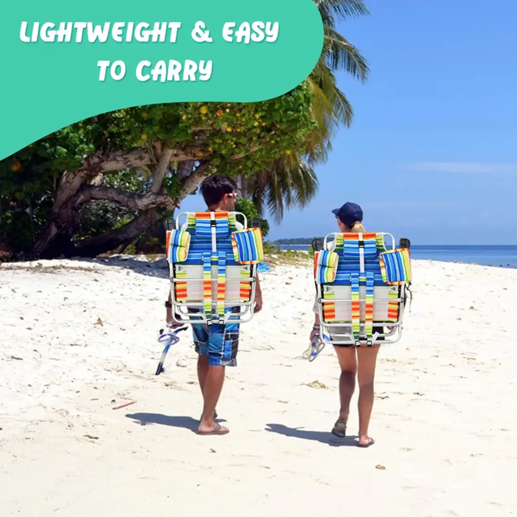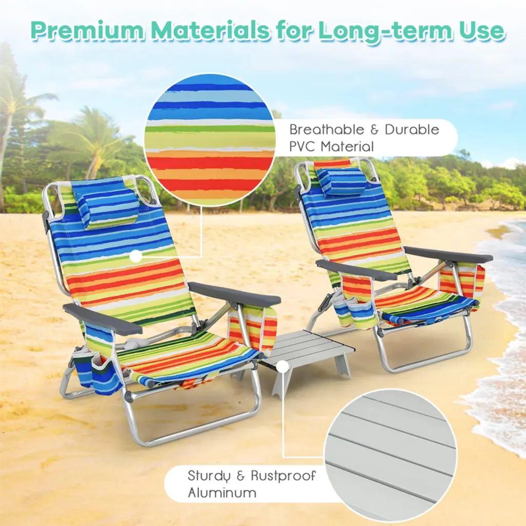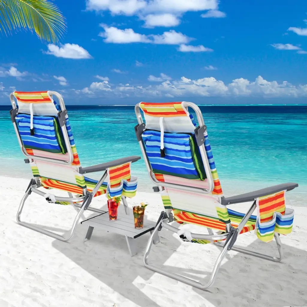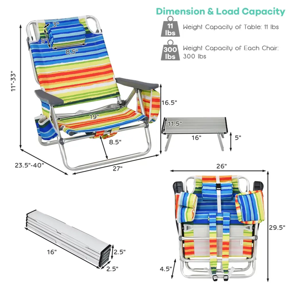 This practical chair set is the ideal companion for your outdoor adventures! Including 2 beach chairs and a side table, it creates a cozy spot for relaxing outdoors- perfect for camping, fishing, or family gatherings. Built with a strong steel frame, it offers lasting stability, while 5 recline settings cater to various comfort preferences. The plush headrest and wide armrests provide extra support and relaxation. Lightweight and foldable, the set is easy to carry and store when not in use. Added conveniences include cup holders, an ice pack, a storage bag, and a towel rack. The compact folding table offers additional space for snacks and drinks, making this 3-piece set perfect for enjoying seaside views and cherished moments with friends and family.FeaturesFolding side table offers ample space for drinks, snacks, and other items Robust aluminum construction paired with tough PVC guarantees lasting performance Cushioned headrest and broad armrests improve overall comfort while seated 5-position recline adapts to various relaxing or activity needs Collapsible form enables compact storage and effortless transport Equipped with drink holders, a detachable ice pack, storage pouch, and towel bar Padded shoulder straps ensure easy and comfortable carrying Great for outdoor and leisure uses such as camping, fishing, or beach lounging Easy-clean smooth surface resists stains and requires minimal upkeep No installation required for time-savingColor: Blue, Multi-Colour, Yellow Material: Aluminum, PP, PVC, Sponge Overall Dimension of Each Chair: 23.5"-40" x 27" x 11"-33"(L x W x H) Folding Size of Each Chair: 26" x 4.5" x 29.5" (L x W x H) Overall Dimension of Table: 16" x 11.5" x 5"(L x W x H) Folding Size of Table: 16" x 2.5" x 2.5"(L x W x H) Net Weight: 17.5lbs Weight Capacity of Table: 11lbs Weight Capacity of Each Chair: 300lbs Package includes: 2 x Beach Chair 1 x Side Table 1 x User Guide