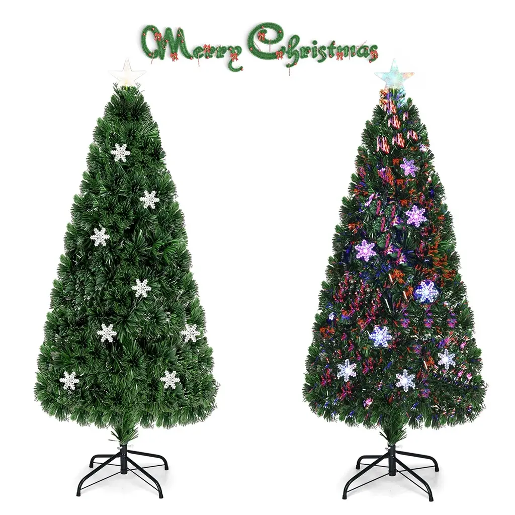 Add some festive cheer to your home or office with our 6' Fiber Optic Christmas Tree. Each tree comes with 220 tips and needles made of PVC material, which makes the tree looks real and thicker. The pre-lit LED Lights can present different colors. Features snowflake decoration, attractive and beautiful. A metal base is included to support the tree in a upright position. This tree is sure to add more cheer to your holiday.Features:220 tips, appears fresh and thick likes a real tree Needles made of PVC material, dense and realistic Comes with 28 Pre-installed LED lights,bright and energy-saving LED lights can present 7 different colors Top star and snowflake decoration Sturdy metal stand, support tree in a upright position Simply assemble requiredDelivery Includes: 1 x Christmas tree 1 x Stand 1 x Adapter 1 x Instruction Color: Green Tree Material: PVC Overall Size: 2.7' x 6' (Diameter x H) Voltage: Input: 120V, AC, 60HZ Output: 12V, AC, 500mA Adapter : UL-certified Tips Number: 220 pieces LED Lights Number: 28 pieces Weight: About 11 Lbs