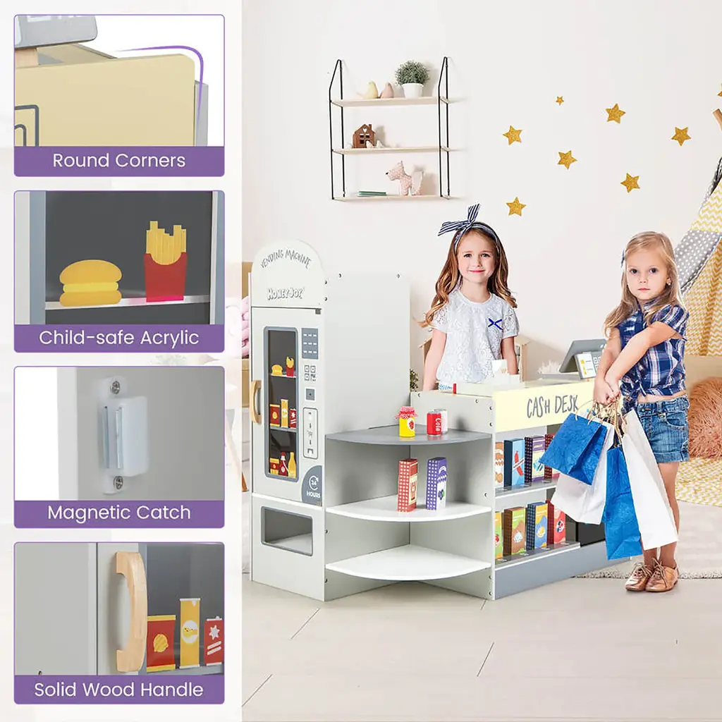 Let kids have fun with our wooden grocery store playset!!! The side vending machine allows kids to pretend to place snacks & beverages, buy different items or take out the item. Toddlers are also allowed to write prices on the chalkboard. Or they can also simulate checking out or shopping with a wooden POS machine and a credit to learn more about money. Besides, there are 3 open shelves and 2 display racks to store different stuff, helping kids develop a good habit of organizing. Plus, all corners and edges are rounded and burr-free.Features:Round corners and burr-free edges for safe touch 3 open shelves and 2 display racks for enough storage Extra chalkboard for kids to write or draw as they likeColor: Gray Material: MDF + Solid Wood Overall Dimension: 35'' x 22.5'' x 34.5''(L x W x H) Size of the Vending Machine: 12'' x 12''(L x W) Countertop Height: 19.5'' Countertop Length: 23.5'' Applicable Age: 3-8 Years Old Applicable Kids Height: 27.5''-47'' Net Weight: 36.5 lbs Package includes: 1 x Kids Grocery Store Playset 2 x Canned Drinks 1 x Strawberry Jam 1 x Banana Juice 1 x Blueberry Juice 1 x Raspberry Juice 1 x Mango Juice 1 x Coconut Juice 1 x Biscuit 1 x Sweet 1 x Doughnut 1 x Sausage 1 x French Fries 1 x Instruction