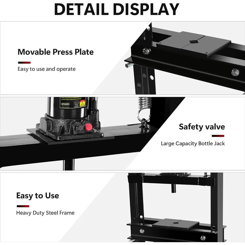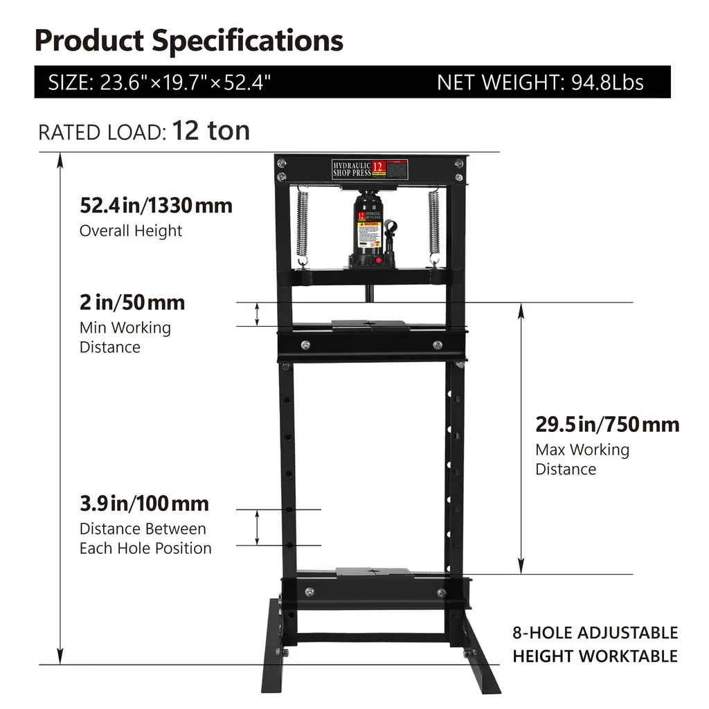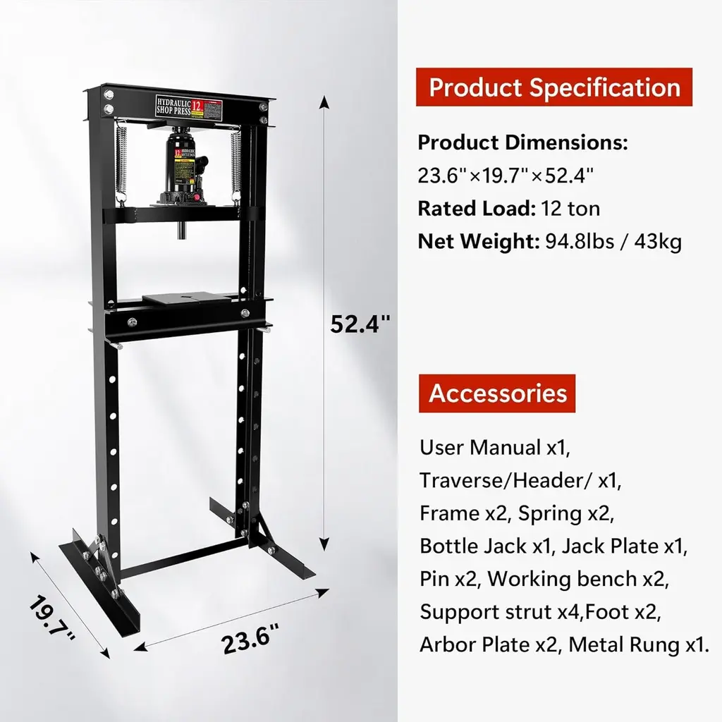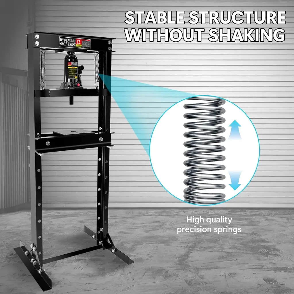 H-Frame Garage Floor Adjustable Hydraulic Shop Press With Stamping Plates - 12 Ton-Black
