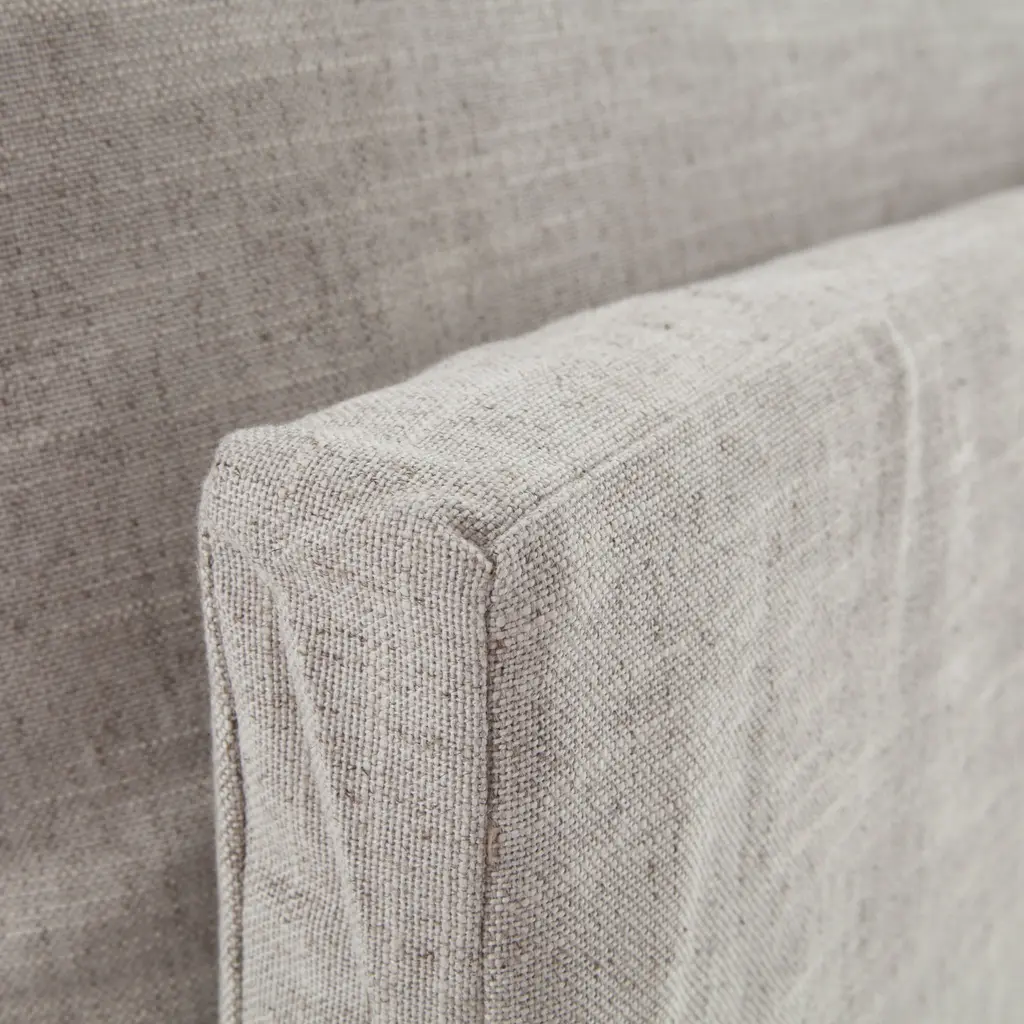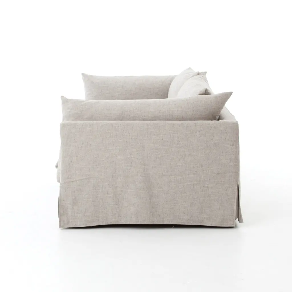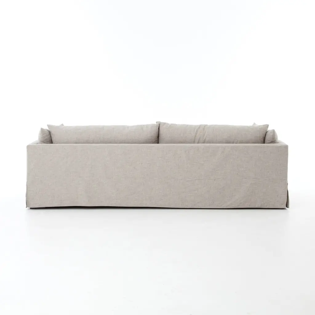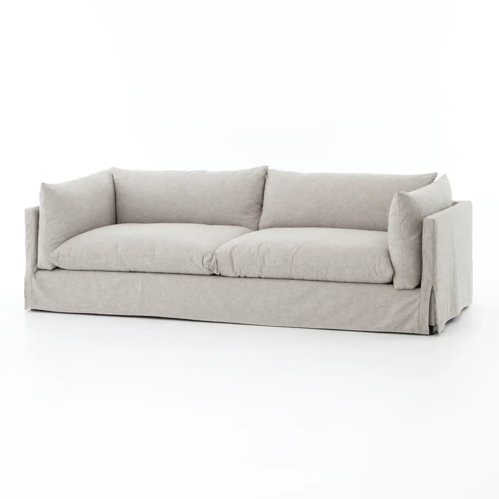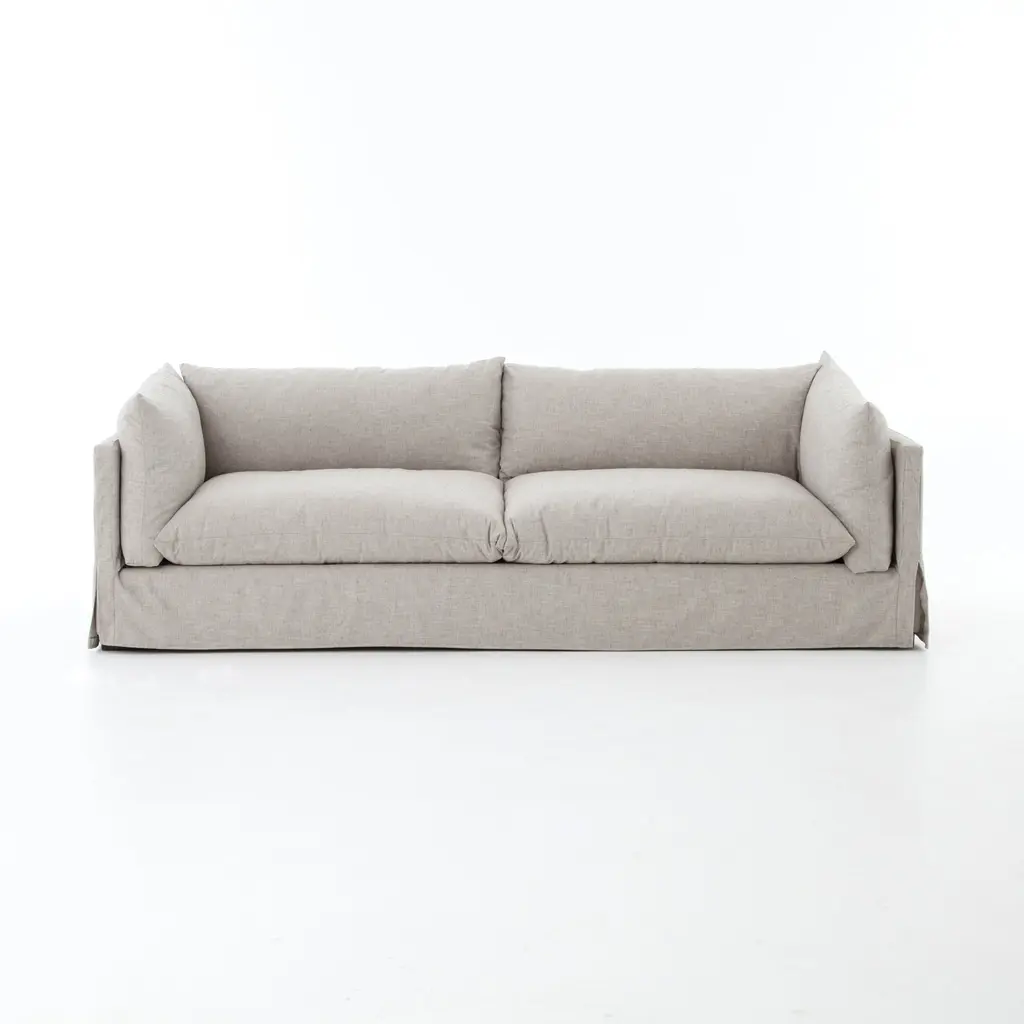 Loungey, slipcovered sofa is made for modern living. Shelter arms and pillow-inspired cushions are covered in extraordinarily comfortable, durable, and stain-resistant Crypton fabric.Dimensions: 96" W x 40" D x 30" HArm Height from Floor: 25.5"Arm Height from Seat: 14.25"Seat Height: 17.75"Clearance from Floor: 2"Materials: 53% Poly/35% Rayon/12% Flax, Banak WoodColors: Valley Nimbus, EspressoWeight: 157 lbsCollections: Atelier