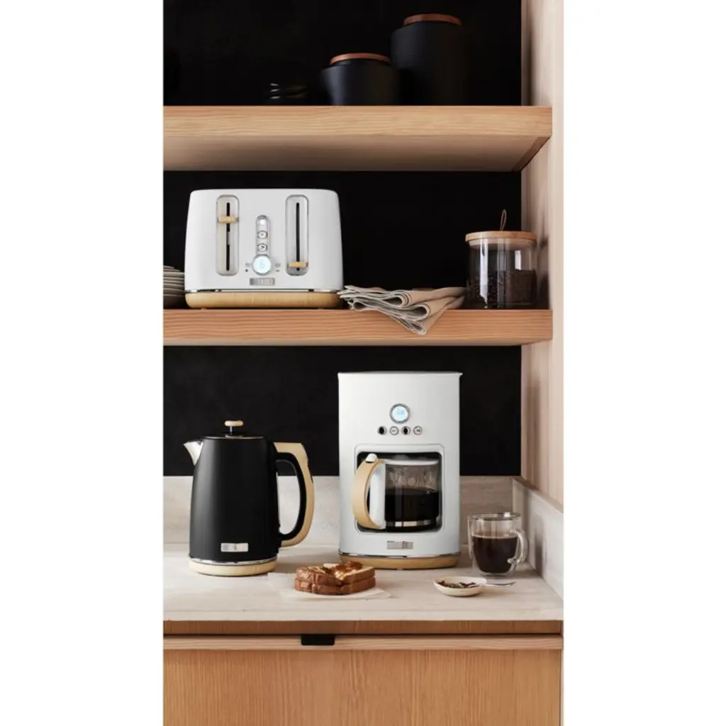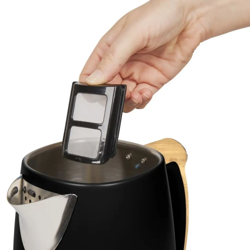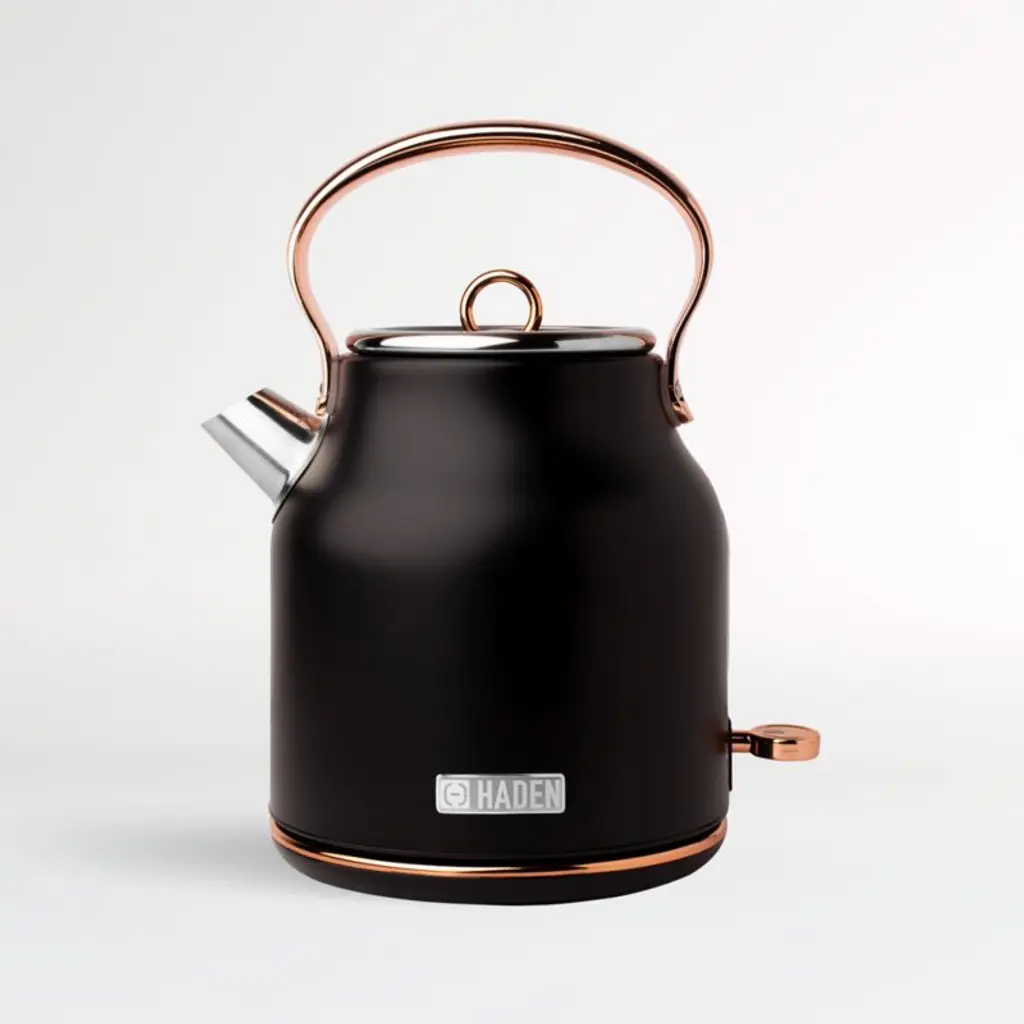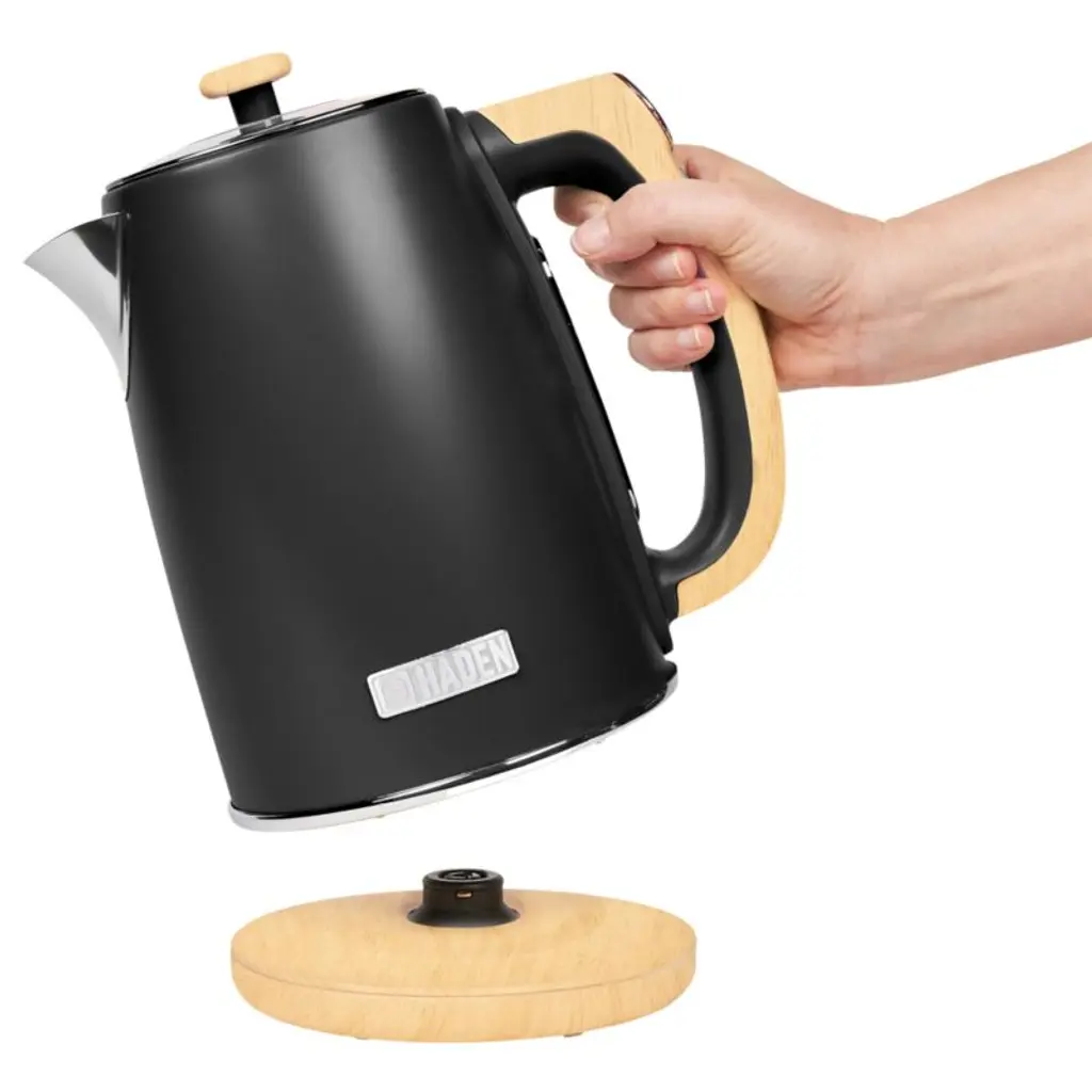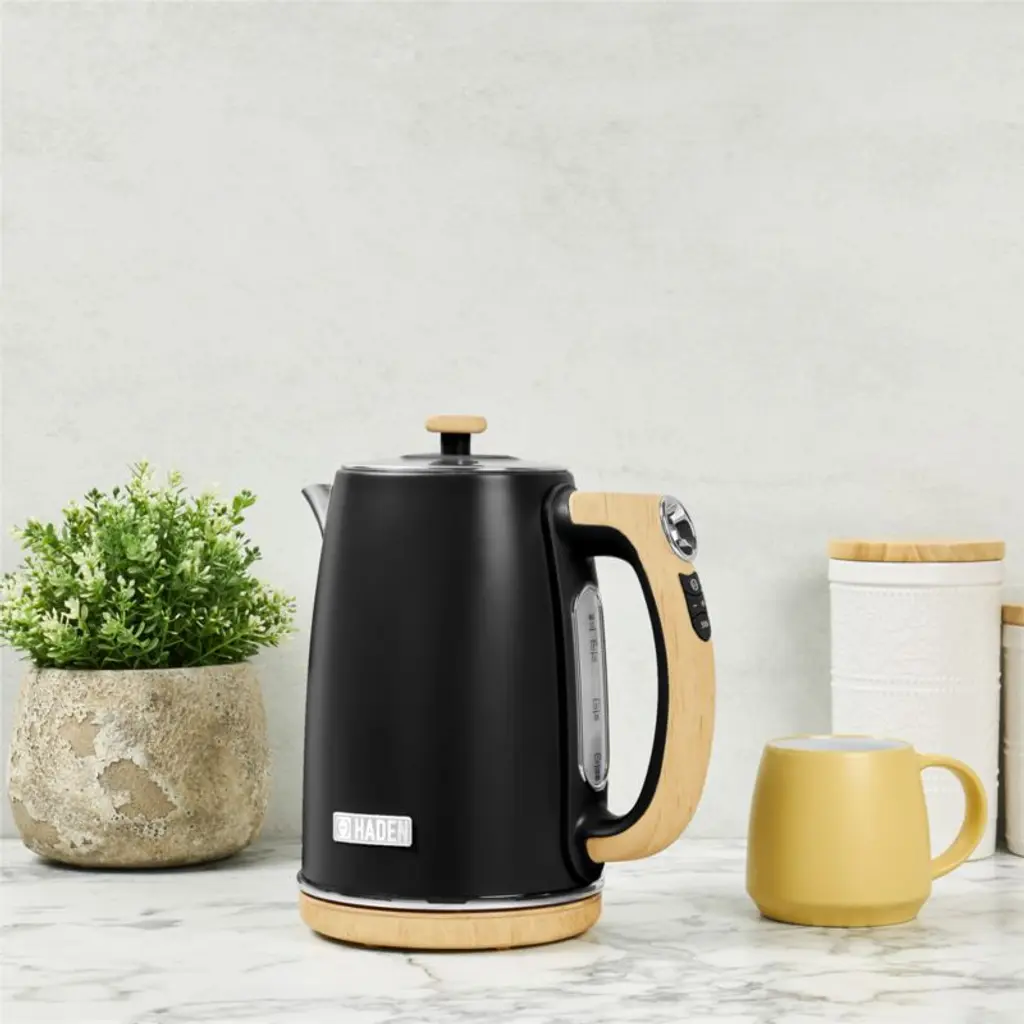 HADEN brings warmth and charm to a kitchen essential with faux bois detailing, clean curves, stainless steel accents and a modern matte black finish. The electric kettle features six preset temperatures for brewing pour-over or French press coffee and various types of tea. The kettle holds water at your desired temperature for up to 45 minutes. Pair the matte black kettle with the matching appliances for a coordinated kitchen with plenty of retro style.