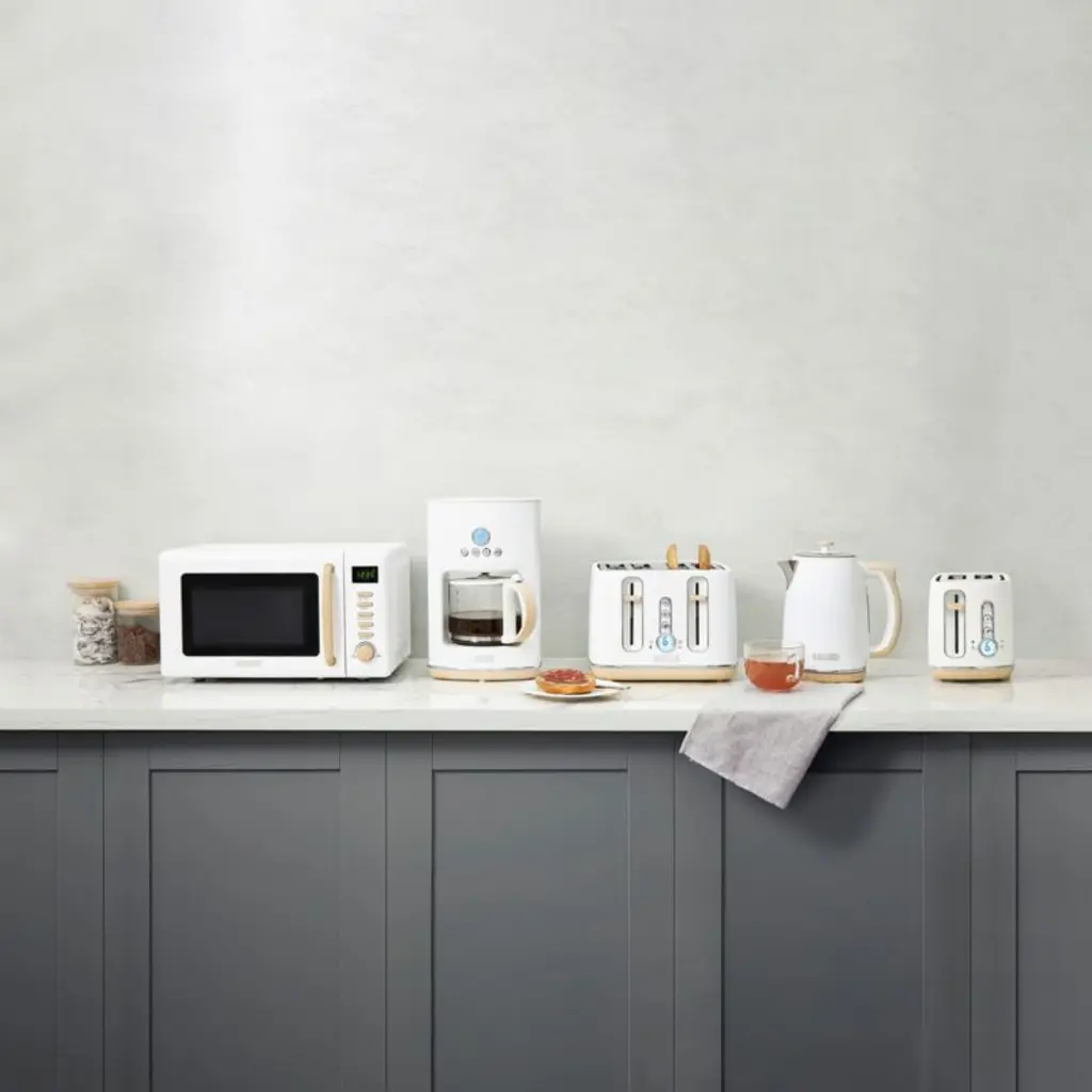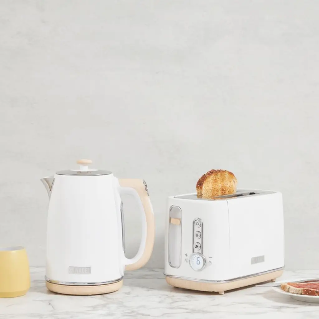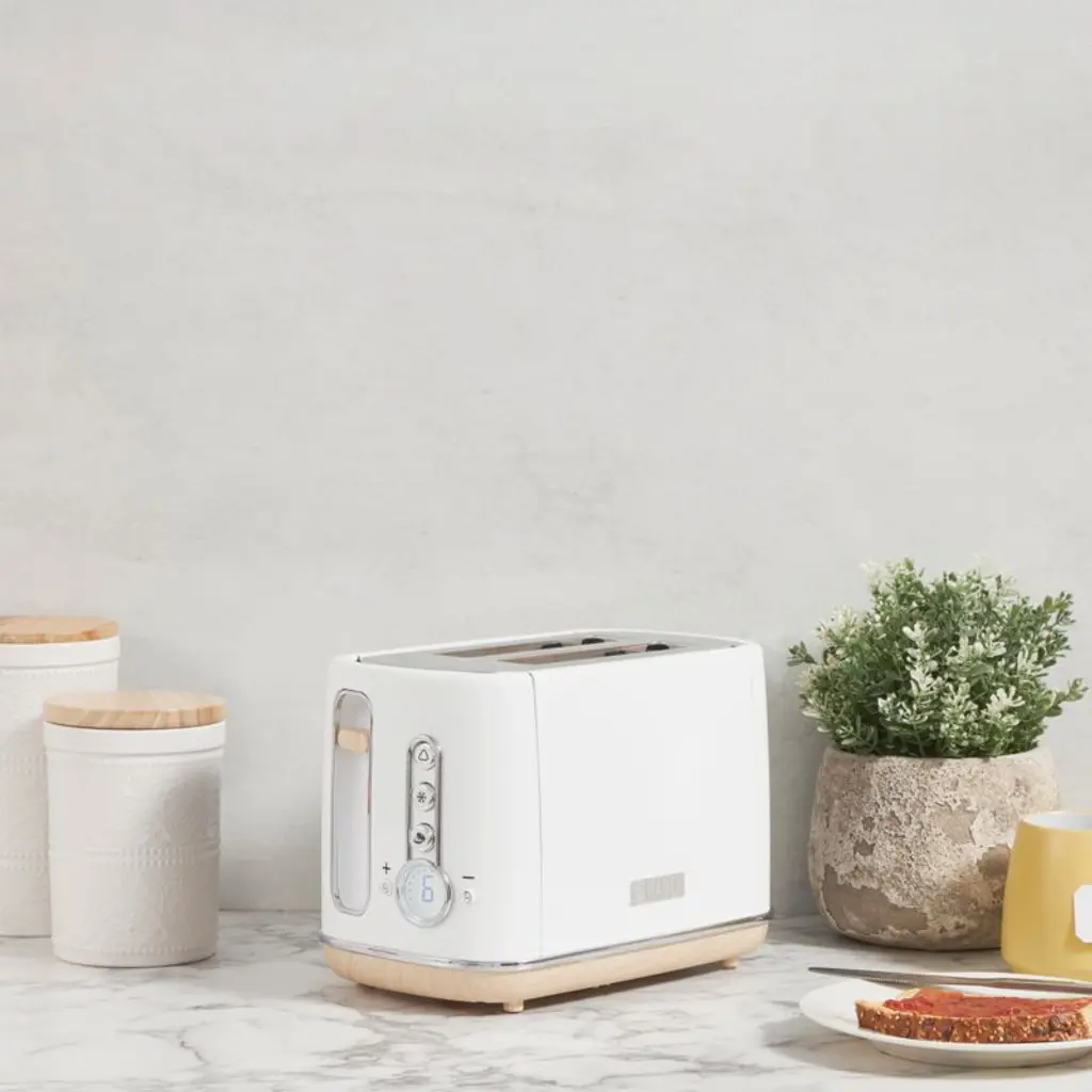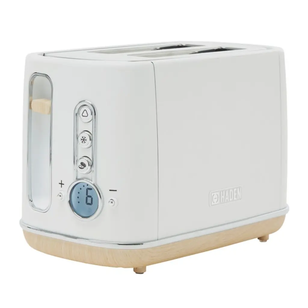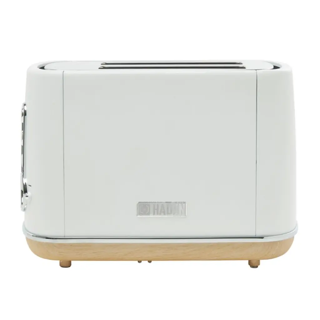 Haden brings warmth and charm to a kitchen essential with a matte white finish, faux bois detailing, clean curves and stainless steel accents. The two-slice toaster features extra-wide slots, six digital browning controls, a removable crumb tray for easy cleaning and convenient cancel, bagel and defrost settings. Pair our exclusive toaster with the matching electric kettle, drip coffee maker and microwave for a coordinated kitchen with plenty of retro style.