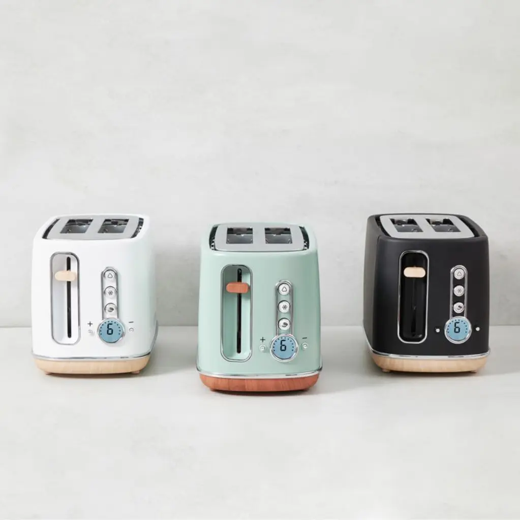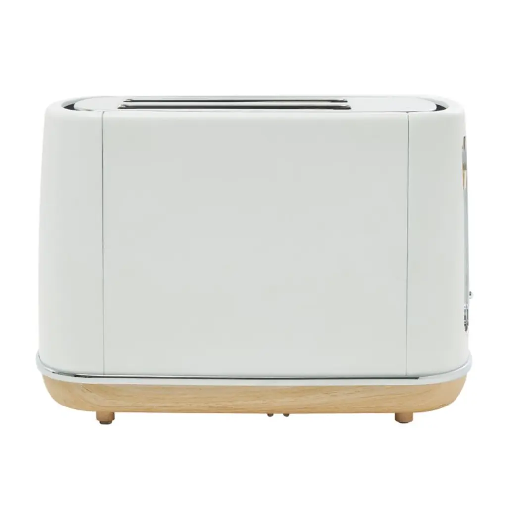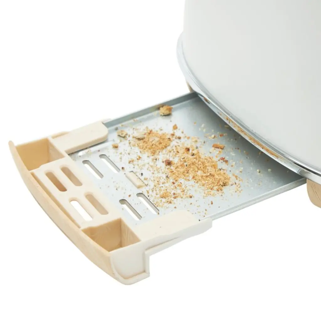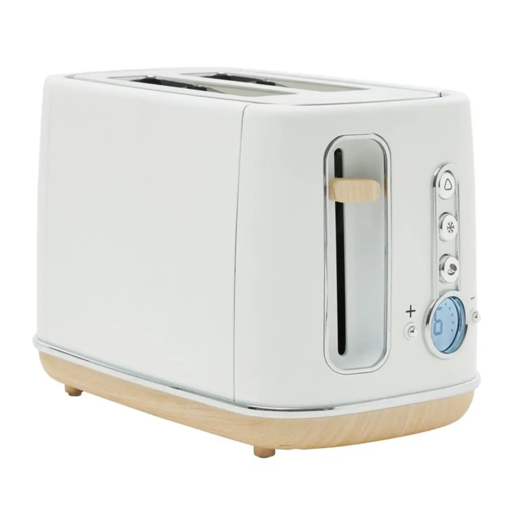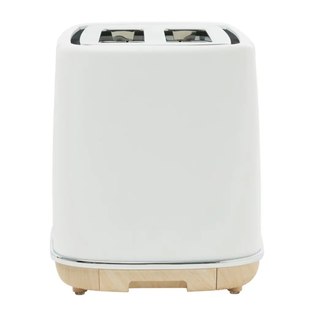 Haden brings warmth and charm to a kitchen essential with a matte white finish, faux bois detailing, clean curves and stainless steel accents. The two-slice toaster features extra-wide slots, six digital browning controls, a removable crumb tray for easy cleaning and convenient cancel, bagel and defrost settings. Pair our exclusive toaster with the matching electric kettle, drip coffee maker and microwave for a coordinated kitchen with plenty of retro style.