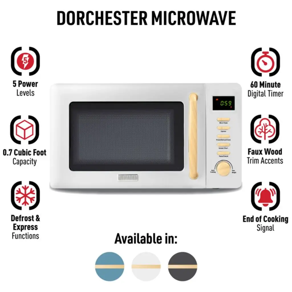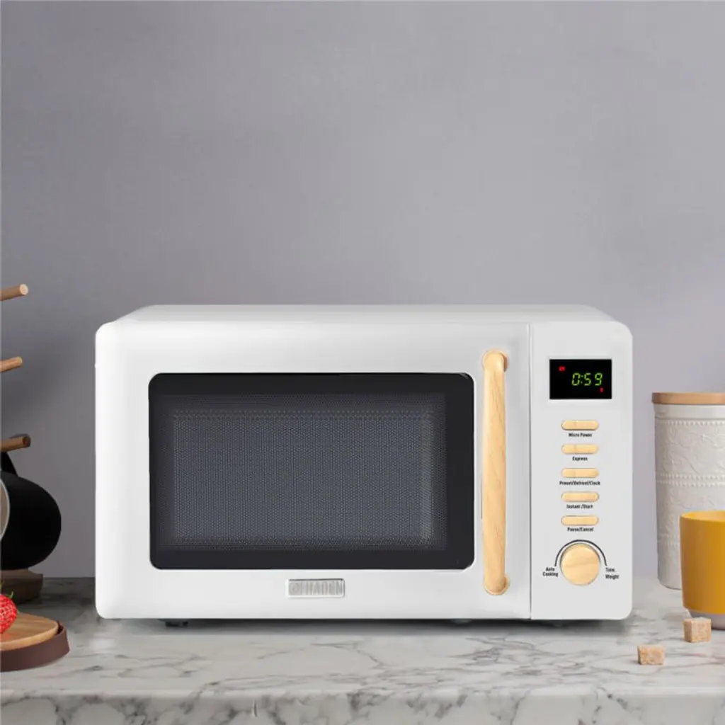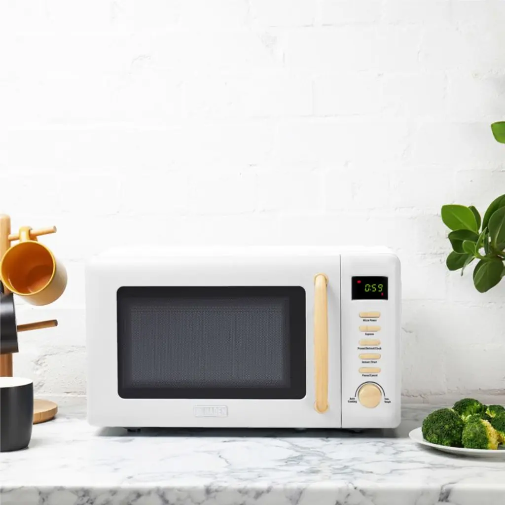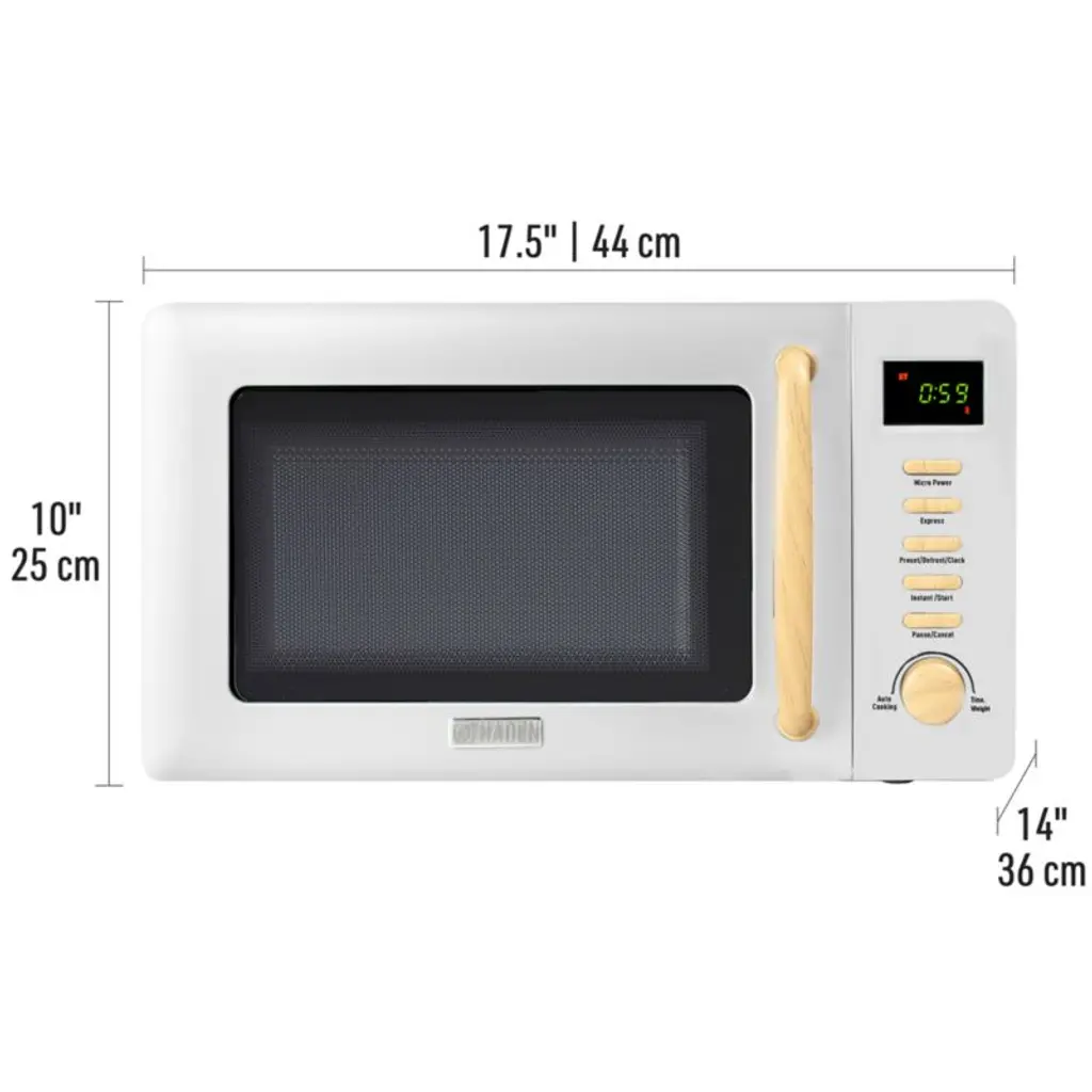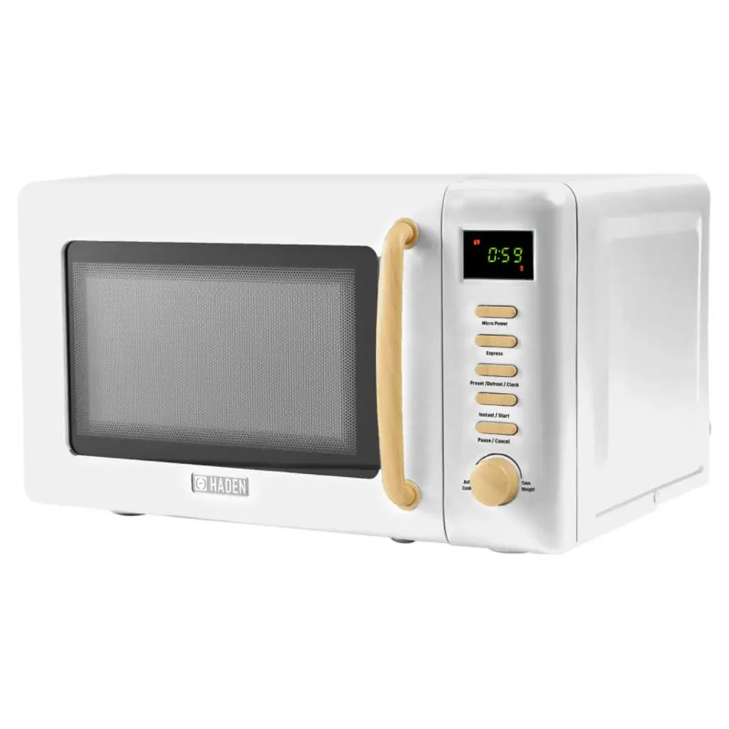 HADEN brings warmth and charm to an essential kitchen appliance with a matte white finish, faux bois detailing, clean curves and stainless steel accents. This microwave offers five power levels and eight cooking menus. Pair the matte white microwave with the matching electric kettle, drip coffee maker and toaster for a coordinated kitchen with plenty of retro style.