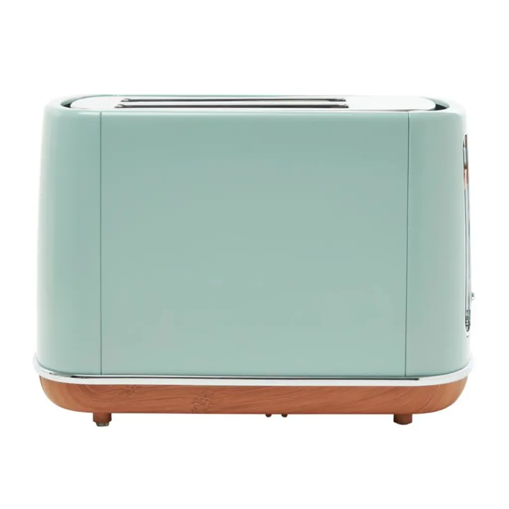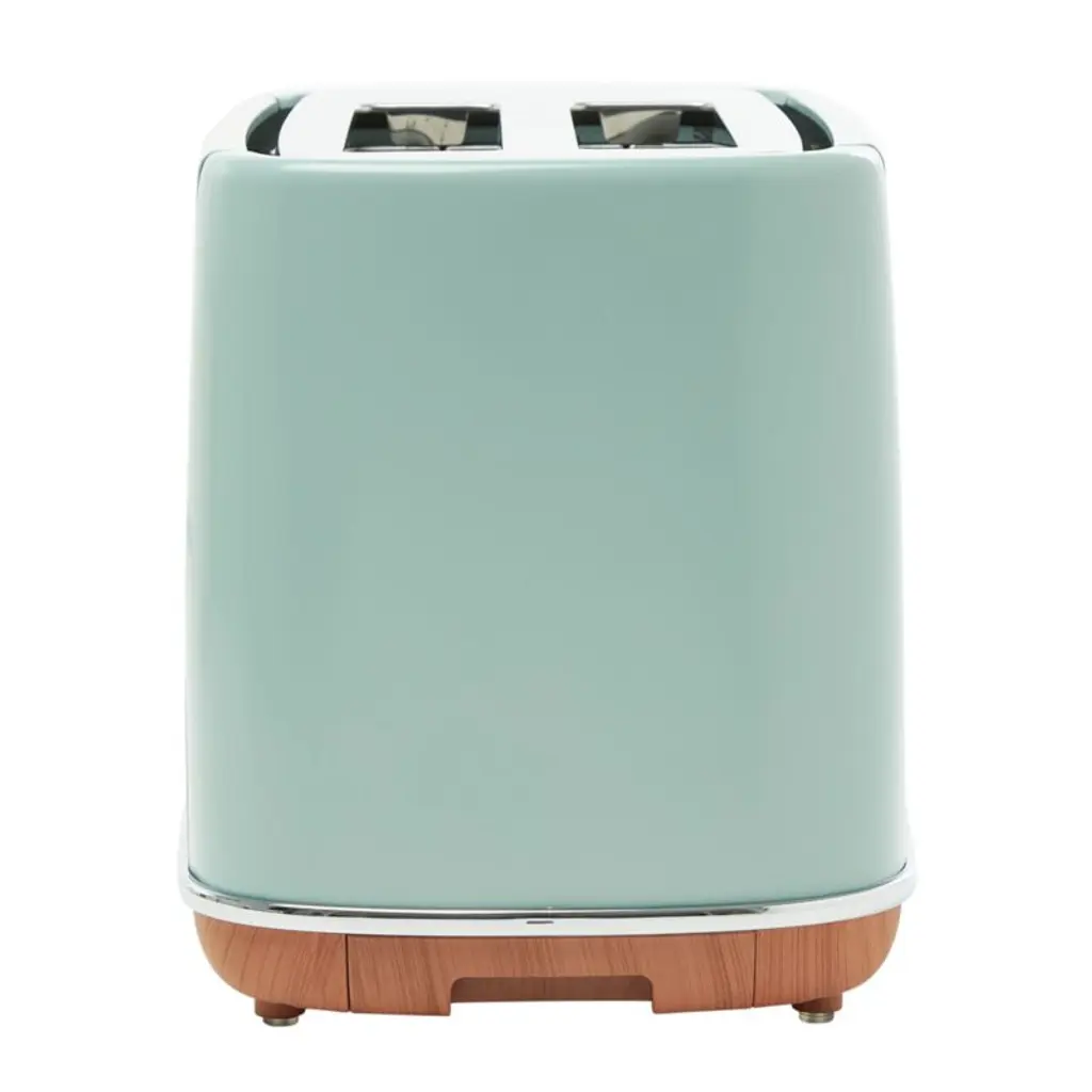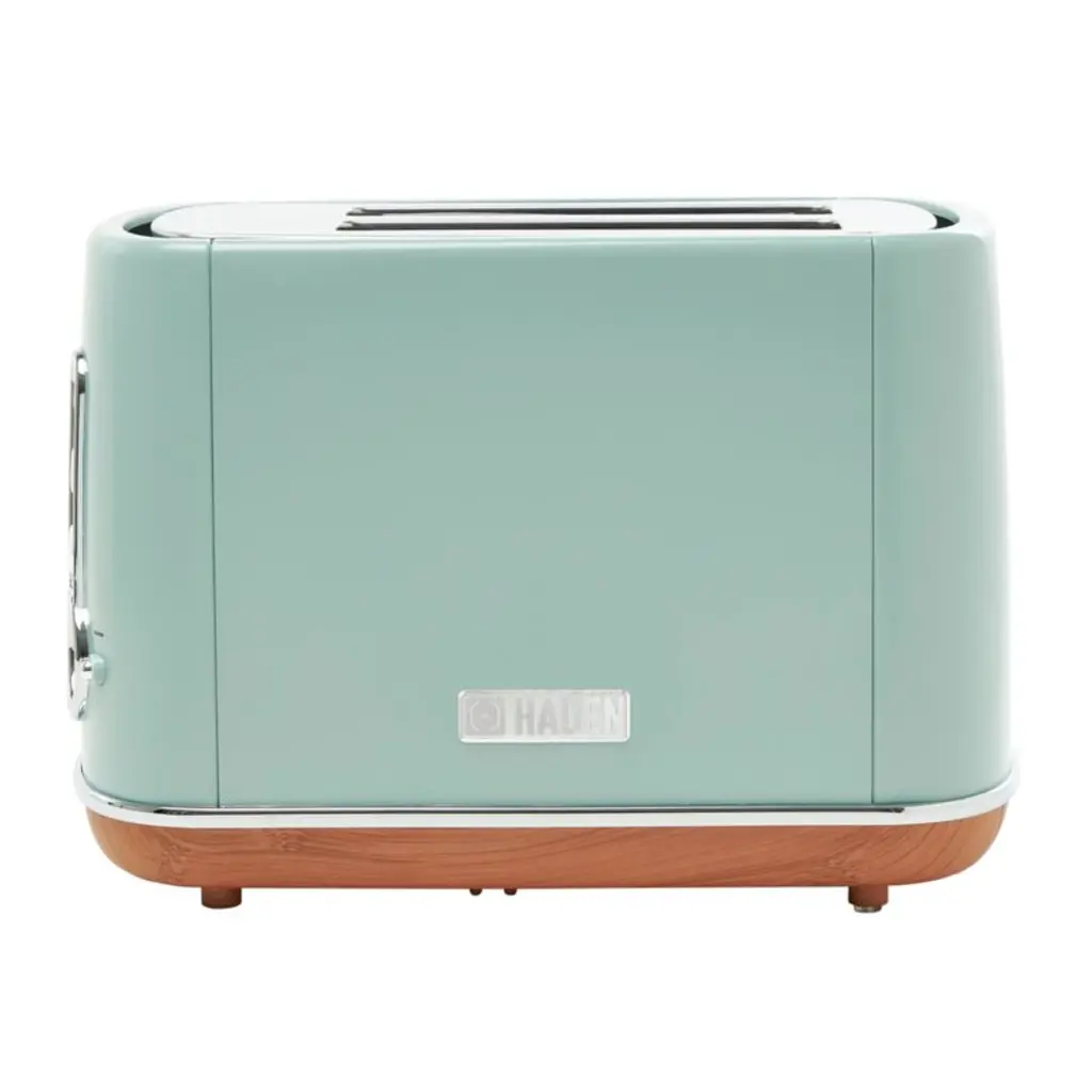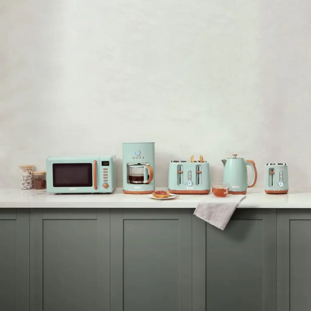 Taking inspiration from the British countryside, Haden's pioneering use of color looks to the green ramparts of Maiden Castle near Dorchester for the soft sage exterior of this striking toaster. Accented with faux bois and stainless steel, our exclusive two-slice toaster offers six browning options to suit your preferences. Pair with the matching electric kettle, drip coffee maker and microwave for a coordinated kitchen with plenty of retro style.