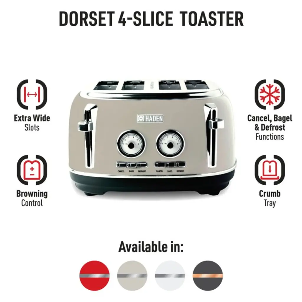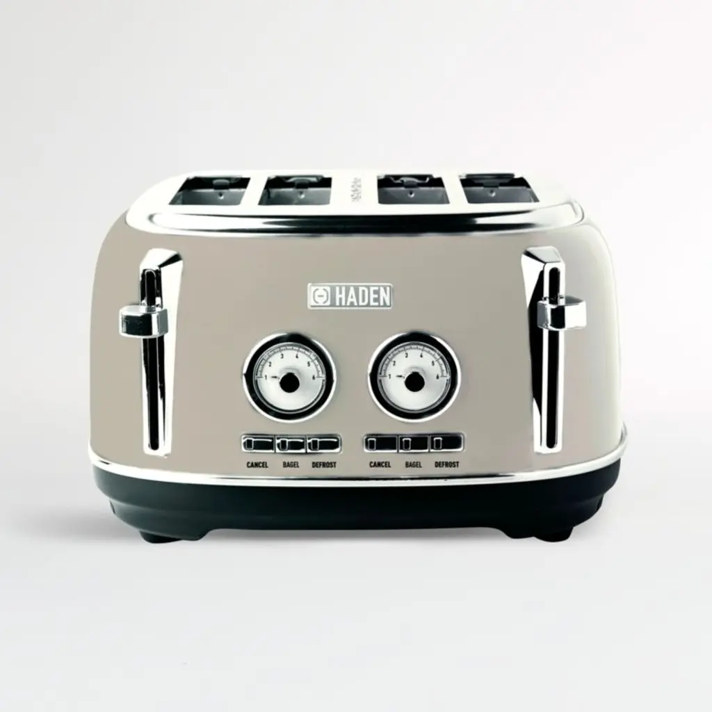 Painted glossy putty, this stainless steel toaster starts your day with perfectly browned toast and a soothing, sophisticated neutral. The classic lines, stainless steel accents and charming temperature gauge offer a bit of retro style. Four extra-wide, self-centering slots ensure thin toaster pastries and thick slices of artisan bread cook evenly. Pair the taupe toaster with the matching electric kettle for a coordinated kitchen.Inspired by traditional British homes, Haden of England updates the stalwart appliance with modern hues and features while celebrating kitchen essentials.