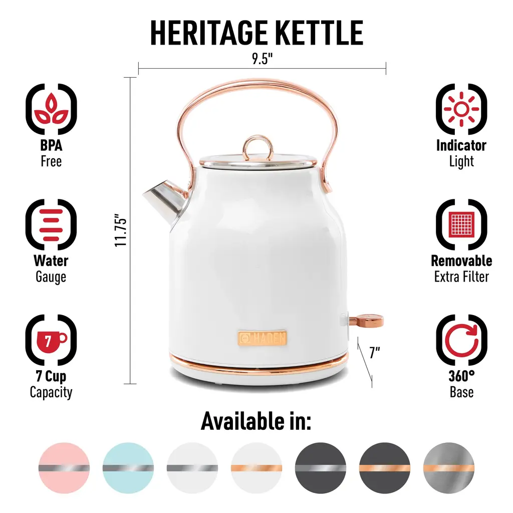 Add a touch of British Flair to your interior with HADEN Heritage 360° Cordless Kettle. With a great capacity of 1.7L, it features a built-in filter that removes limescale and other build-up impurities that can cause damage to the kettle. It comes with a spare removable filter for convenience. The large handle of the kettle allows a firm grip and full control when pouring. Made with high-grade BPA-free & stainless-steel material, this fast boil electric kettle contains a boil dry cut-off protection, preventing accidents if left unattended for an extended time. Designed to please, this product has a blue indicator light when the kettle is boiling Aesthetically designed with smooth edges and retro lines to fit contemporary and modern kitchens. Match up your kettle with HADEN Heritage Toaster to create a set that will uplift the look of your kitchen. Features:Specifications: