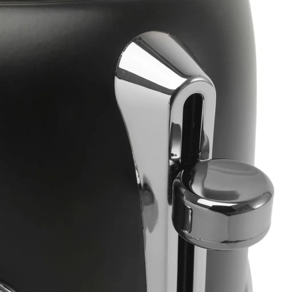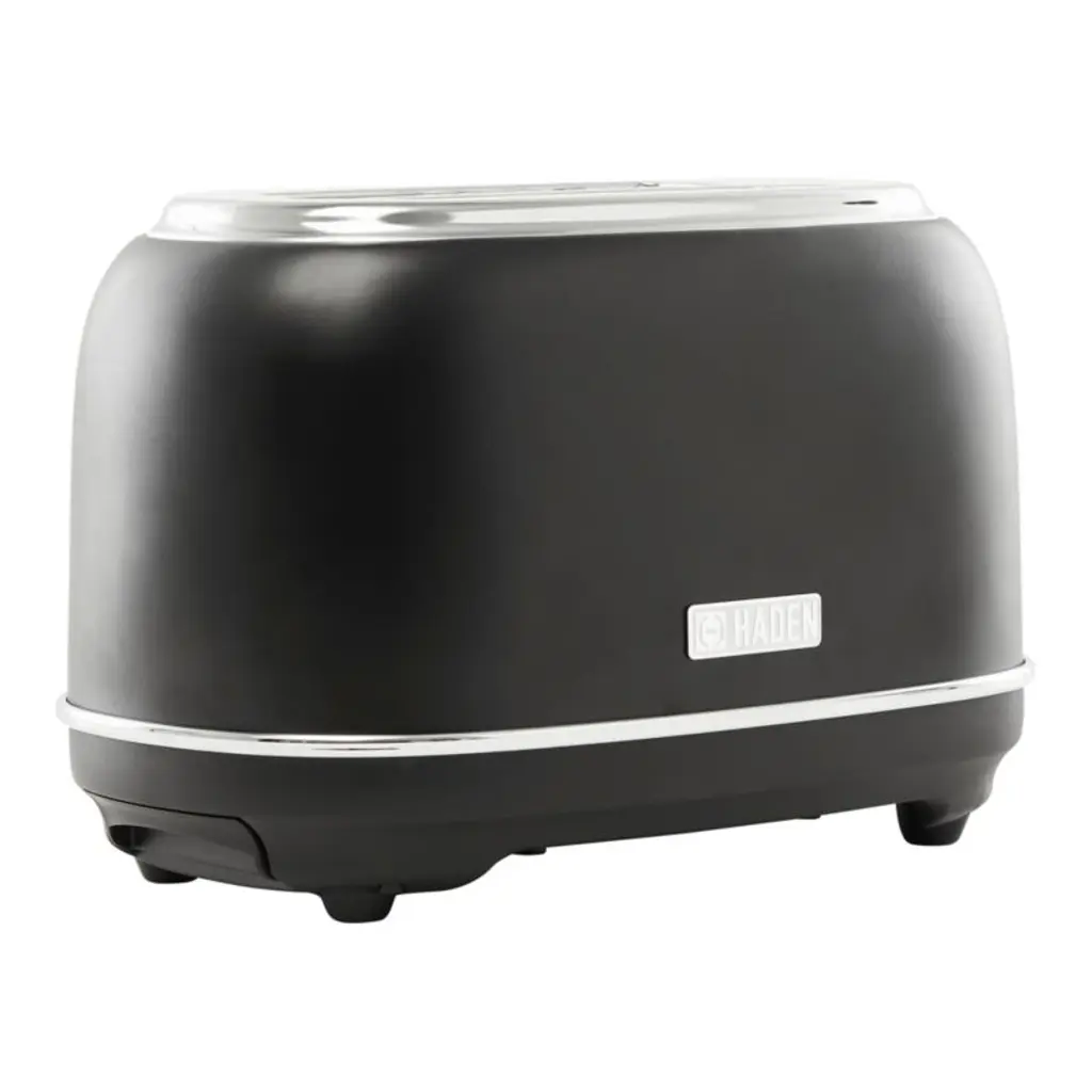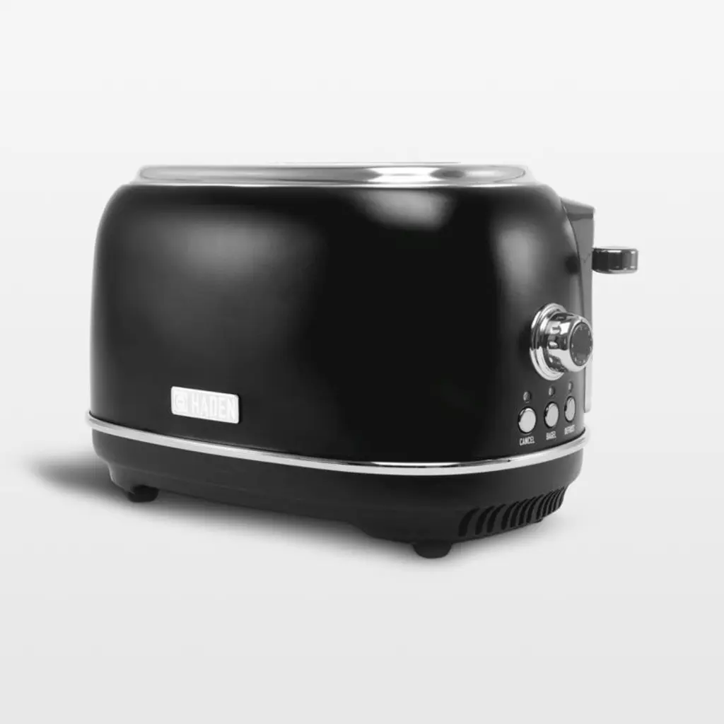 Finished in matte black with chrome details, this stainless steel toaster starts your day with perfectly browned toast and a sleek look. Inspired by traditional British homes, Haden of England updates the stalwart appliance with modern hues and features while classic curves and metallic accents add retro style. Two extra-wide, self-centering slots ensure slim toaster pastries and thick bagels cook evenly. Pair the black and chrome toaster with the matching electric kettle for a coordinated kitchen.
