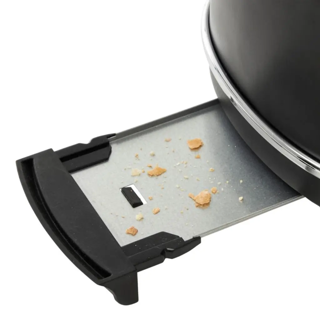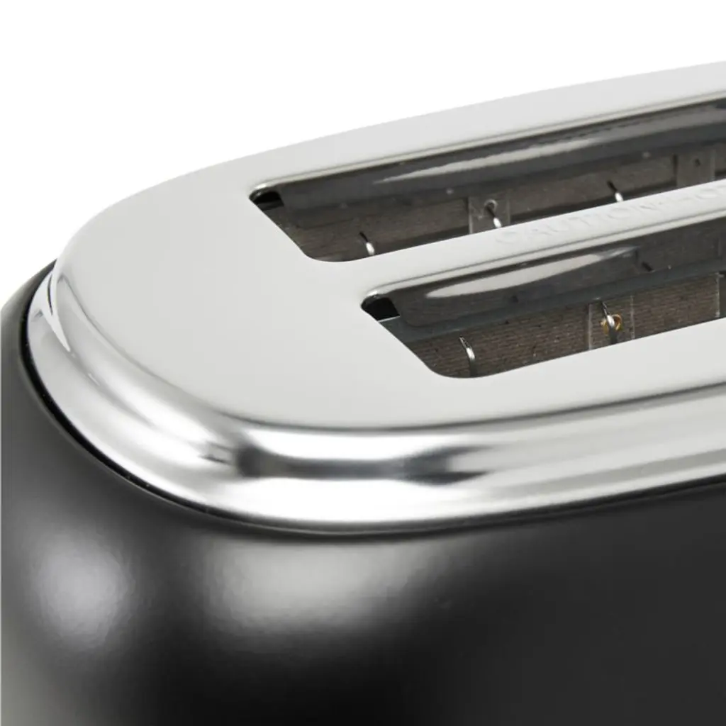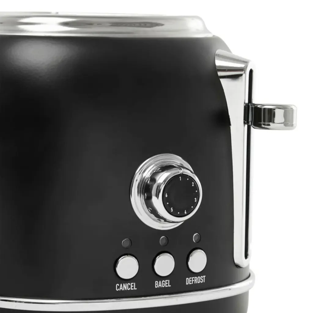 Finished in matte black with chrome details, this stainless steel toaster starts your day with perfectly browned toast and a sleek look. Inspired by traditional British homes, Haden of England updates the stalwart appliance with modern hues and features while classic curves and metallic accents add retro style. Two extra-wide, self-centering slots ensure slim toaster pastries and thick bagels cook evenly. Pair the black and chrome toaster with the matching electric kettle for a coordinated kitchen.