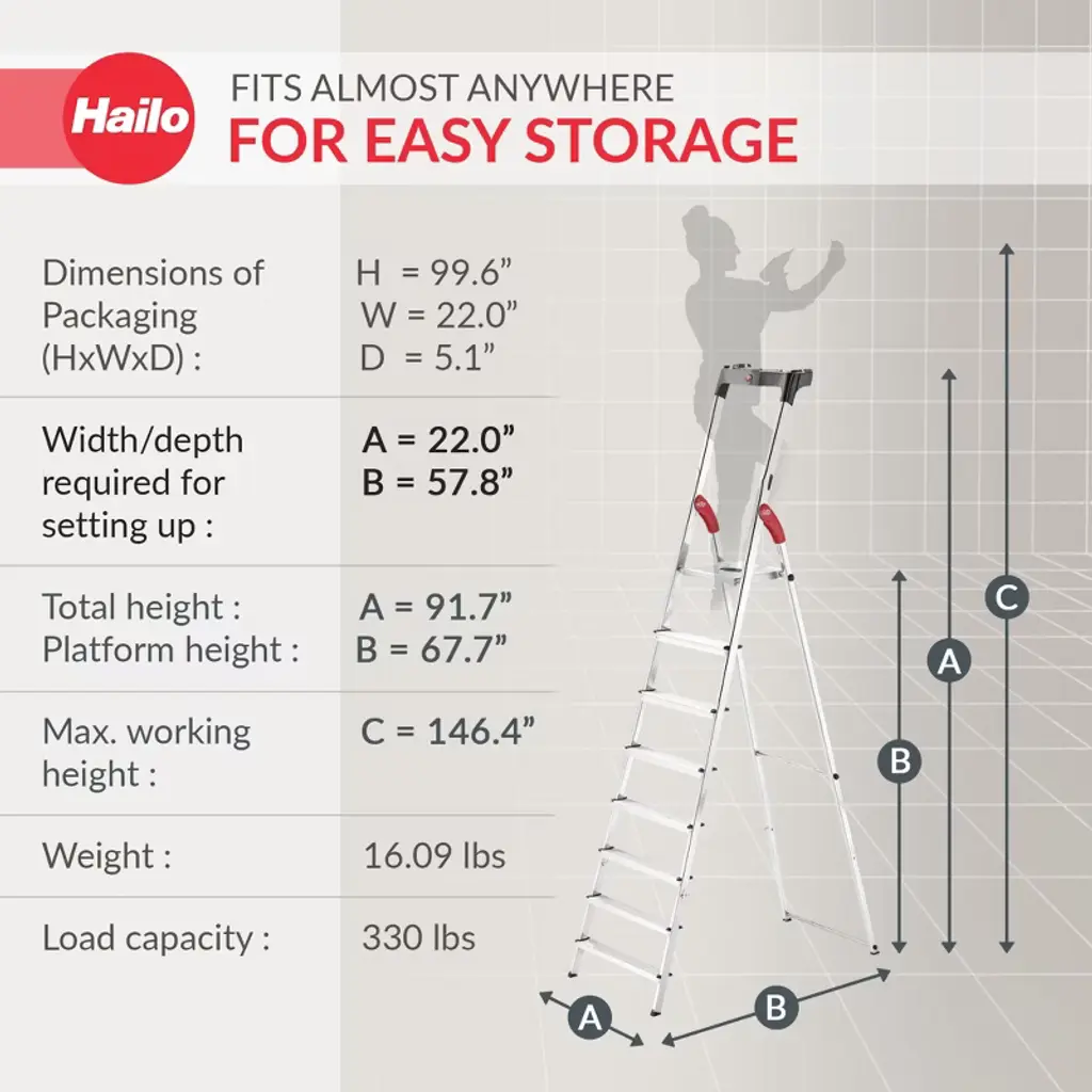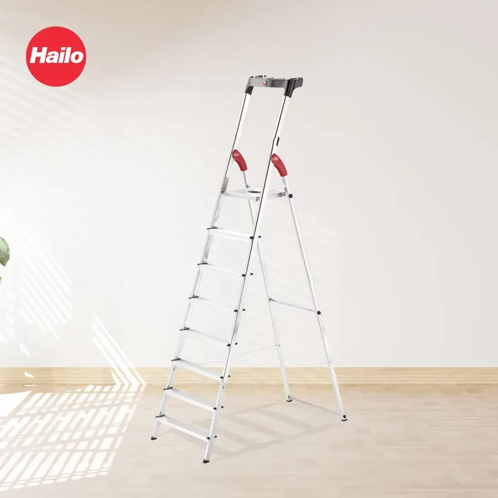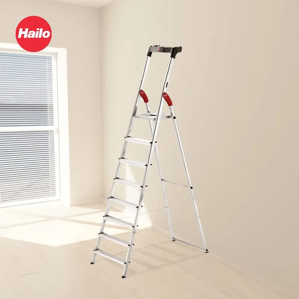 Reach those hard-to-get places and do it with confidence using the Hailo L60 Step Ladder. This stepstool is suitable for a variety of uses and has a sturdy construction that will last for many years. The frame of the foldable step stool is made from aluminum for robustness and reliability. The individual steps are also made from aluminum with a large surface area that is covered with textured, non-slip mats for added safety. The feet are covered with non-skid plastic and offer full-surface contact, factors that provide maximum stability and help to ensure that the stepstool won’t slip out from under you while you work. Holding a maximum weight of 330 pounds, this ladder stand is perfect for use in or outside of your home. With an 8.8-foot reach, you can use it as an attic ladder to retrieve seasonal essentials, as a garage stool to reach top-shelf tools or equipment, or as a kitchen step stool to help you clean the top of your refrigerator. Simply unfold the ladder and it'll stay unfolded thanks to the folding lock with safety catch, and the integrated handle provides additional stability when going up and down the ladder. When you're finished, this ladder has a handy fold-down feature with a narrow width, making it easy to store and transport. Whenever you need a lift, this Step Ladder from Hailo is your go-to companion.