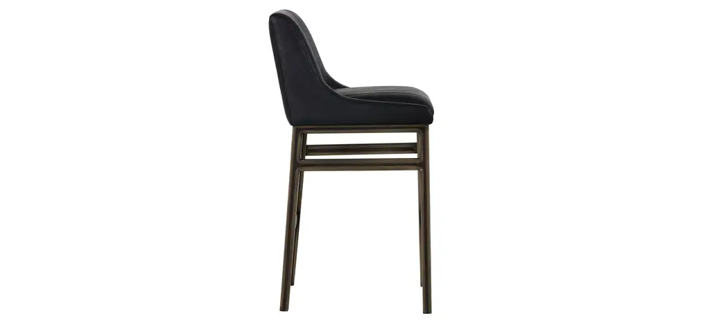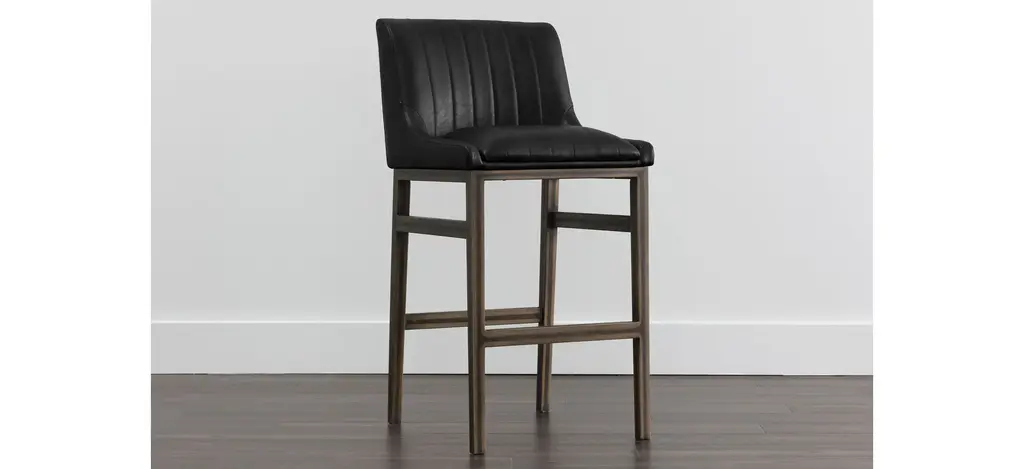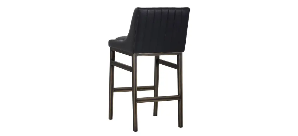 The urban designed Halden barstool features bold vertical channel tufting on the seat and back. Finished with a rustic bronze steel frame and stretchers.