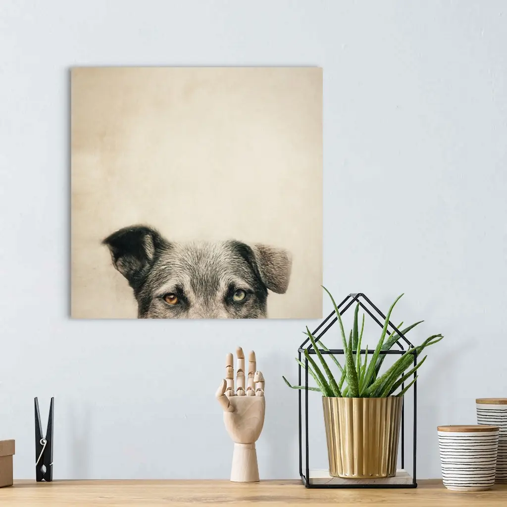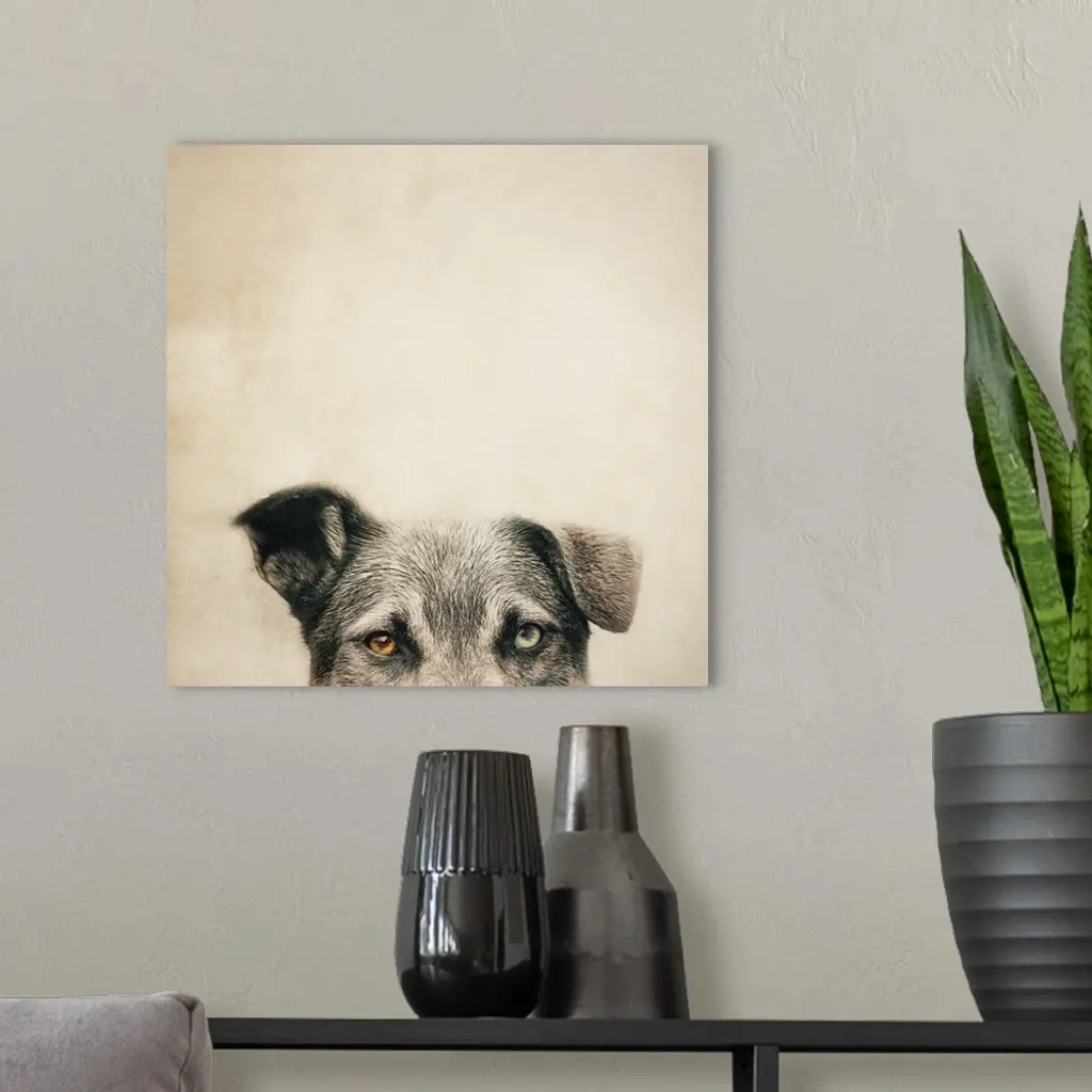 An artistic photograph of a half portrait of a dog against beige background.