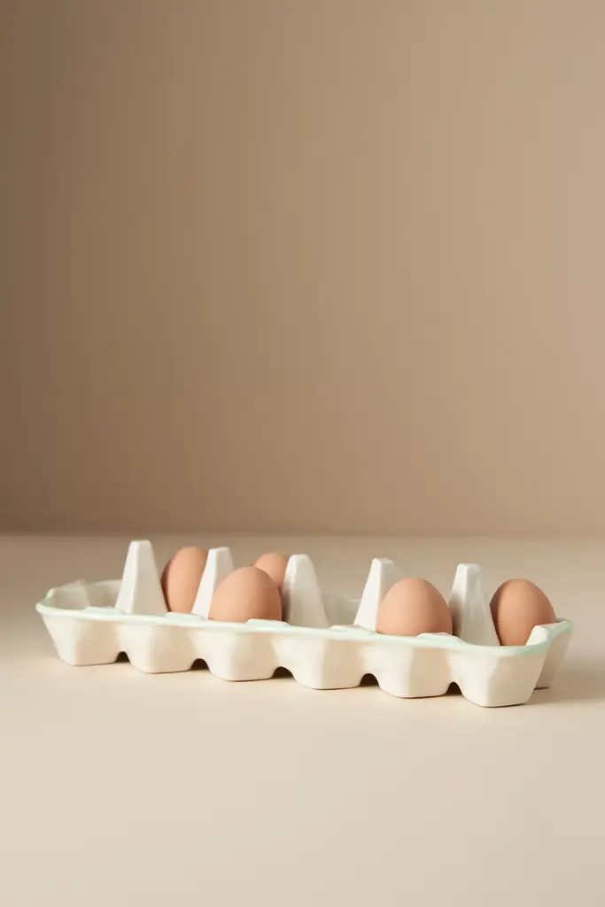 Modeled after the cardboard classic, this white porcelain egg crate neatly holds a coolor hard-boiledhalf dozen. Our sturdy egg holder, a Crate & Barrel exclusive, safely stores eggs from the farmers market or grocery store in your refrigerator. For a particularly charming breakfast or brunch presentation, use it to serve hard- and soft-boiled eggs. You can also use the hand-glazed crate to keep eggs corralled and in close reach while cooking and baking.