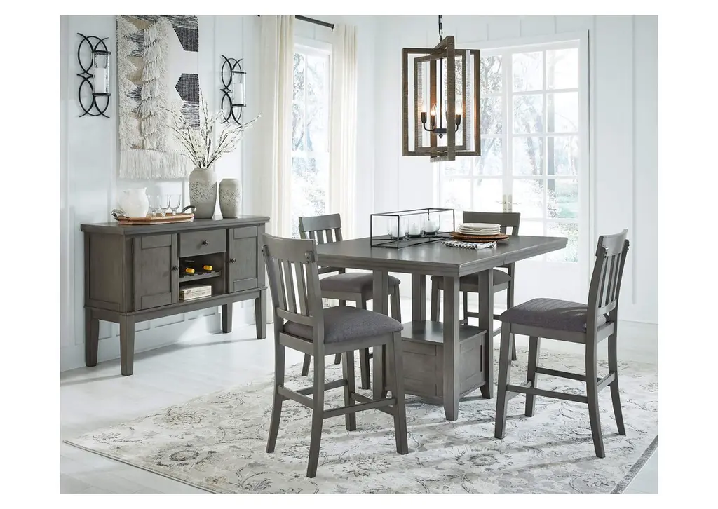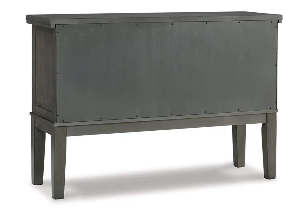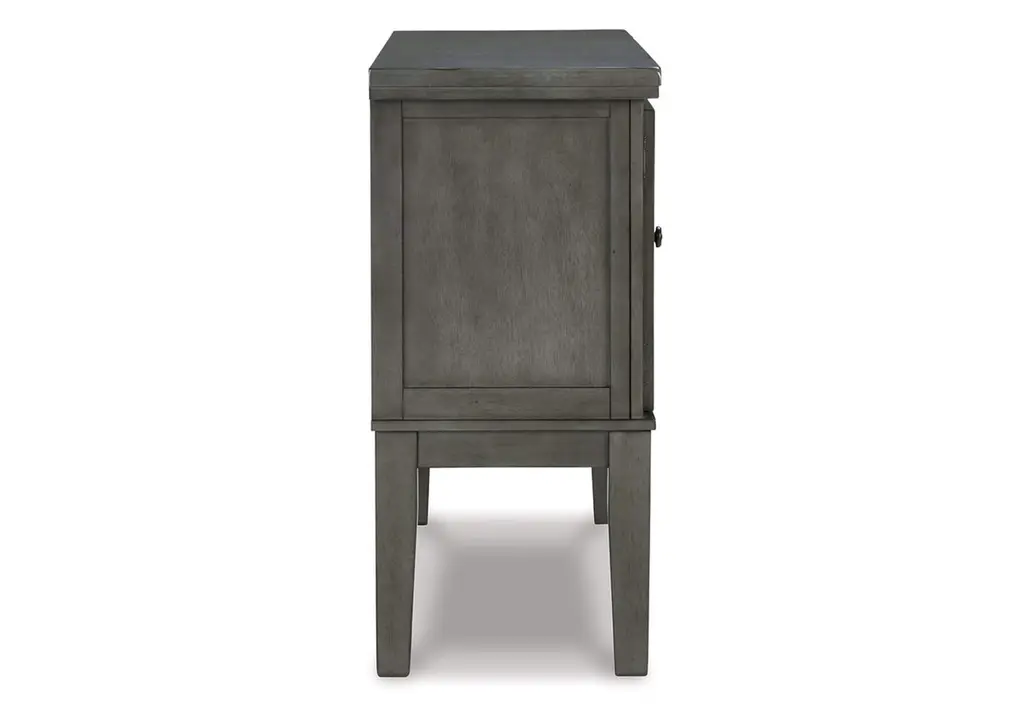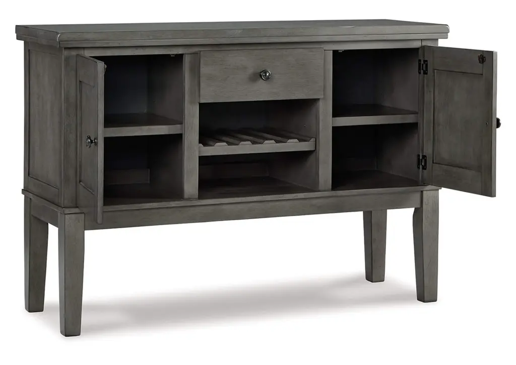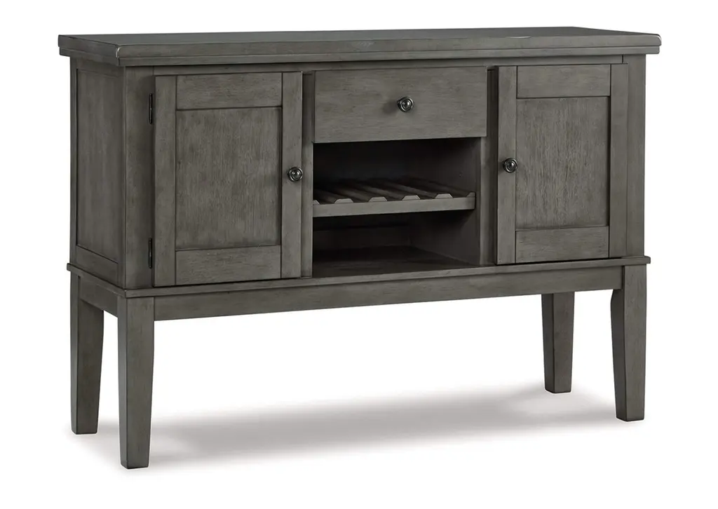 Cool and on-trend. The Hallanden server sports an antiqued gray color for a contemporary-yet-casual feel. The server features two cabinets, a smooth-gliding drawer and an open cubby with a wine rack, making it a breeze to clear away clutter and expand your serving space. Dining with friends and family has never been so stylish. Weight 147.000 lbs. (66.15kgs.)