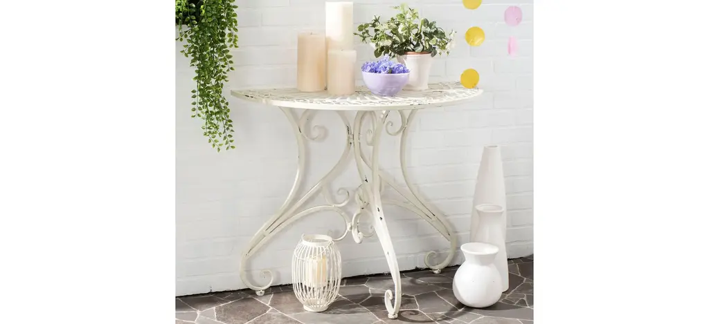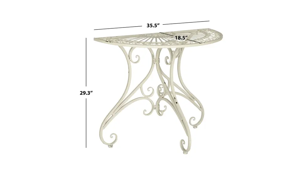 The flourishing Baroque details of this Halleck Accent Table awaken your outdoor decor with airy ambiance and vintage charm. Crafted of sculpted iron in an antique white finish, Halleck's half moon design makes it ideal against a wall, saving valuable entertaining space with elegant charisma.
