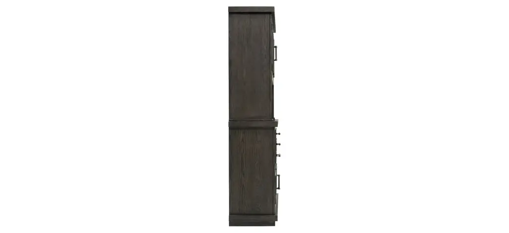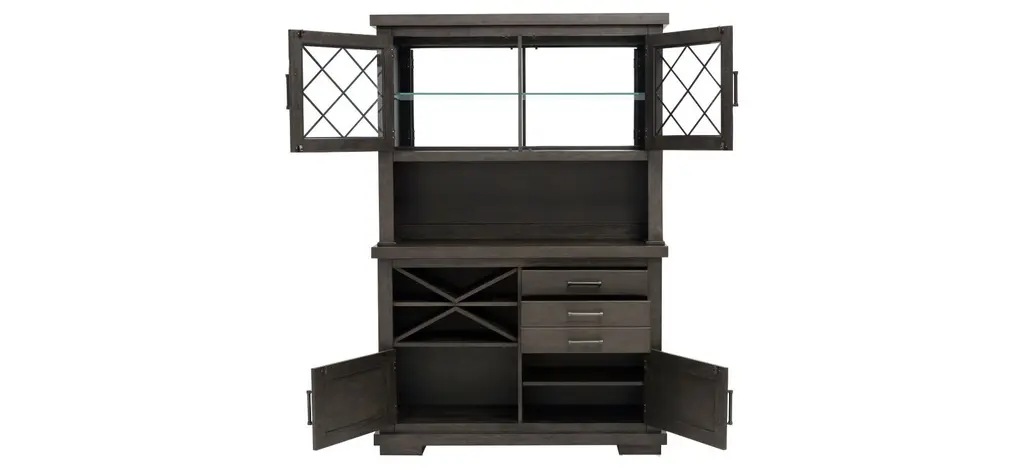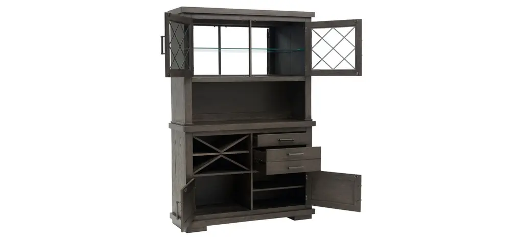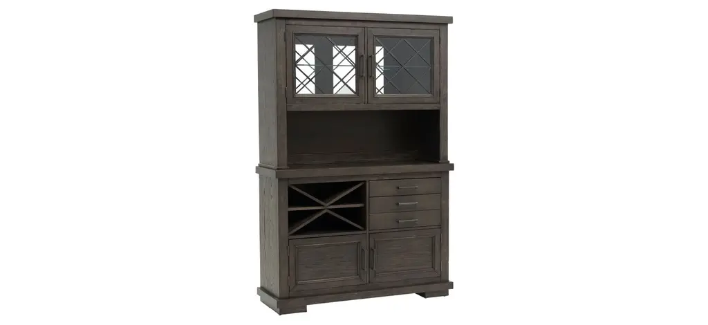 When it comes to the Halloway 2-pc. china cabinet, strong lines and eye-catching detail create a transitional look that serves up fine dining for a variety of decorating styles. Distressed, espresso finish and parquet pattern oak veneers showcase this piece's natural beauty, while features like the wine rack and touch lighting add practicality. Plus, the mirrored backs in the china cabinet are great for displays!