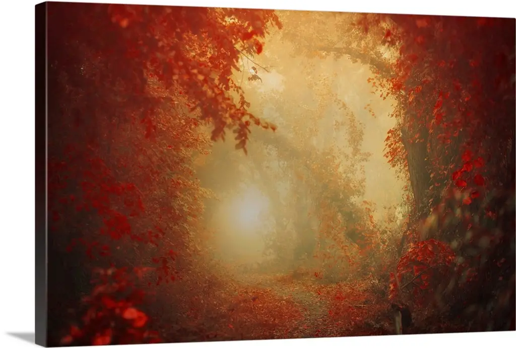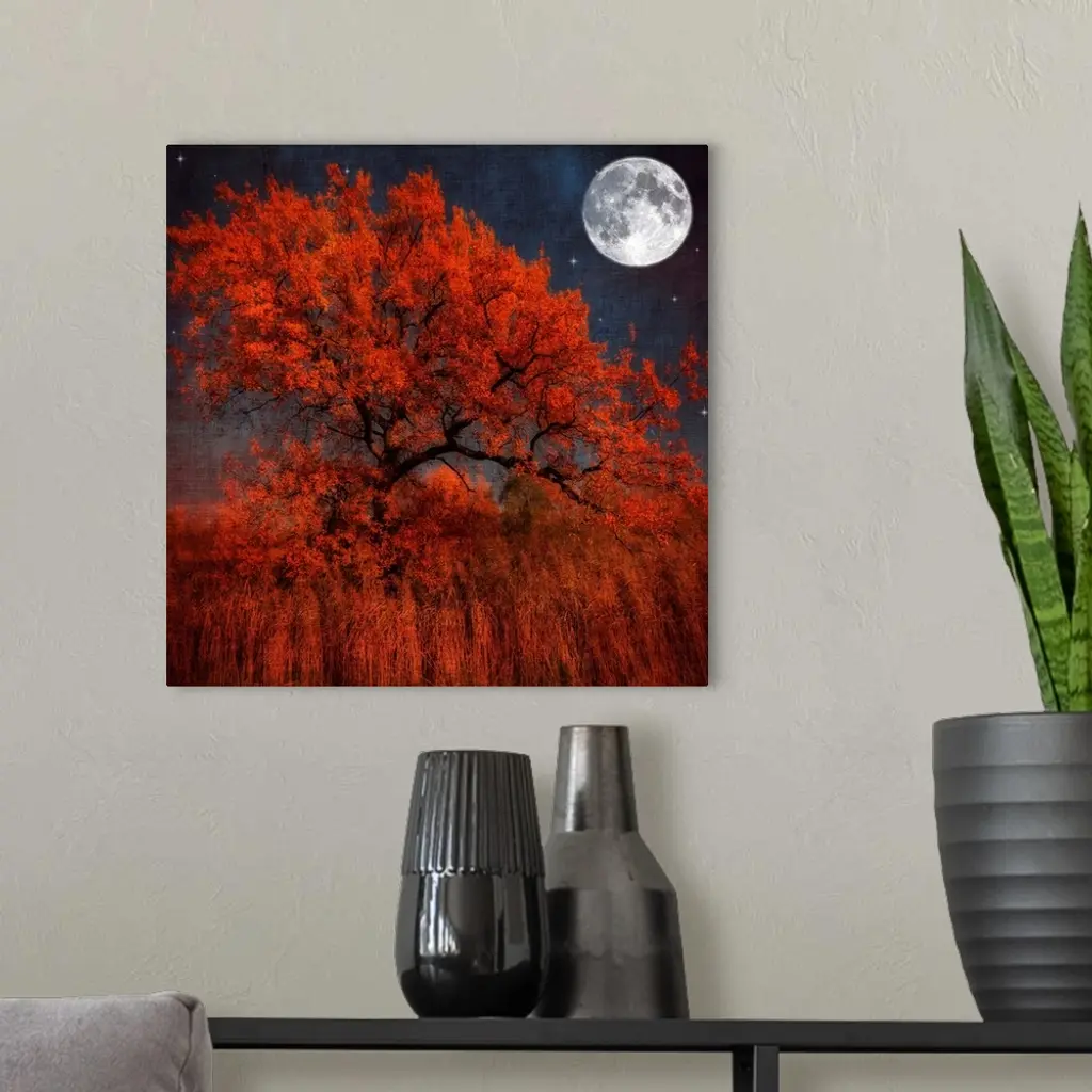 A large tree with autumn leaves sits in a field of tall orange grass. A full moon and several stars shine brightly in the sky.