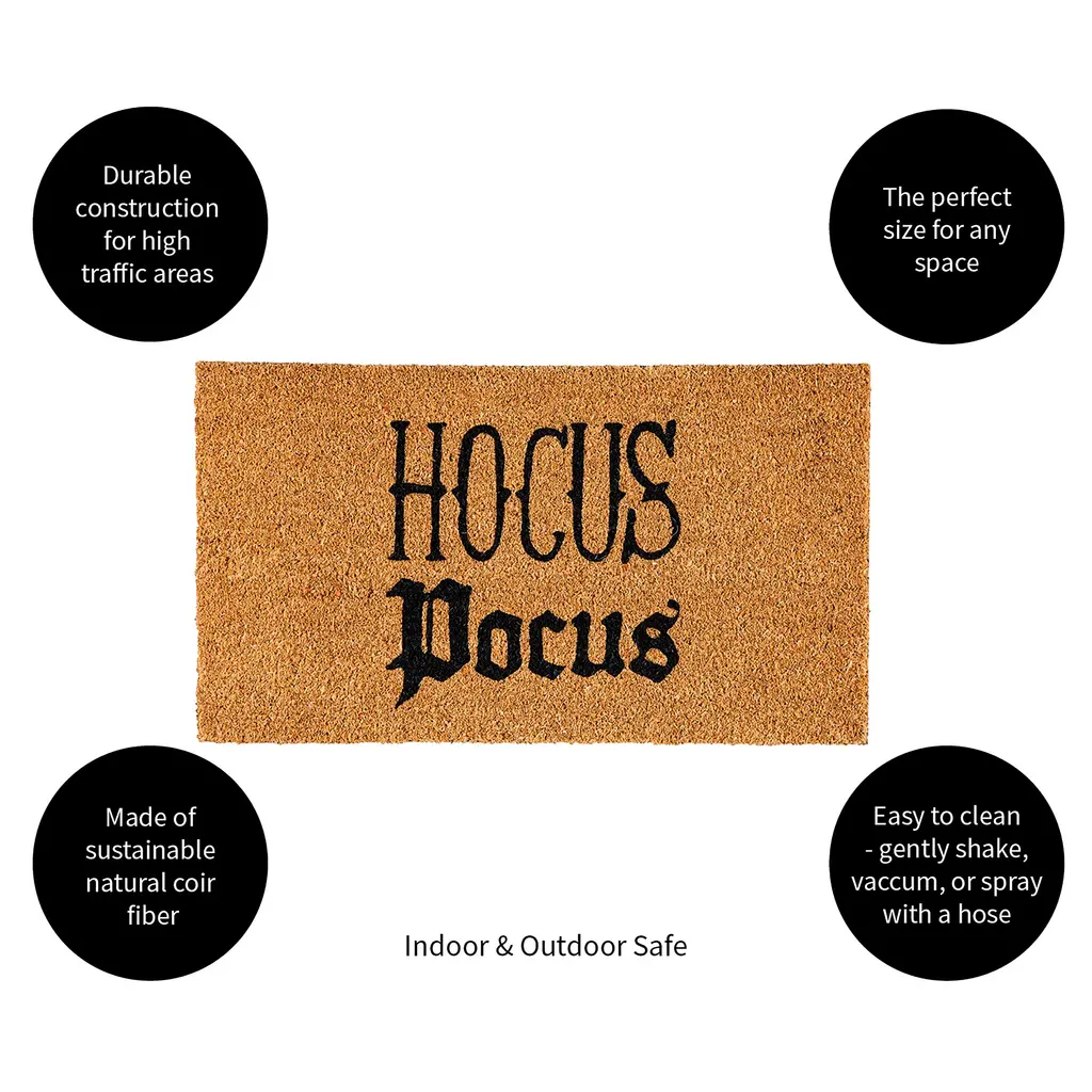 This Halloween greeting coir mat is perfect for welcoming trick-or-treaters to your doorstep. With its "Hocus Pocus" message, this doormat is fun and festive with a spooky touch. Crafted from coco husk fiber, this eye-catching mat is natural and eco-friendly. Ideal for high-traffic areas, the mat traps dirt and debris to prevent messes from being tracked into homes. Designs are printed directly onto the mat with fade-resistant dyes. Because the mat is crafted from natural coir, some shedding is expected. Shake off excess fibers or gently sweep using a soft brush.