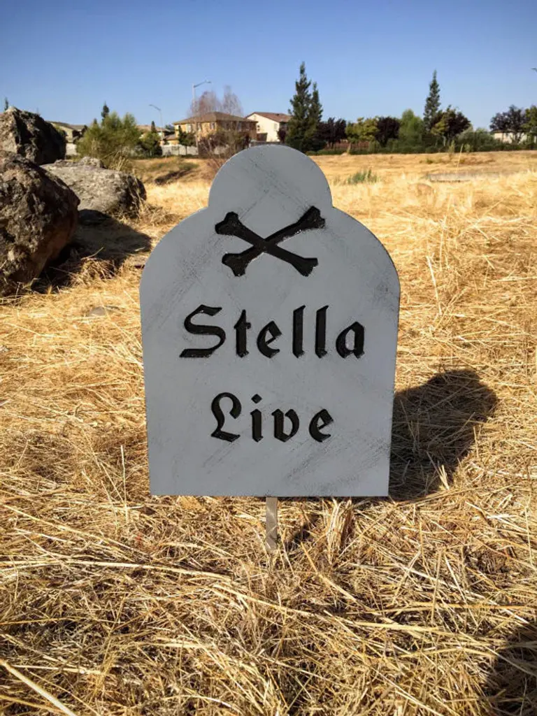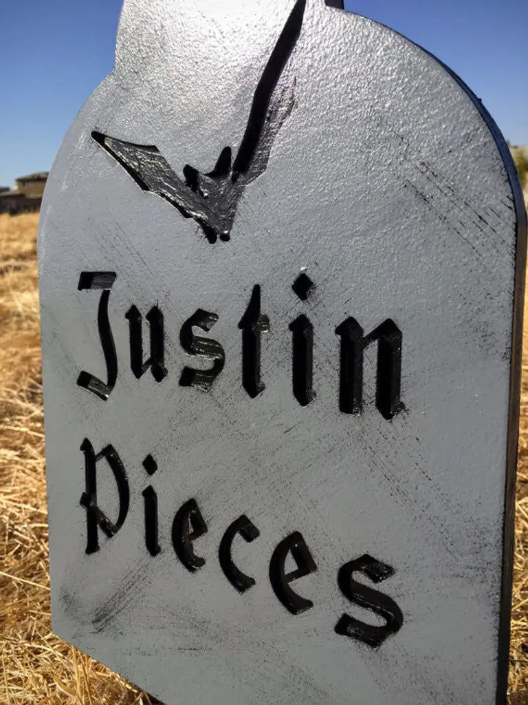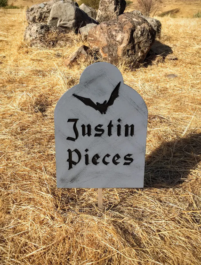 Nothing says Halloween like a graveyard in your front yard. "Justin Pieces" measurements and details:-the sign measures 14 inches tall and is 10 inches wide-cut out of 1/2 inch durable outdoor wood-painted in a vibrant high gloss color-steel stake