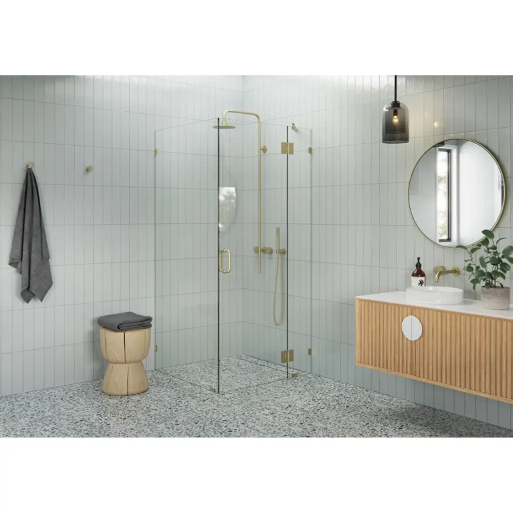 Highlight the fixtures in your bathroom with the understated minimalism of a glass-hinged 90-degree corner shower enclosure. Taller than most competitor shower enclosures, our frameless 3/8" tempered glass panels come in a standard 78" height. At the same time, the flexibility of a glass-hinged panel allows room for wall accessories or a design that doesn't suit a wall-hung door. Glass is treated on both sides with EnduroShield coating, which aids in repelling water and soap residue, allowing the panels to be fully reversible. In addition, our superior quality solid brass hardware is available in a variety of color finishes to suit any bathroom. With our extensive range of frameless shower door and panel sizes, the Halo walk-in enclosure by Glass Warehouse is perfect for any space, creating a light and airy feel to your bathroom.