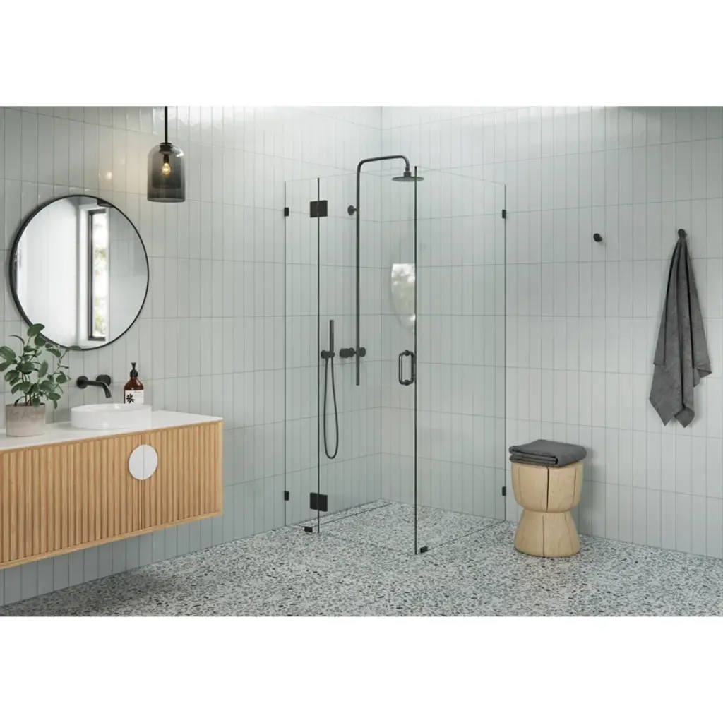 Highlight the fixtures in your bathroom with the understated minimalism of a glass-hinged 90-degree corner shower enclosure. Taller than most competitor shower enclosures, our frameless 3/8" tempered glass panels come in a standard 78" height. At the same time, the flexibility of a glass-hinged panel allows room for wall accessories or a design that doesn't suit a wall-hung door. Glass is treated on both sides with EnduroShield coating, which aids in repelling water and soap residue, allowing the panels to be fully reversible. In addition, our superior quality solid brass hardware is available in a variety of color finishes to suit any bathroom. With our extensive range of frameless shower door and panel sizes, the Halo walk-in enclosure by Glass Warehouse is perfect for any space, creating a light and airy feel to your bathroom.