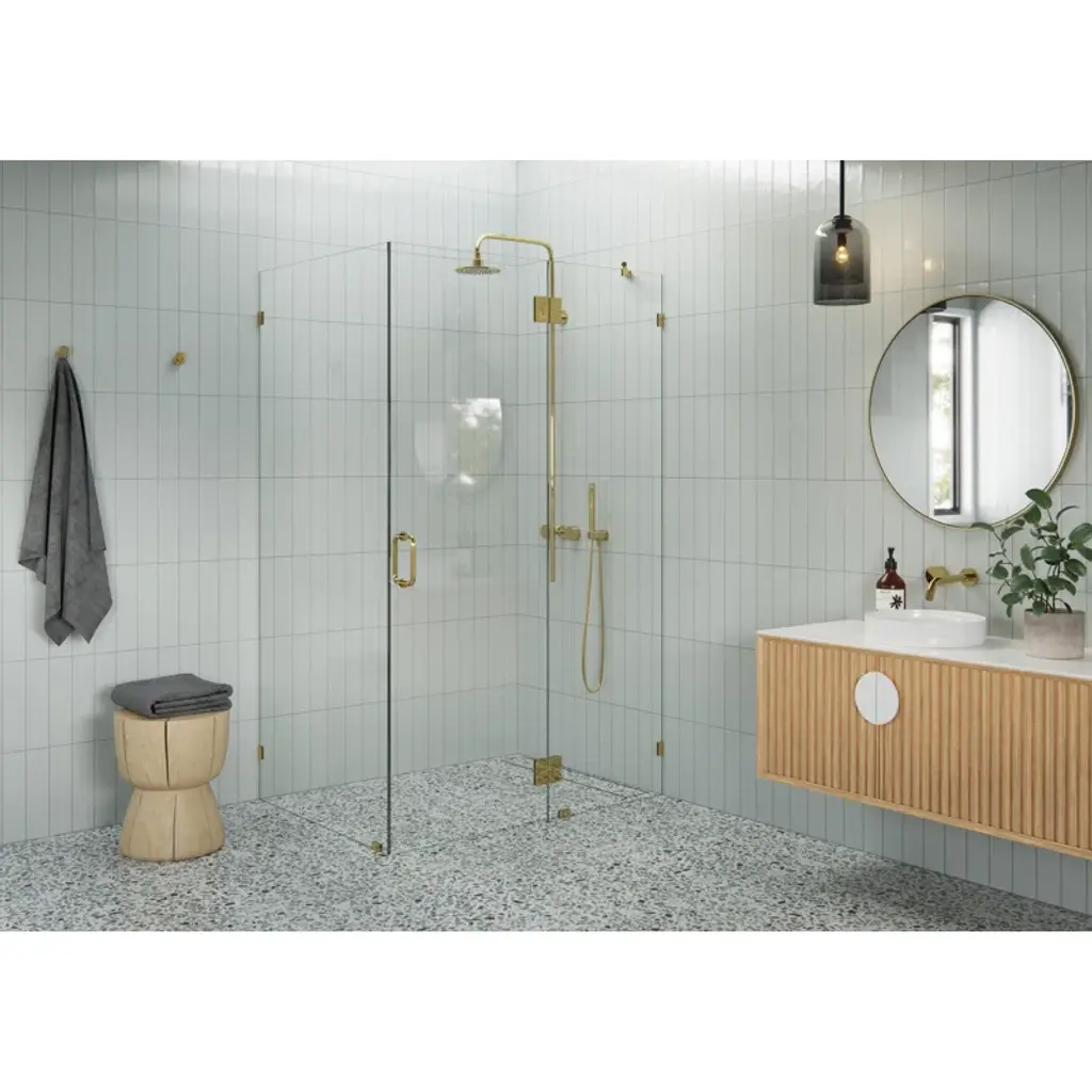 Highlight the fixtures in your bathroom with the understated minimalism of a glass-hinged 90-degree corner shower enclosure. Taller than most competitor shower enclosures, our frameless 3/8" tempered glass panels come in a standard 78" height. At the same time, the flexibility of a glass-hinged panel allows room for wall accessories or a design that doesn't suit a wall-hung door. Glass is treated on both sides with EnduroShield coating, which aids in repelling water and soap residue, allowing the panels to be fully reversible. In addition, our superior quality solid brass hardware is available in a variety of color finishes to suit any bathroom. With our extensive range of frameless shower door and panel sizes, the Halo walk-in enclosure by Glass Warehouse is perfect for any space, creating a light and airy feel to your bathroom.