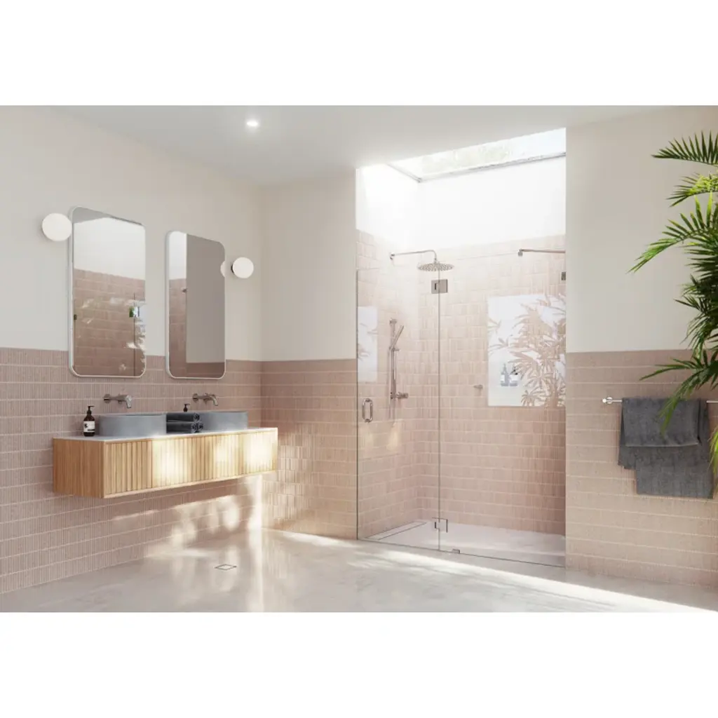Highlight the fixtures in your bathroom with the understated minimalism of a glass-hinged corner shower enclosure. Taller than most competitor shower enclosures, our frameless 3/8” tempered glass panels come in a standard 78” height. At the same time, the flexibility of a glass-hinged panel allows room for wall accessories or a design that doesn't suit a wall-hung door. Glass is treated on both sides with EnduroShield coating, which aids in repelling water and soap residue, allowing the panels to be fully reversible. In addition, our superior quality solid brass hardware is available in a variety of color finishes to suit any bathroom. With our extensive range of frameless shower doors and panel sizes, the Halo walk-in enclosure by Glass Warehouse is perfect for any space, creating a light and airy feel to your bathroom.