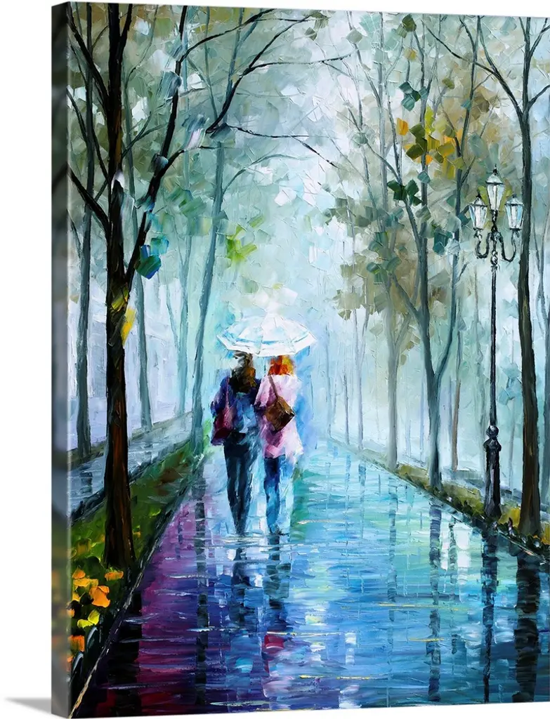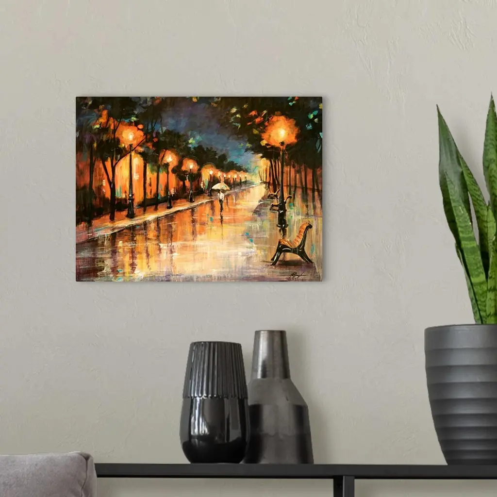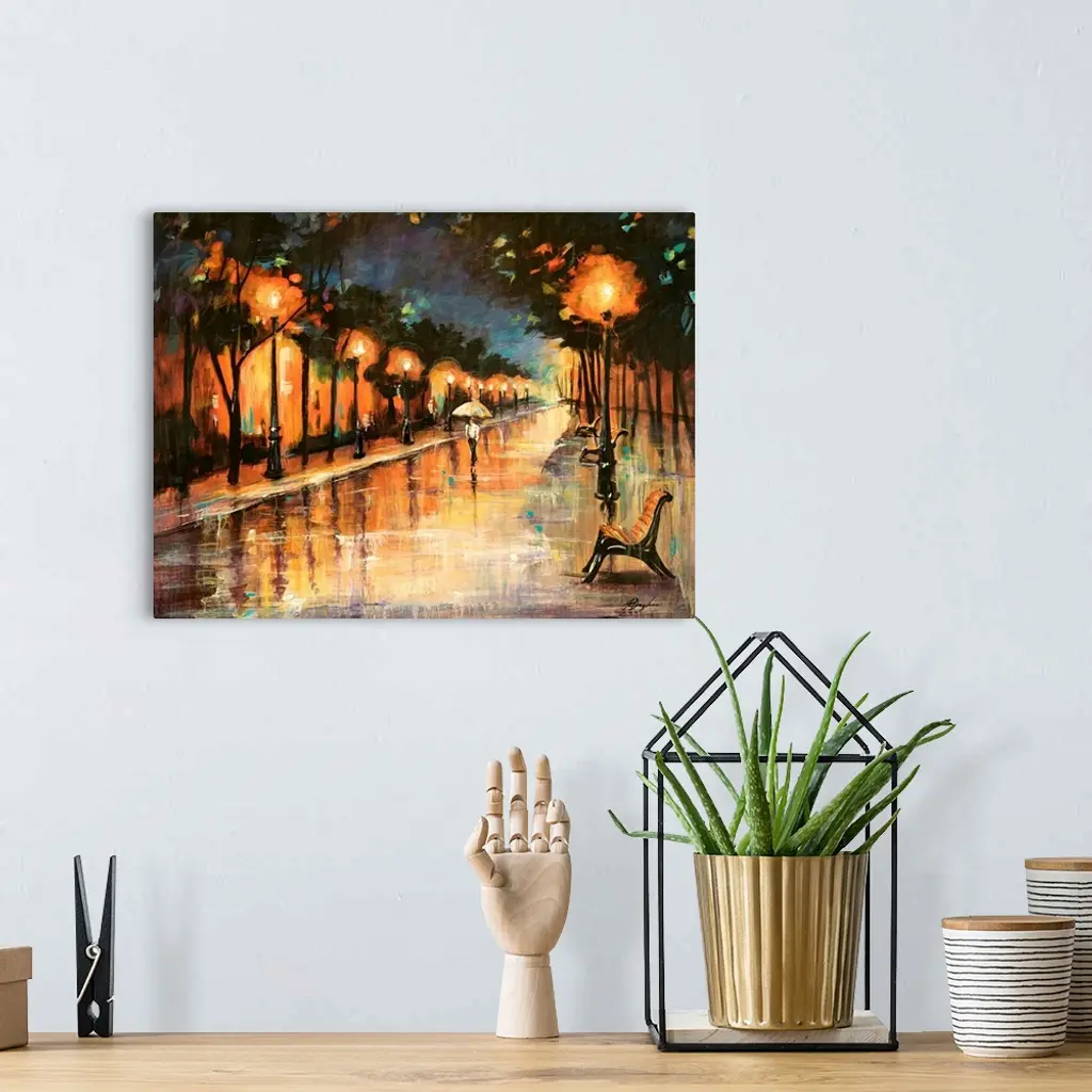 Huge contemporary art focuses on a lone individual carrying an umbrella as raindrops fall on a walkway at night. Lining this path are groups of trees, street lamps, and benches that are evenly spaced into the distance.