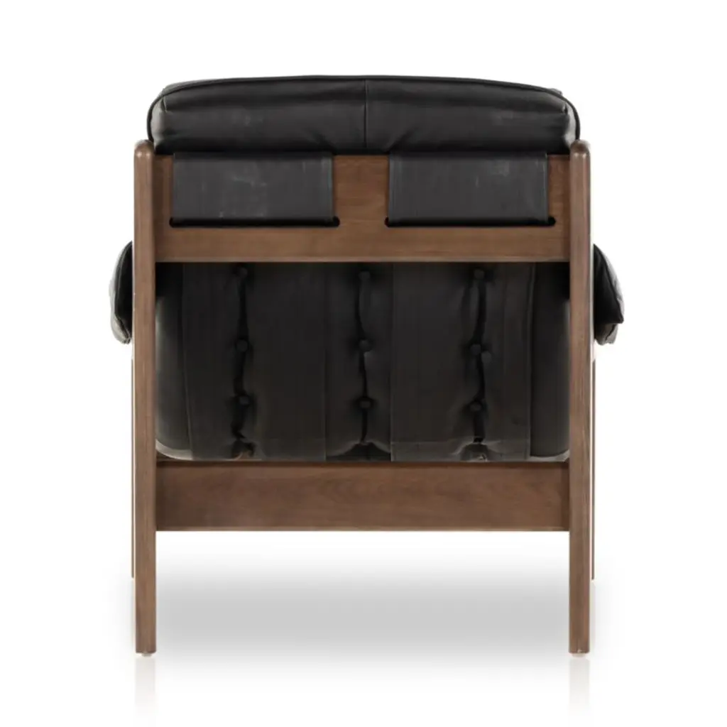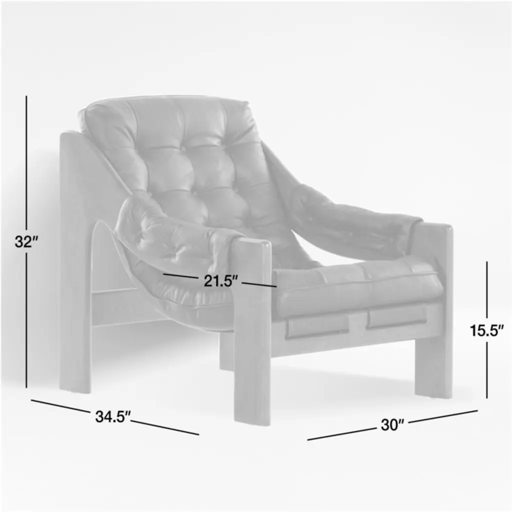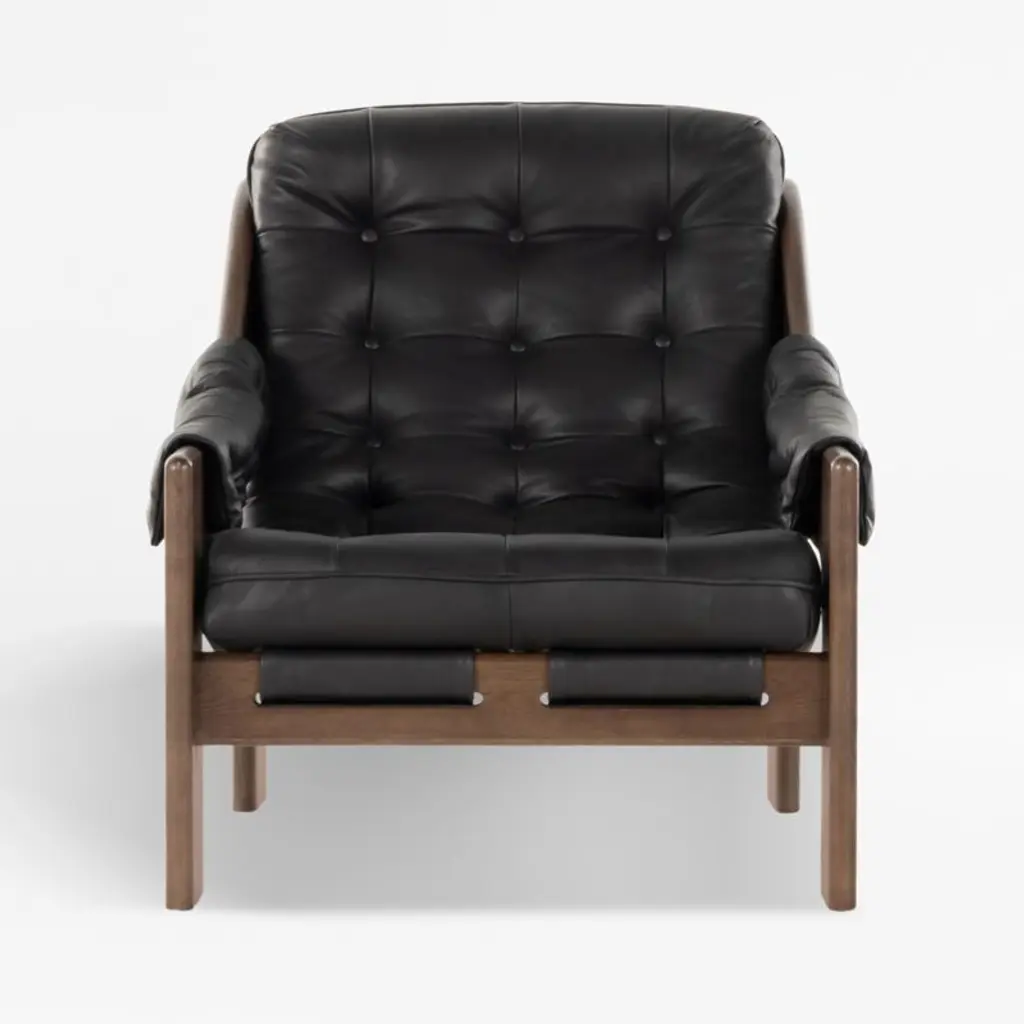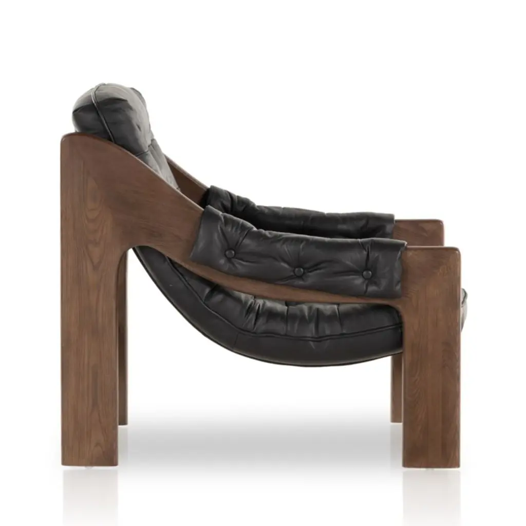 Based on a flea market find, our Halston chair celebrates the playful proportions and decadent comfort of 1970s design. Flat, sculpted panels of ash finished in a rich, earthy brown create the dramatic flow from leg to arm and the wide stretcher bars that visibly anchor the seat's sling foundation. Upholstered in buttery soft black leather, the chair's all-in-one curved seat embraces with plush cushioning and extravagant tufting repeated in the padded rests that saddle the arms. We love contrasting this detail-rich chair and its companion ottoman sold separately with one of our minimalist accent tables.