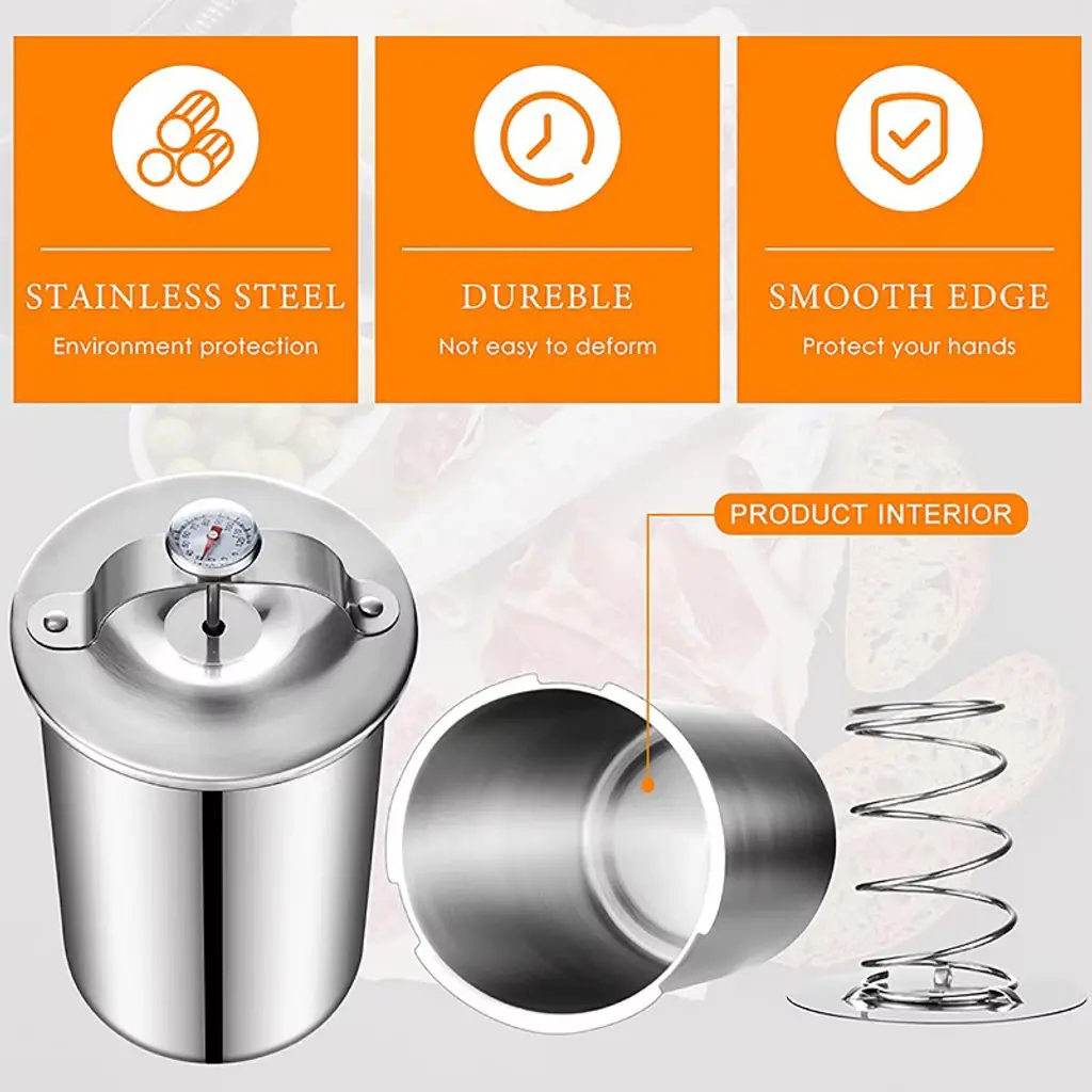 Stainless Steel Meat Press Ham Maker - 304 Food-Grade Meat Tenderizer with ThermometerProduct Description:Create delicious, healthy ham and luncheon meats at home with this professional-grade Stainless Steel Meat Press. Crafted from durable 304 stainless steel, this versatile tool lets you experiment with pork, chicken, and other meats to make customized sandwich meats using wholesome ingredients. The integrated thermometer and compressing spring design ensure perfect texture and temperature control every time, while the easy-clean design makes homemade meat preparation simple and enjoyable.Key Features:1. Premium 304 Stainless Steel ConstructionMade from food-grade 304 stainless steel that ensures safety, durability, and resistance to corrosion. The smooth inner walls make cleaning effortless¡ªsimply rinse under water or place in the dishwasher for maintenance-free convenience.2. Compressing Spring Mechanism for Perfect TextureFeatures an innovative spring mechanism that creates tighter, chewier textures in your homemade patties. This unique design replicates authentic deli-style consistency, giving your handmade ham superior texture and flavor compared to store-bought alternatives.3. Built-In Thermometer for Precise Temperature ControlIncludes an integrated thermometer with a 0-120¡ãC range that lets you monitor internal temperature in real time. This ensures your meats reach perfect doneness and food safety standards with consistent results every time you use the press.4. User-Friendly Design for All Skill LevelsSimple, intuitive operation makes this meat press accessible even for beginners. The compact size produces approximately 2.5-pound batches¡ªideal for small gatherings, family meals, or personal use without requiring extensive cooking experience.5. Versatile Meat Processing CapabilitiesPerfect for pressing and shaping various meat mixtures including pork, chicken, and other proteins. Create customized sandwich meats, luncheon meats, and patties tailored to your family's preferences while controlling ingredient quality and freshness.Specifications:? Material: 304 Food-Grade Stainless Steel? Capacity: Approximately 2.5 pounds per batch? Dimensions: 6.4" Height x 3.9" Diameter? Features: Built-in Thermometer (0-120¡ãC), Compressing Spring? Cleaning: Dishwasher Safe, Smooth Inner Walls? Use: Homemade Ham, Sandwich Meats, Meat Patties