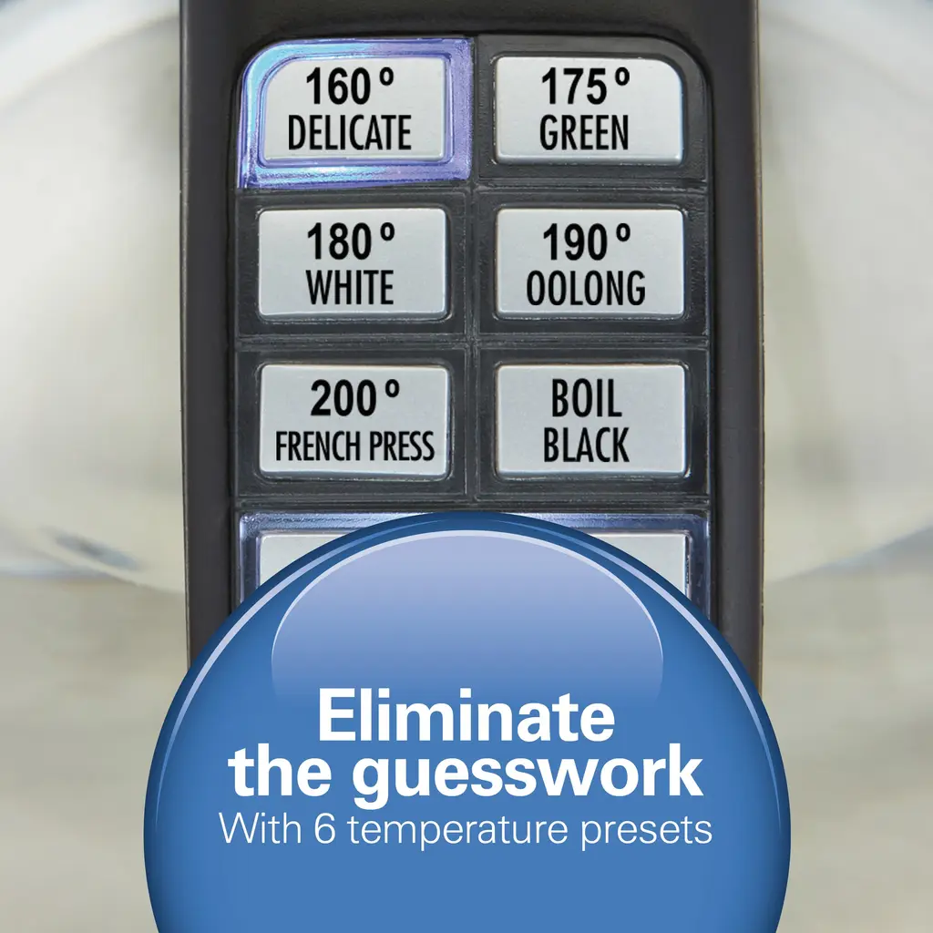The Hamilton Beach Variable Temperature Glass Kettle provides fast boiling thanks to 1500 watts of power. You'll be able to pour yourself multiple cups without reheating the water because the keep warm setting maintains the water's temperature. The Hamilton Beach Variable Temperature Glass Kettle includes temperature presets for delicate, green, white, oolong and black teas, French press coffee and hot cocoa. You can heat water to a specific temperature with the touch of a button and create your favorite hot beverages with confidence. This attractive 1.7 liter kettle is made of durable borosilicate glass for long-lasting performance and it has automatic shutoff and boil-dry protection for your peace of mind. Convenient cord-free serving makes it easy to serve beverages at the table, and to make pouring and cleaning easier, the lid opens wide with the press of a button. The spout's mesh filter helps capture hard-water deposits and the cord wrap makes storage easy and keeps your countertop neat because it adjusts to your ideal length.