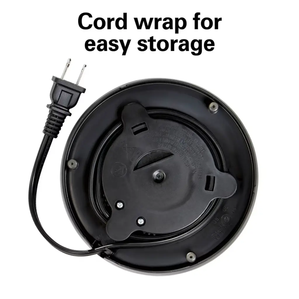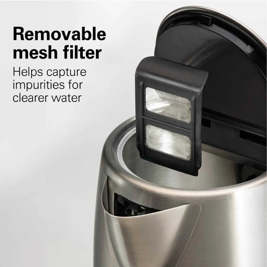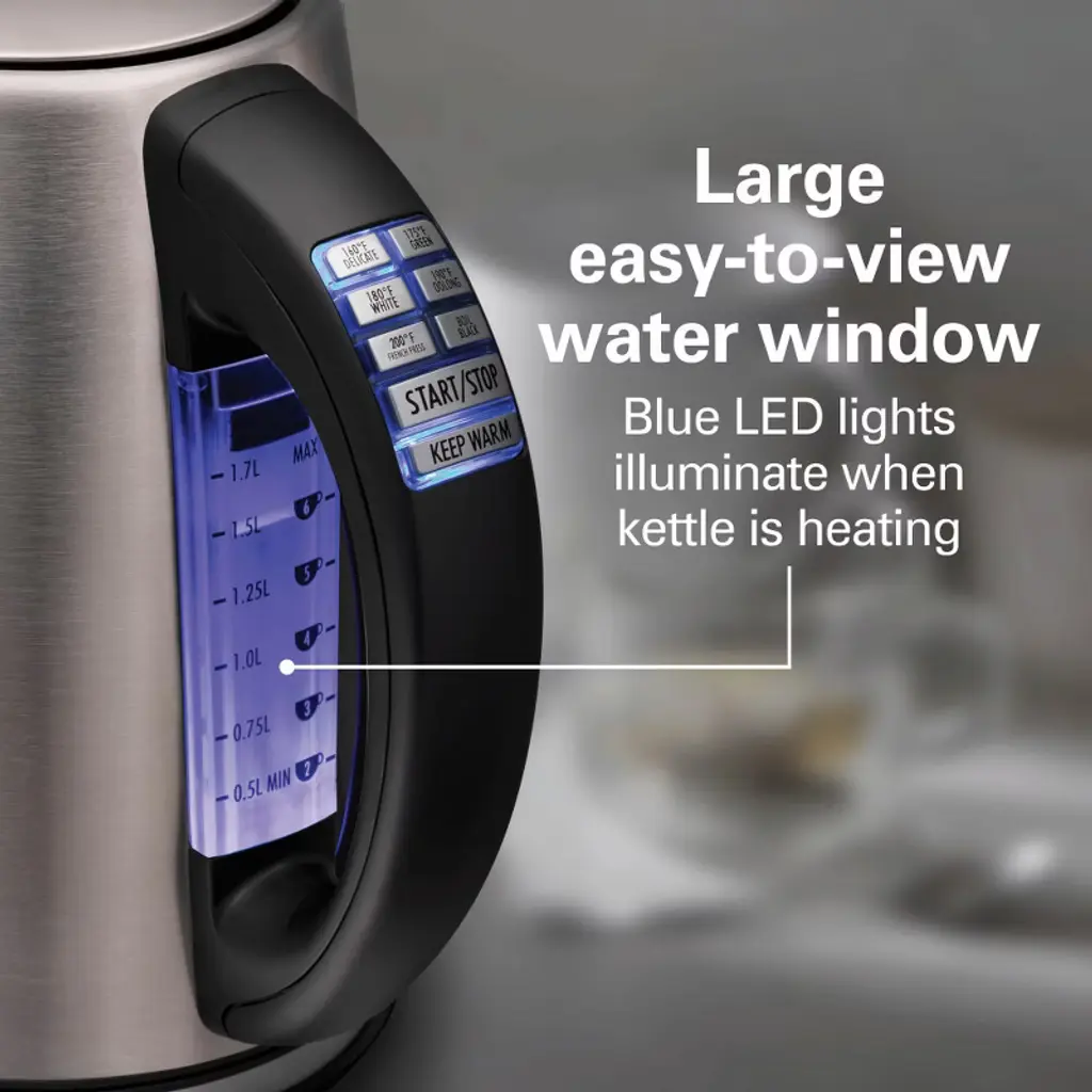 The Hamilton Beach® 1.7 Liter Variable Temperature Kettle provides ultra-fast heating thanks to 1500 watts of power. It boils 0.5 liters of water in less than 3 minutes. The kettle has a temperature range of 160°F to 212°F and six presets for delicate, green, white, oolong and black teas as well as French press coffee. You can heat water to a specific temperature with the touch of a button and create your favorite hot beverages with confidence. The kettle has a large easy-to-view window to see inside the kettle and blue LED lights illuminate when the kettle is heating. The Keep Warm setting maintains the selected temperature for 30 minutes until you remove the kettle from the base. This attractive 1.7 liter (7 cup) kettle has a BPA-free, stainless steel interior for long-lasting performance, and it has automatic shutoff and boil-dry protection for peace of mind. Convenient cord-free serving makes it easy to serve beverages at the table. The lid opens wide with the press of a button for easy pouring and cleaning. The spout's removable mesh filter helps capture impurities for clearer water, while the cord wrap makes storage easy and helps keep your countertop neat.