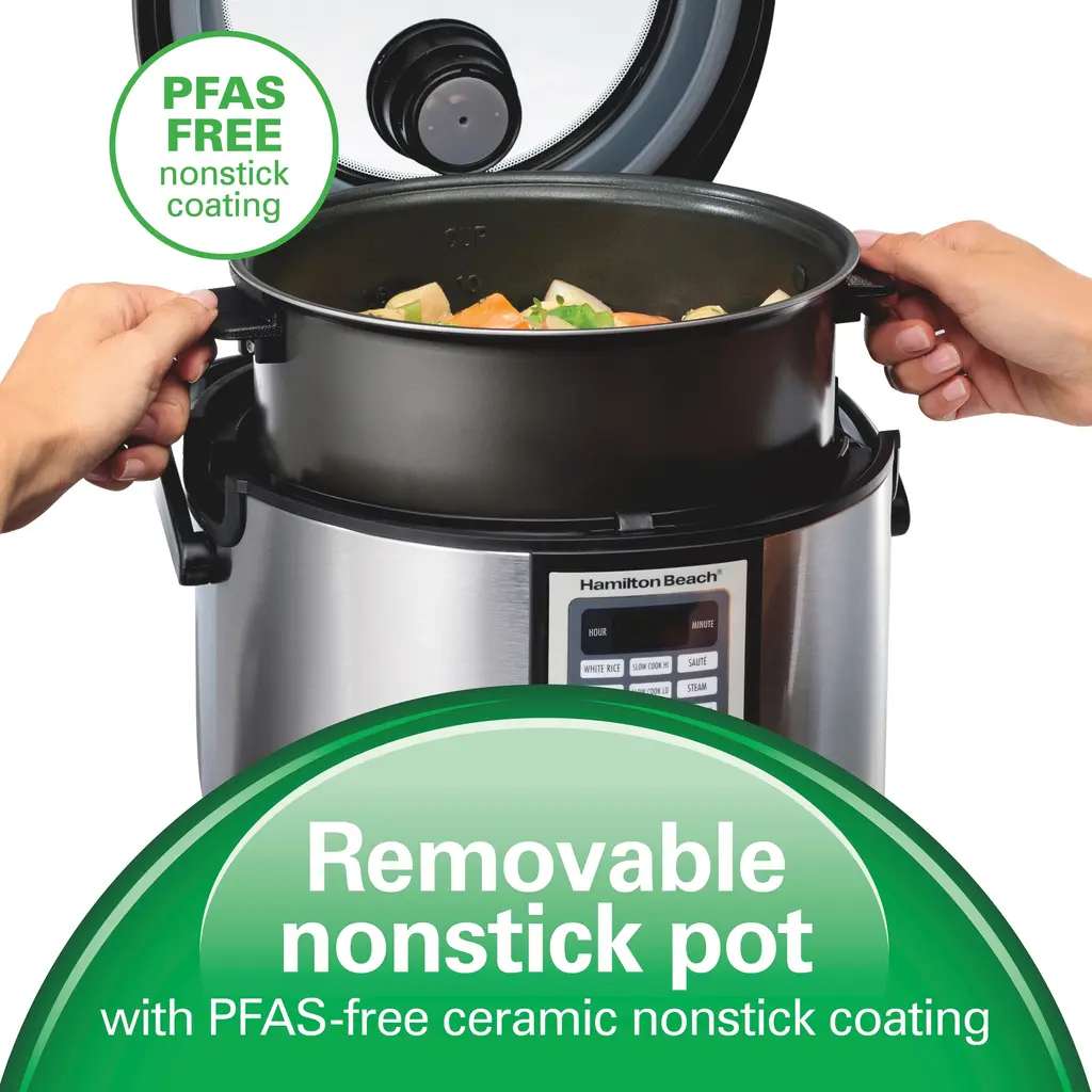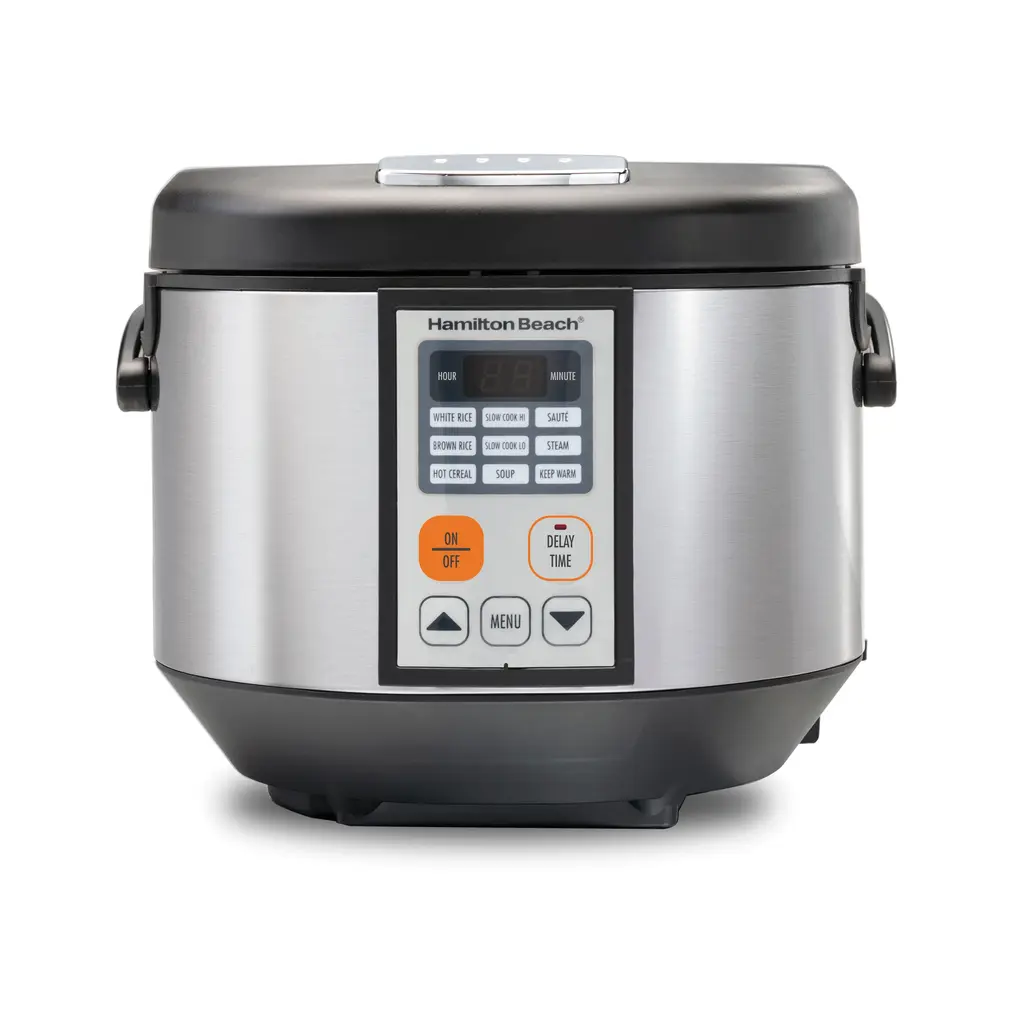 One cooker, endless possibilities. With a 4.5 quart capacity, the Hamilton Beach® Digital Multi Cooker combines the functions of a rice cooker, slow cooker, food steamer and more into a single compact appliance. Intuitive digital controls make switching between cooking methods effortless. Individual cook options make it easy to prepare white rice and brown rice plus hot cereals like oatmeal, grits and more. Low and high slow cook settings with steady and gradual heat offer the same results as a traditional slow cooker. Steam seafood, poultry or vegetables in the steam basket while rice or grains cook below, or steam them on their own. Sauté vegetables before adding grains for a risotto dish or simmer a batch of soup in time for family dinner. Glass lid lets you see your food and monitor the entire cooking process. Push-button digital controls makes switching between functions effortless. Includes Keep Warm and Delay Start options and a countdown timer. The removable pot with PFAS-free ceramic nonstick coating is dishwasher safe. Convenient handles help lift it from the base comfortably. A steaming basket, rice paddle and measuring cup are included in the box.