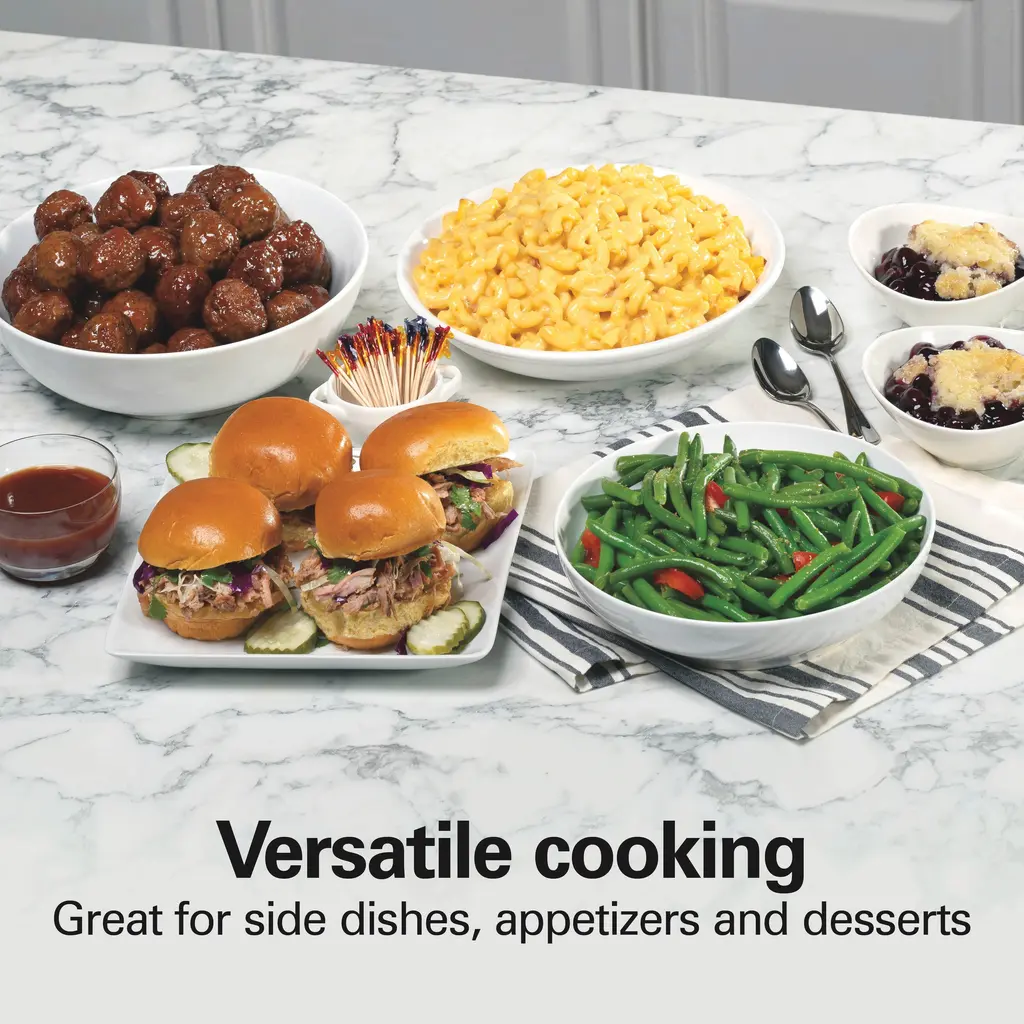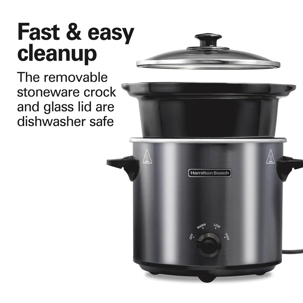 From chili and stews to savory, slow-cooked meats and rich pasta dishes, the Hamilton Beach® 4 Quart Round Slow Cooker is perfect for making easy, delicious one-pot meals. Simply add your ingredients, turn the dial to choose your setting and let the slow cooker do the rest. No watching needed. You'll get great results with minimal effort, whether you're new to cooking or a seasoned home chef. The slow cooker has a stoneware crock that can fit a variety of foods from vegetable dishes to lasagna to meat and poultry. It serves 4+ people and will hold up to a 4 lb. chicken, two 2 lb. roasts or 16 cups of macaroni and cheese. This versatile slow cooker is a great size for cooking sides, appetizers and desserts. Serve party meatballs and other appetizers right from the slow cooker while keeping food warm. Or enjoy delicious slow-baked desserts like fruit cobblers and cakes. Cook food on low or high and then switch to warm when cooking is complete to maintain the ideal temperature until you're ready to eat. The removable stoneware crock makes it easy to carry meals from the slow cooker to the table.
