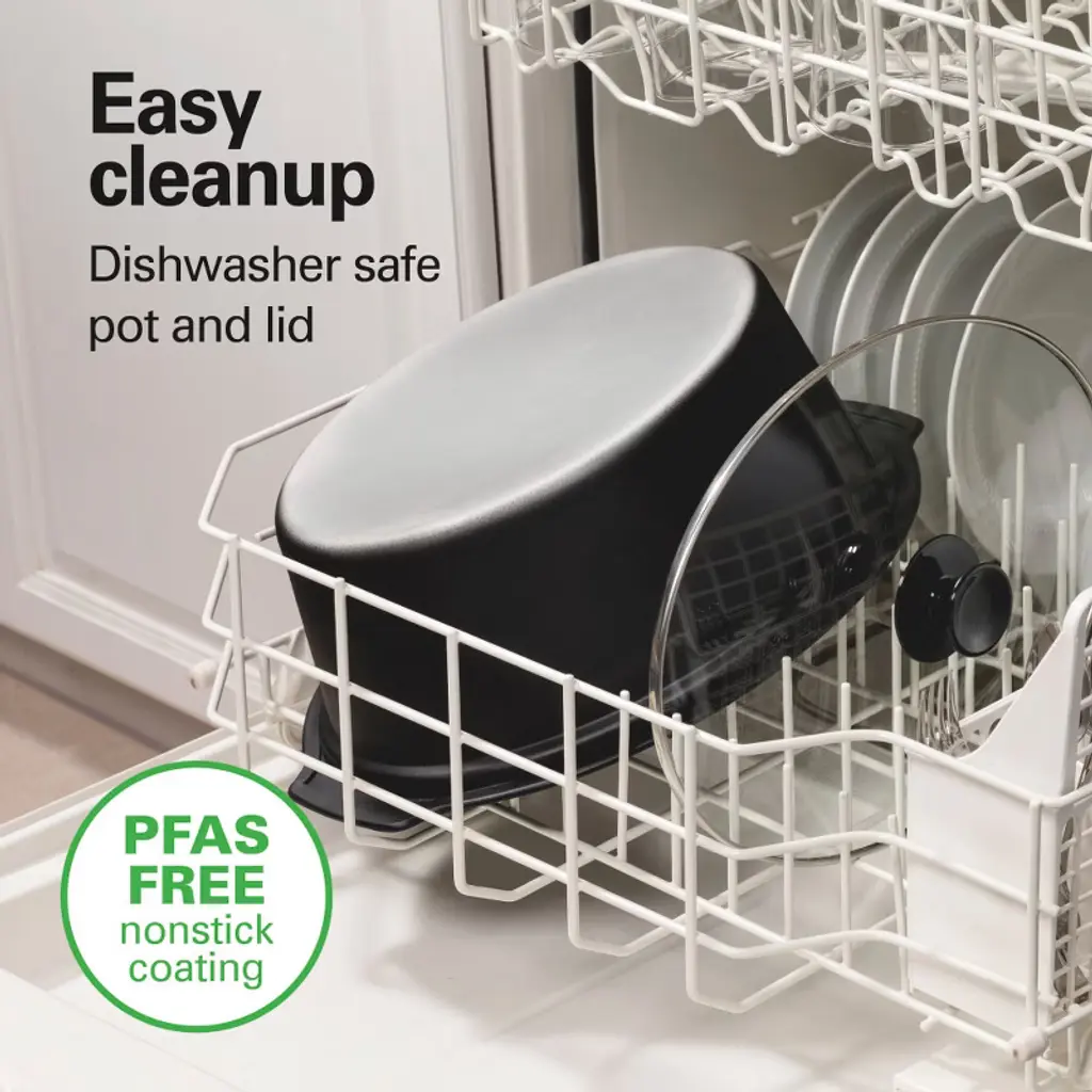 The Hamilton Beach Stovetop Sear & Cook slow cooker has everything you need to create homemade, delicious meals for 7 or more people. Sear meat on your stovetop to lock in flavor, and then finish the meal in the slow cooker. The removable pot with PFAS-free ceramic nonstick coating cooks directly on gas, electric or ceramic stovetops and is oven safe. Choose from 15 heating options with 2, 4, 6, 8 or 10 hours of cooking time and high, low, or warm heat settings. It lets you mix and match the temperature settings with your choice of cooking times. The 6 quart oval pot is the perfect size for a 6 lb. chicken or 4 lb. roast. Both the pot with PFAS-free ceramic nonstick coating and lid are dishwasher safe for easy cleanup.