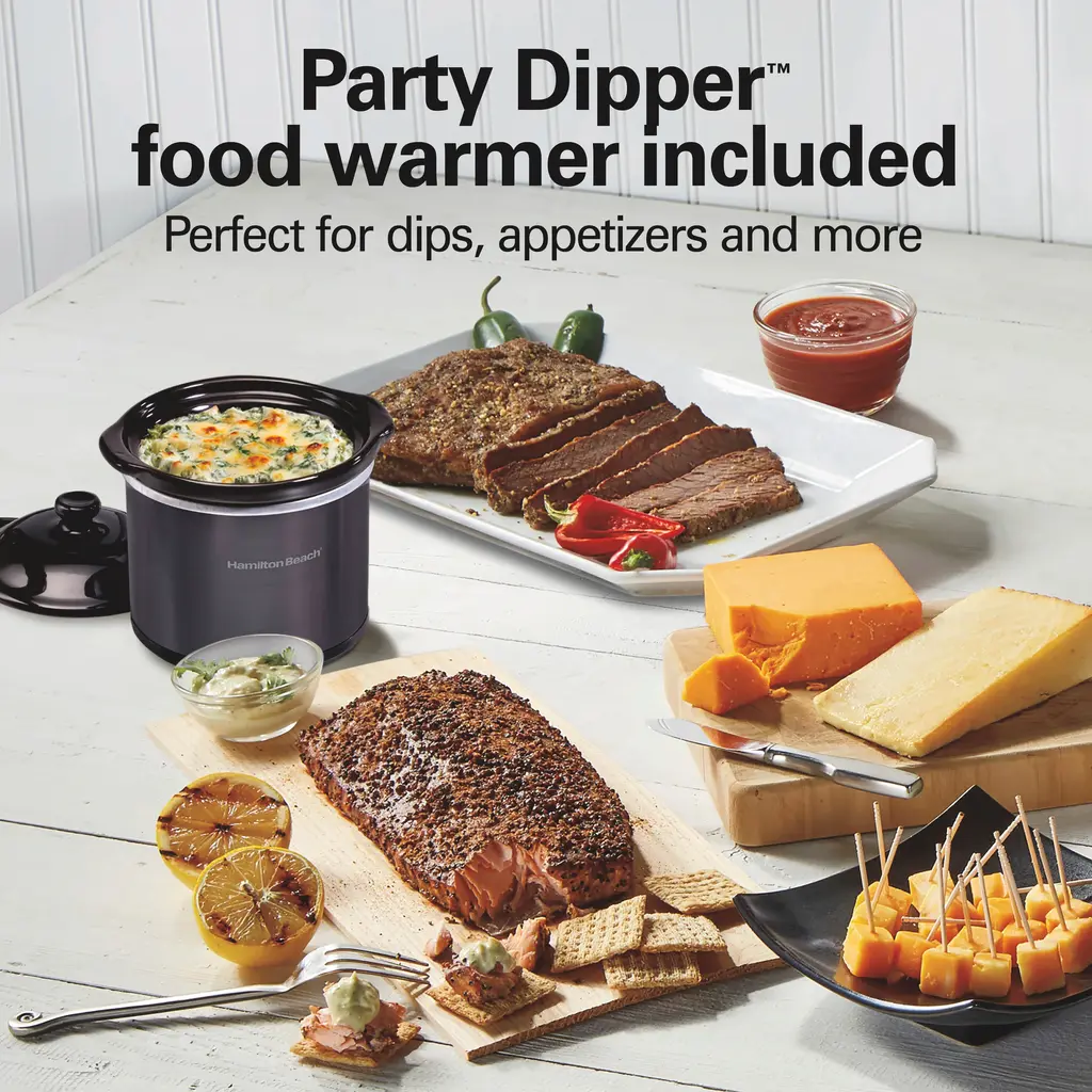 The Hamilton Beach® 7 Quart Programmable Stay or Go® Slow Cooker is the versatile go-to slow cooker that lets you cook all your family's favorite meals then easily them to family get-togethers and parties. The built-in clips hold the lid in place to prevent messy spills when handling the slow cooker or transporting food in your car. Mix and match warm, low or high heat settings with 5 cooking times — 2, 4, 6, 8 or 10 hours — for a total of 15 programmable cooking options. After cooking is complete, the slow cooker automatically switches to warm so you can set it and forget it. The slow cooker will hold a 7 lb. chicken, 5 lb. roast or enough barbecue for up to 30 sliders. It serves 8+ people and is perfect for family gatherings and entertaining. Cook one-pot meals like lasagna, homemade chili, beef stew and macaroni and cheese, or make meatball appetizers, vegetable side dishes and desserts like chocolate lava cake. The slow cooker includes a Party Dipper™ food warmer that's the perfect size for dips and appetizers. The removable stoneware crock and glass lid are both dishwasher safe for easy cleanup.