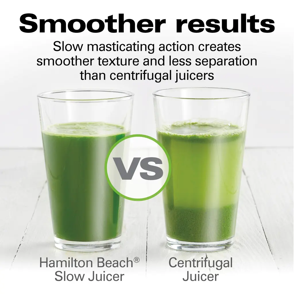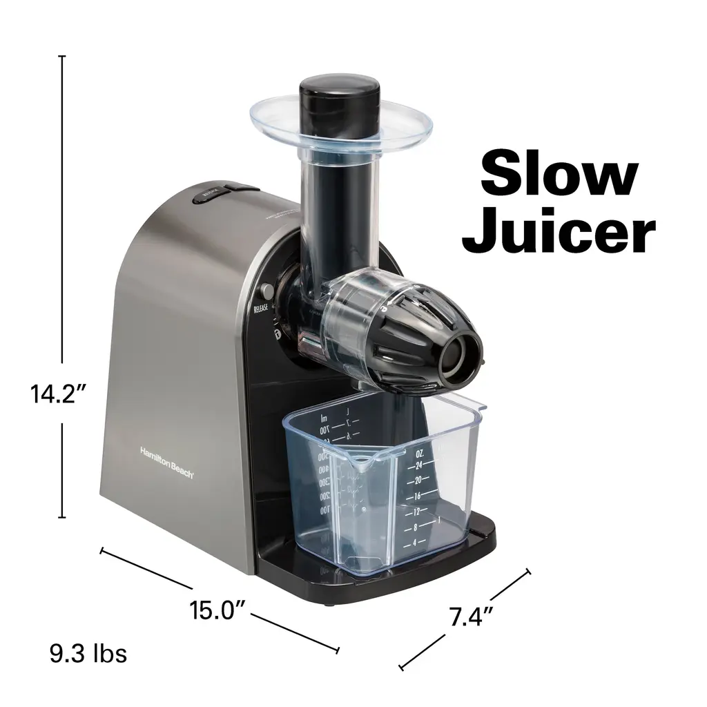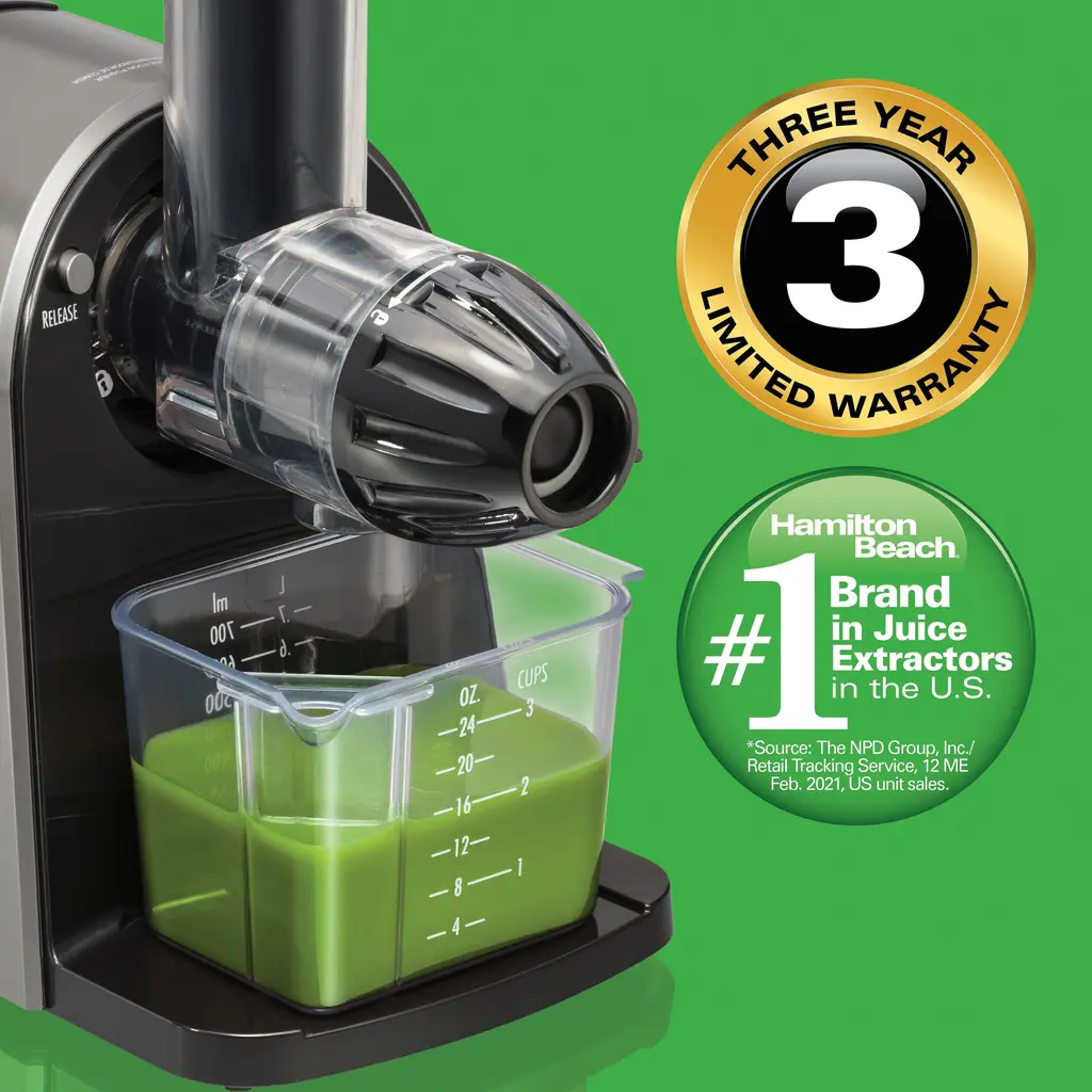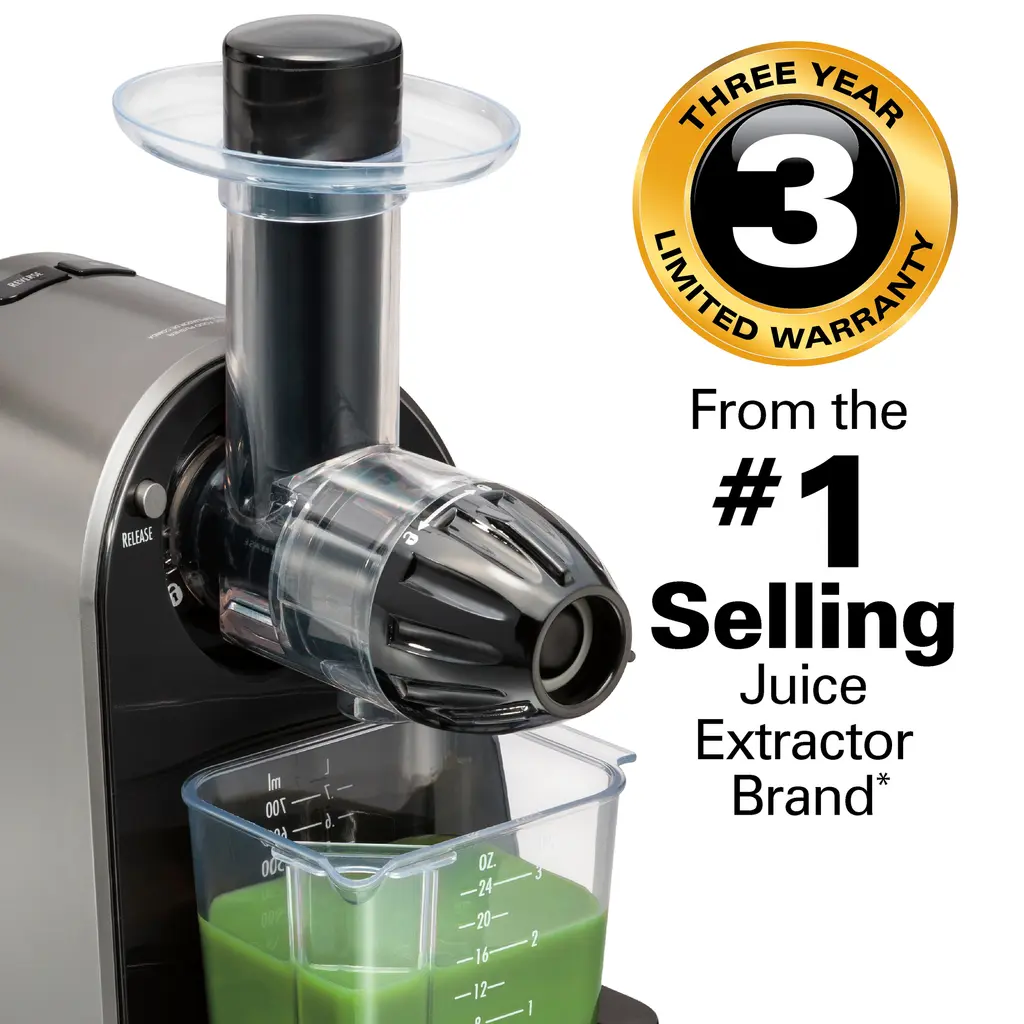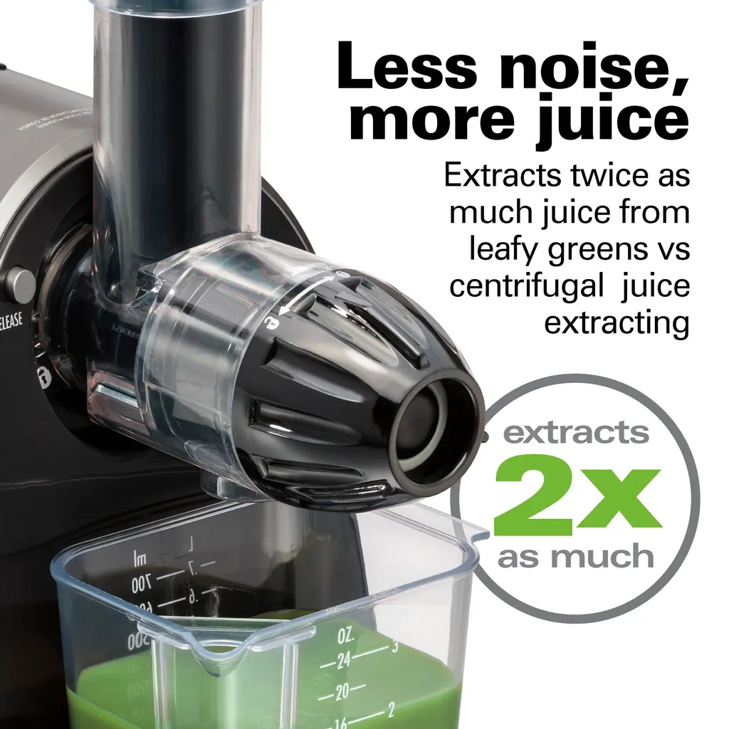 Enjoying fresh, healthy cold-pressed juice at home has never been easier. The Hamilton Beach® Slow Masticating Juicer transforms a wide variety of fruits and vegetables into nutritious juice. Cold-pressed juice tastes delicious and is a quick, easy way to get your recommended allowance of vitamins and minerals from vegetables like leafy greens and carrots or fruits like apples, grapes and citrus. The durable Tritan™* auger driven by a 150 watt motor crushes and squeezes produce at a slow speed to extract the maximum amount of juice with minimal noise. It extracts twice as much juice from leafy greens as centrifugal juicers. Slow masticating action also creates smoother texture and less separation than centrifugal juicers. The parts on the juicer easily rinse clean with no scrubbing required. The juicer comes with a convenient strainer cleaning brush, and dishwasher safe pulp bin, juice bowl, lid and pusher. The 24 oz. juice cup with froth separator keeps juice neatly contained and strains off the froth when pouring juice. The juicer is BPA free in food zones. The masticating juicer is backed by Hamilton Beach, America's #1 juice extractor brand,** with a 3 year limited warranty.