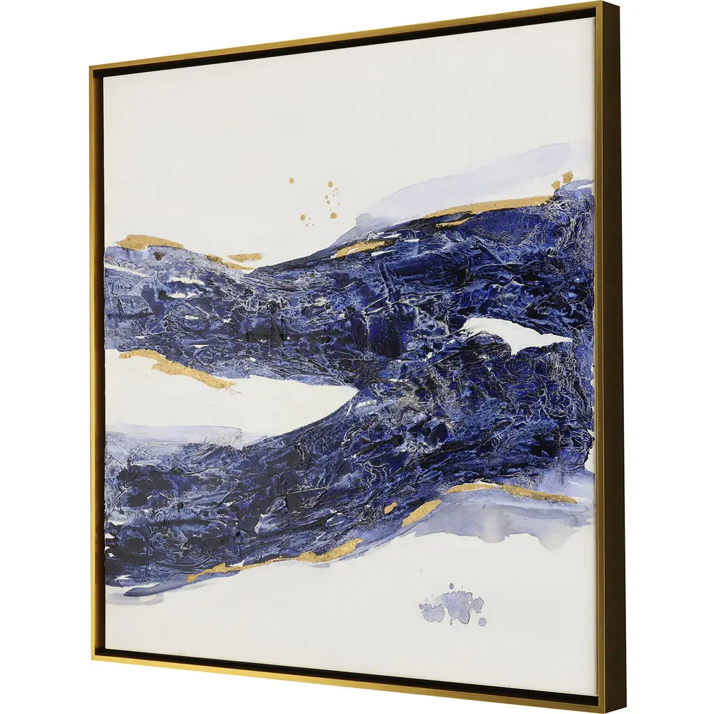 Exclusive hand painted canvas with gold leaf. Canvas is mounted in an antique gold wood floater frame.