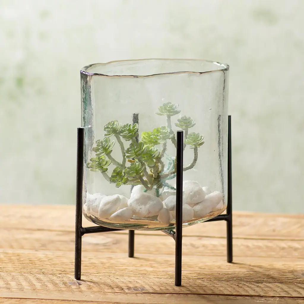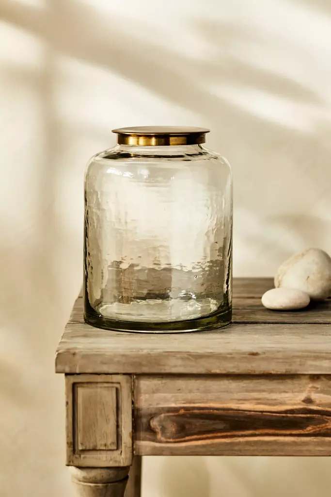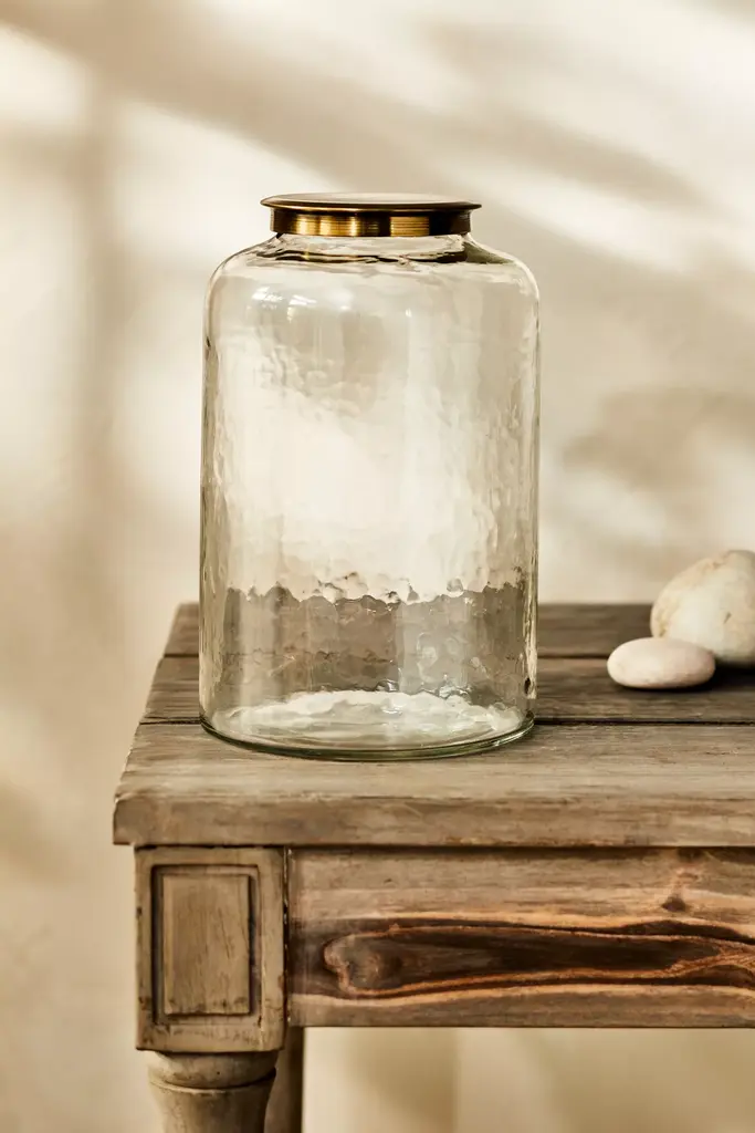 Grow your own garden under glass with this hammered glass terrarium. Arrives with a lid and with a roomy diameter to layer up rocks, shells, succulents, air plants and more.