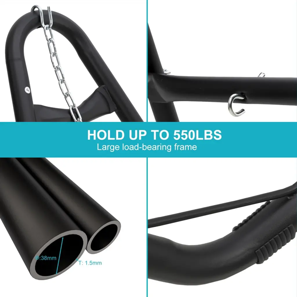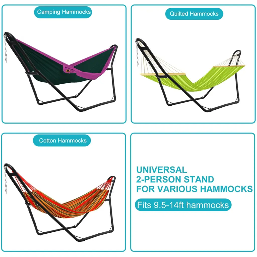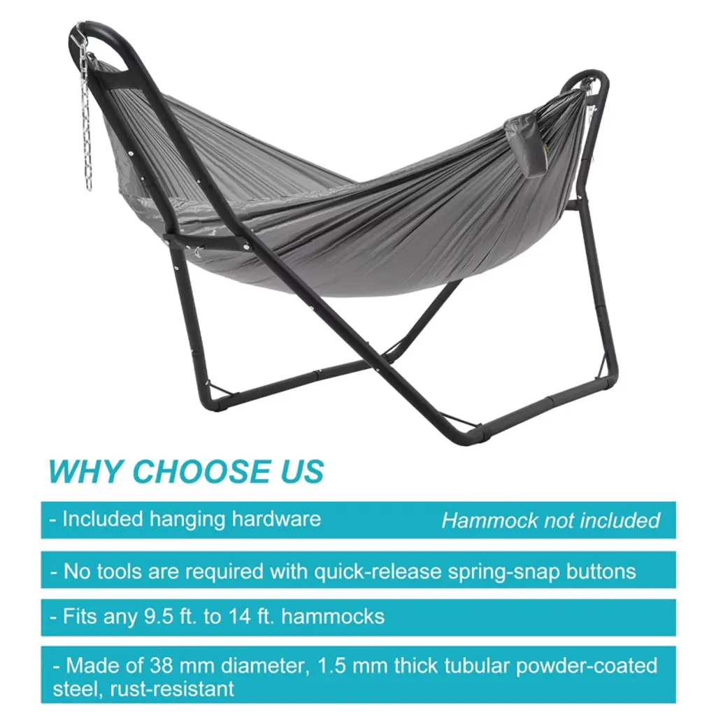 Introducing the ultimate Hammock Stand designed for comfort, durability, and versatility. This steel hammock frame fits all hammock styles including Mayan, Brazilian, camping, and spreader bar types, accommodating lengths from 9.5 to 14 feet. Perfect for two persons, it supports up to an impressive 550 lbs, making it ideal for relaxing alone or with a friend.Built to last, the stand features reinforced double rods and a triangular structure crafted from 1.5-inch tubular powder-coated steel. This robust construction ensures resistance to rust and wear, providing reliable support and longevity whether used indoors or outdoors.Customize your relaxation with three hanging options that allow easy adjustments to hammock tightness and height using the included adjustable chains. Assembly is quick and tool-free thanks to the snap-on design, enabling setup in approximately 10 minutes. For convenience, it includes a 600D Oxford fabric storage bag, two 3-inch S-hooks, two heavy-gauge hanging hooks, four plastic feet, and two 18-inch chains.This lightweight and portable hammock stand is perfect for any location—from your backyard, patio, or deck to indoor spaces like sunrooms. It’s an excellent solution when trees aren’t available for hanging your hammock, making it your go-to frame for camping trips or outdoor leisure.Elevate your relaxation experience with this versatile, sturdy, and easy-to-use hammock stand built to support your comfort wherever you choose to unwind.