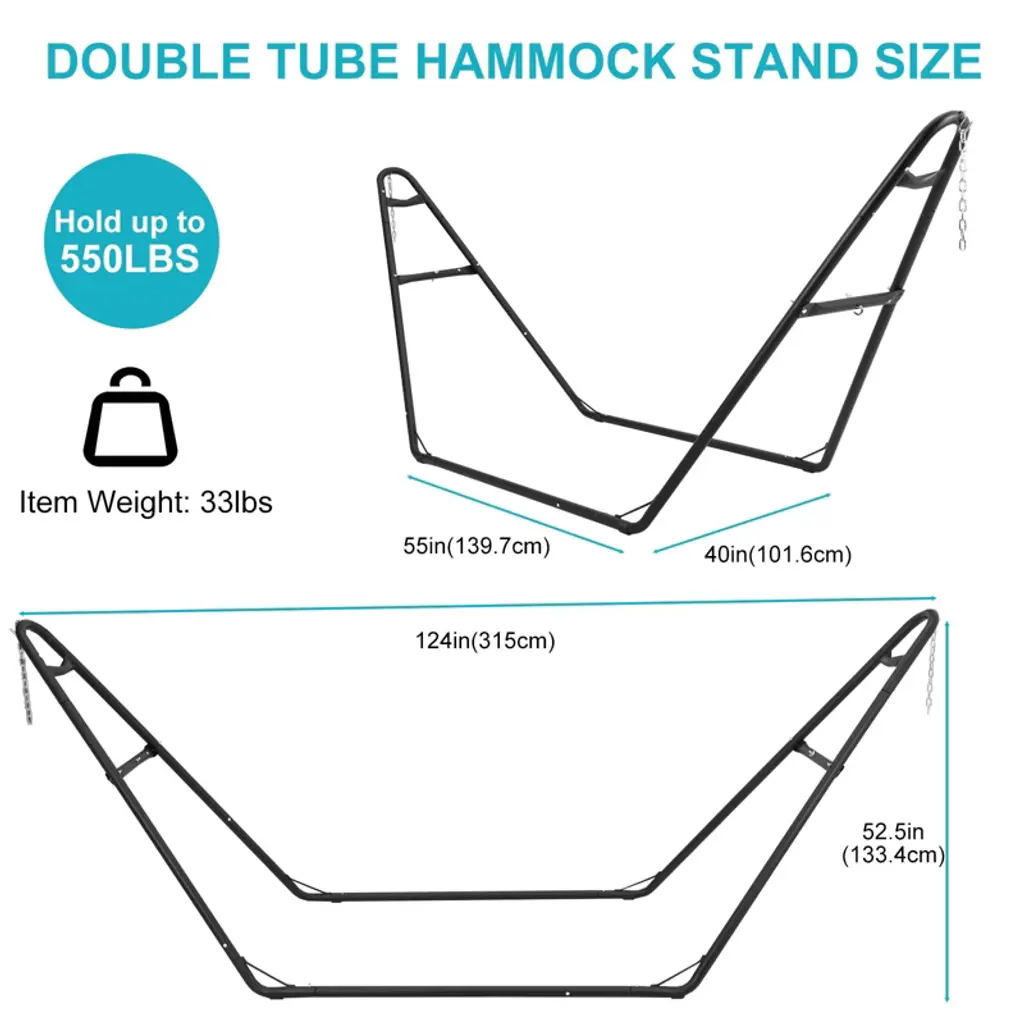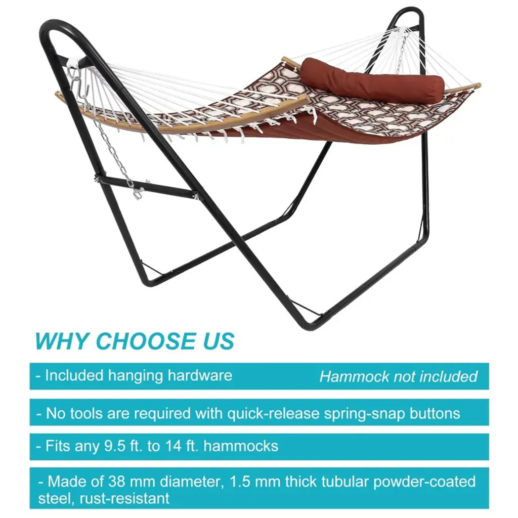 Introducing the ultimate Hammock Stand designed for comfort, durability, and versatility. This steel hammock frame fits all hammock styles including Mayan, Brazilian, camping, and spreader bar types, accommodating lengths from 9.5 to 14 feet. Perfect for two persons, it supports up to an impressive 550 lbs, making it ideal for relaxing alone or with a friend.Built to last, the stand features reinforced double rods and a triangular structure crafted from 1.5-inch tubular powder-coated steel. This robust construction ensures resistance to rust and wear, providing reliable support and longevity whether used indoors or outdoors.Customize your relaxation with three hanging options that allow easy adjustments to hammock tightness and height using the included adjustable chains. Assembly is quick and tool-free thanks to the snap-on design, enabling setup in approximately 10 minutes. For convenience, it includes a 600D Oxford fabric storage bag, two 3-inch S-hooks, two heavy-gauge hanging hooks, four plastic feet, and two 18-inch chains.This lightweight and portable hammock stand is perfect for any location—from your backyard, patio, or deck to indoor spaces like sunrooms. It’s an excellent solution when trees aren’t available for hanging your hammock, making it your go-to frame for camping trips or outdoor leisure.Elevate your relaxation experience with this versatile, sturdy, and easy-to-use hammock stand built to support your comfort wherever you choose to unwind.