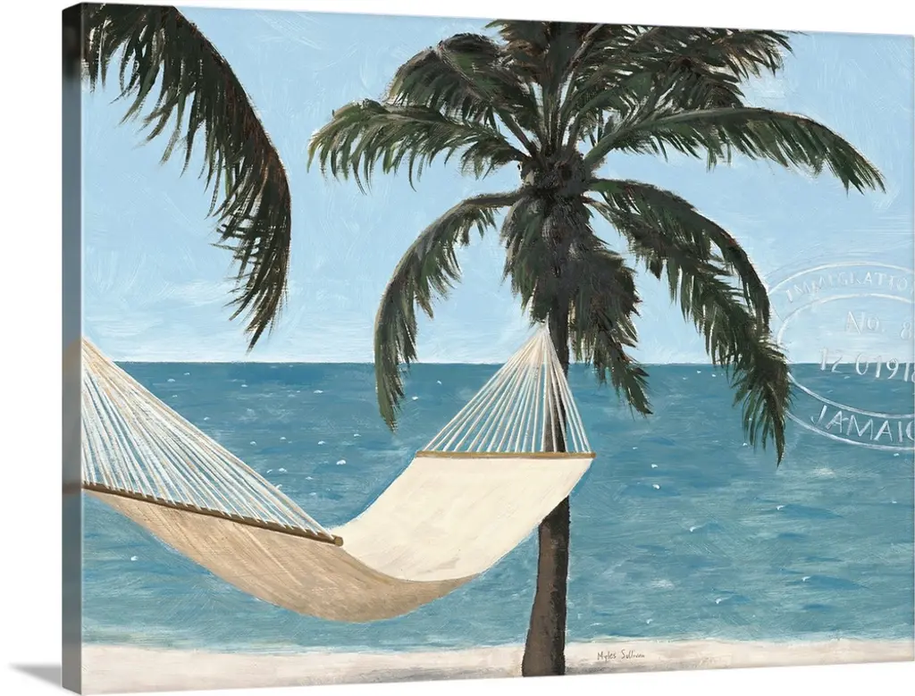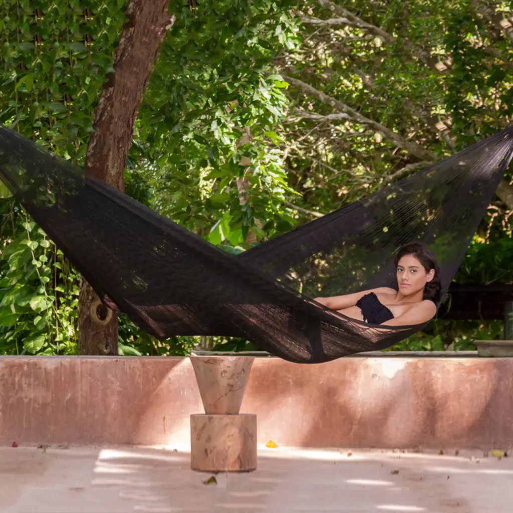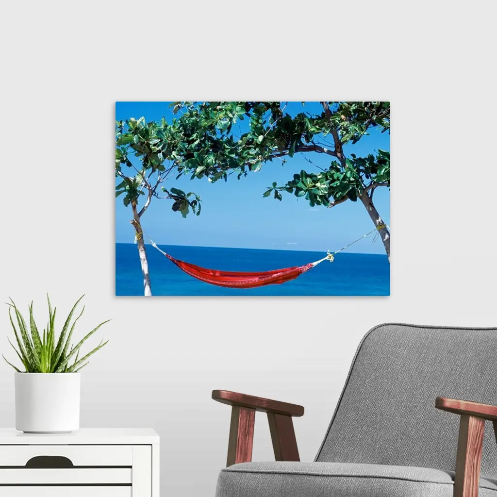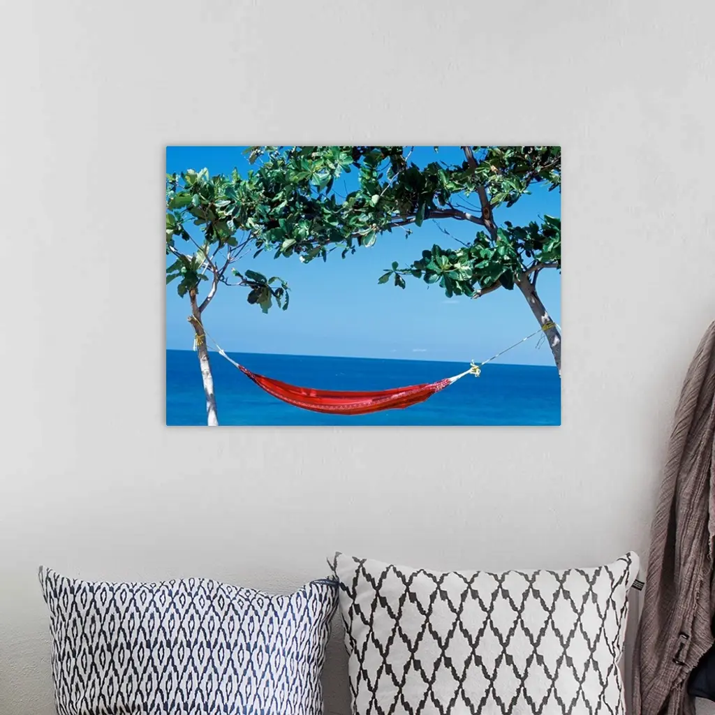 A hammock is tied up between two small trees with a beautiful ocean view behind it.