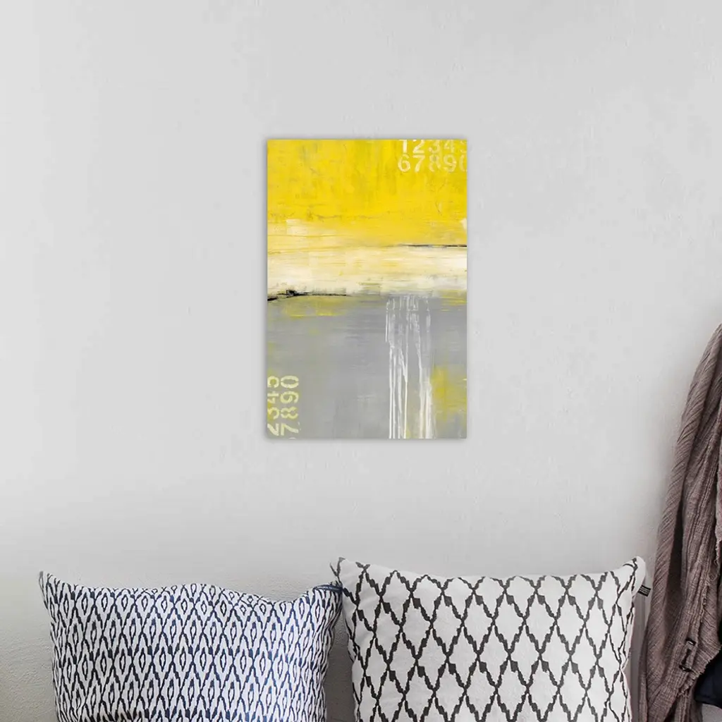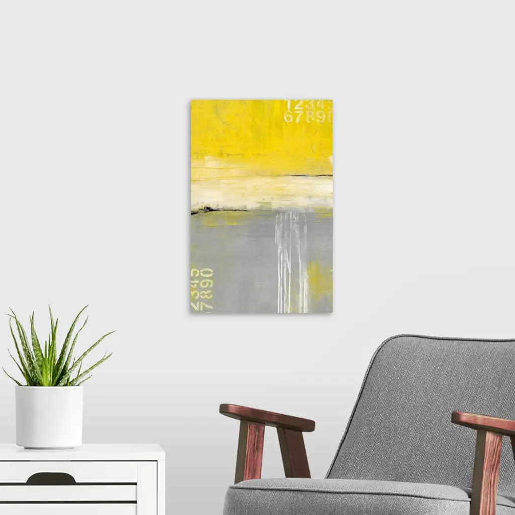 Large abstract art uses different sized horizontal rectangles to generate movement. In the corners of the piece you can see numbers clearly displayed.